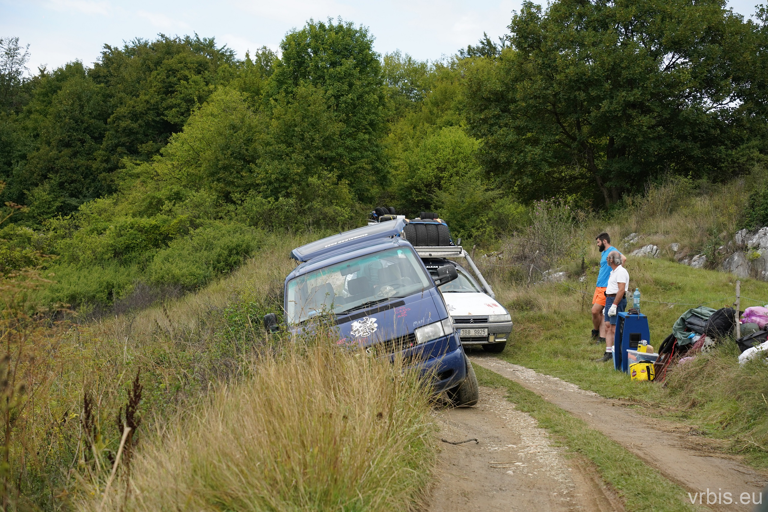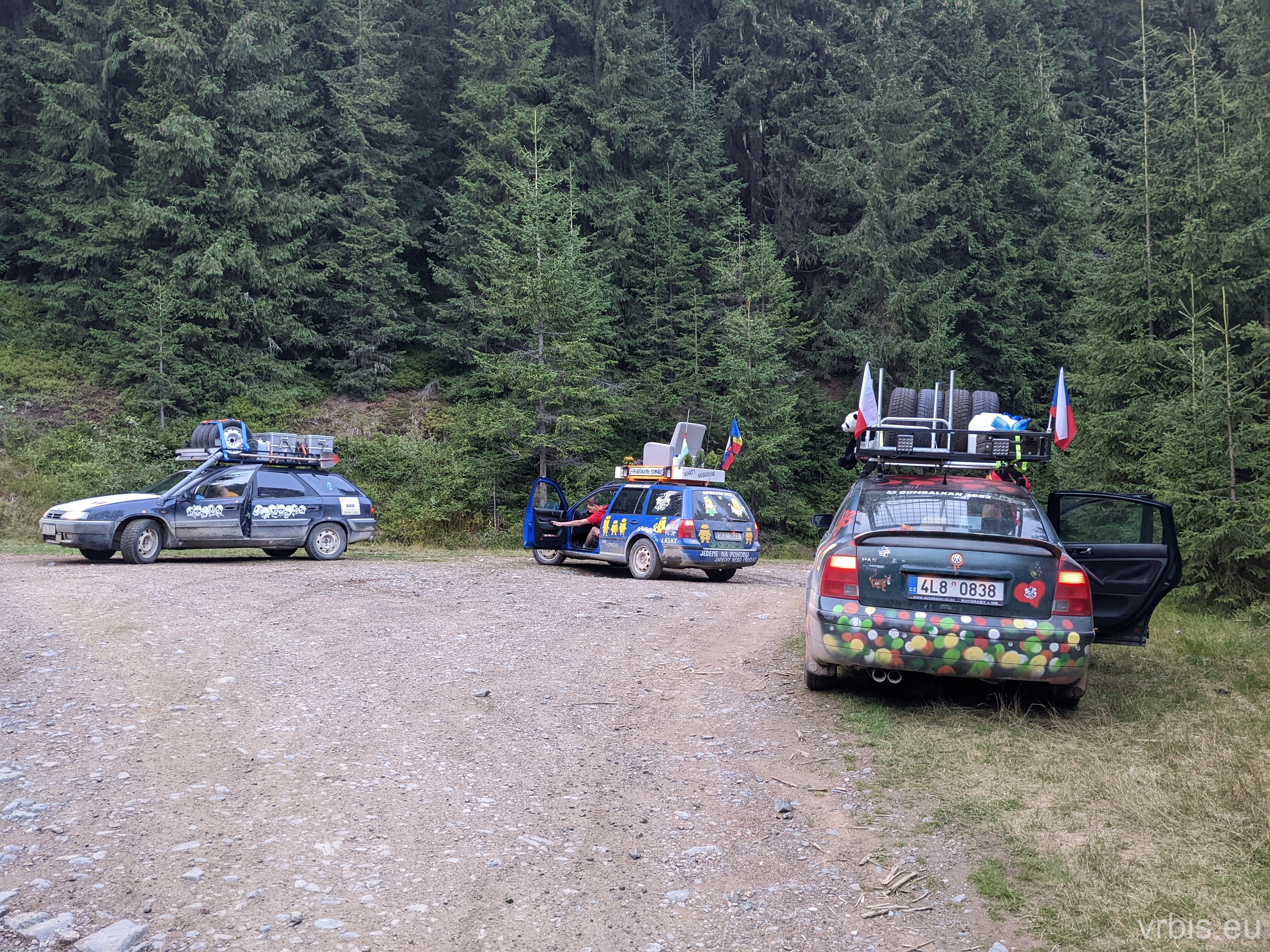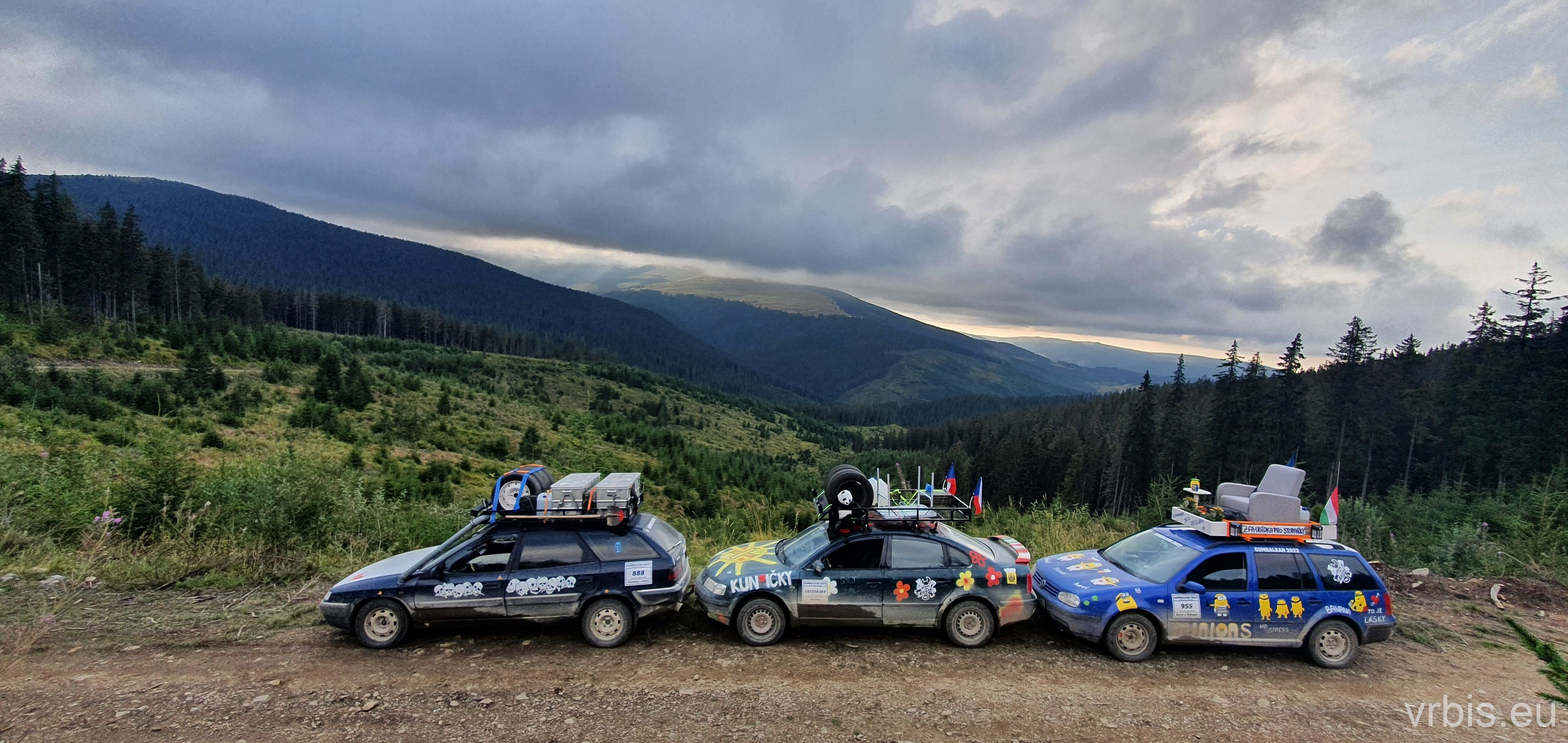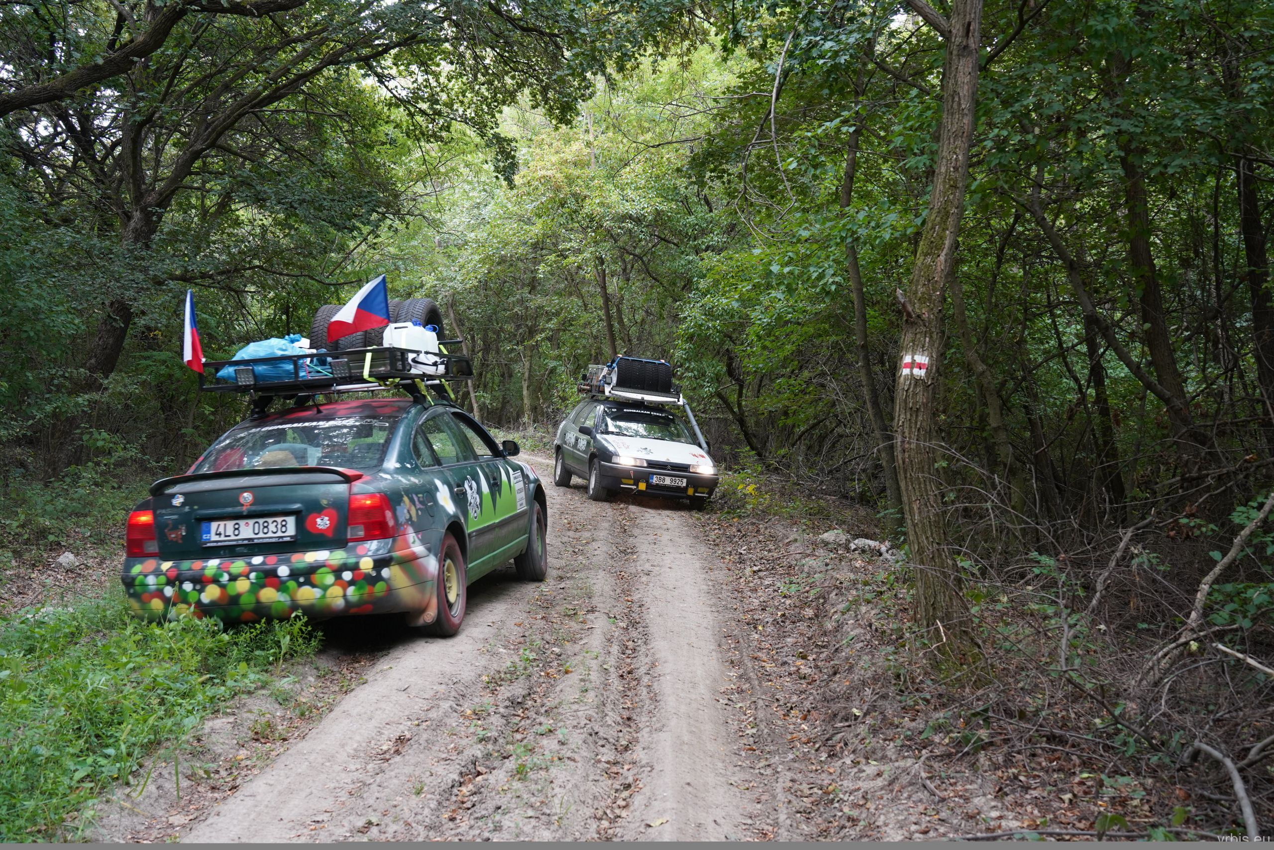 Po obědě a opravě pokračujeme lesní cestou dál. Vše se nese v poklidném duchu až do místa kde se cesta začíná svažovat z kopce. Je to opak toho co jsme předtím jeli nahoru, jen v horším stavu. Cesta jsou vlastně jen dvě rýhy vymleté od vody a traktoru, které jsou tak hluboké, že vjetí do nich by mohlo být osudné. S auty balancujeme na zbytcích původní cesty, je to jako jízda na kolejích. Volba správné stopy je klíčová. Michal se s Mimoněm vyhýbá výmolu a najíždí bokem auta na svah, tak že už to vypadlo že se převrátí na bok. Ale vše dobře dopadlo. Nejednou se auta při přejíždění mezi výmoly pohupují jen na dvou kolech. Když se dostáváme dolů, potkáváme několik dalších posádek, které si tuhle cestu vybrali směrem nahoru. Nezbývá něž jim popřát hodně štěstí. Težko říct, která z cest je horší… 😀