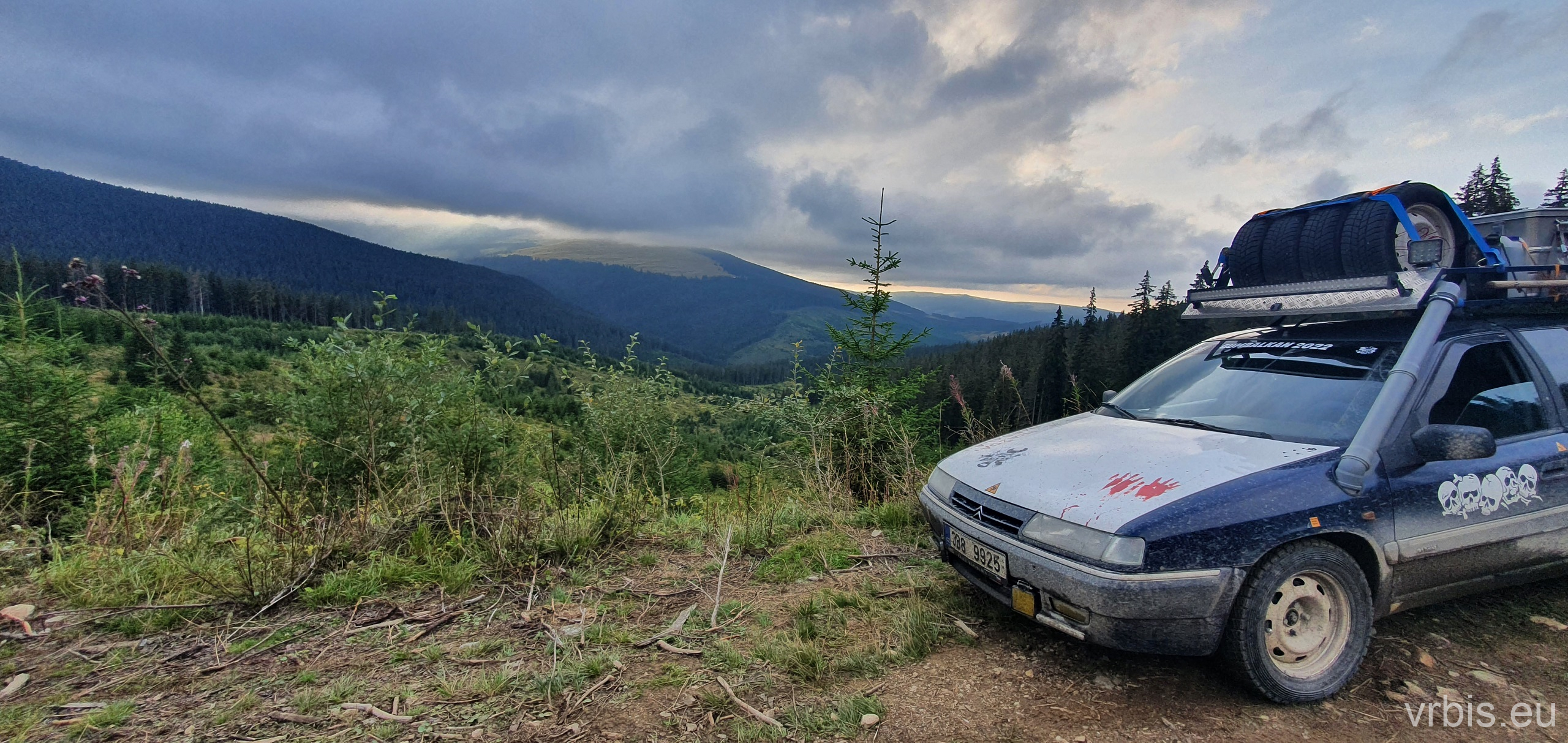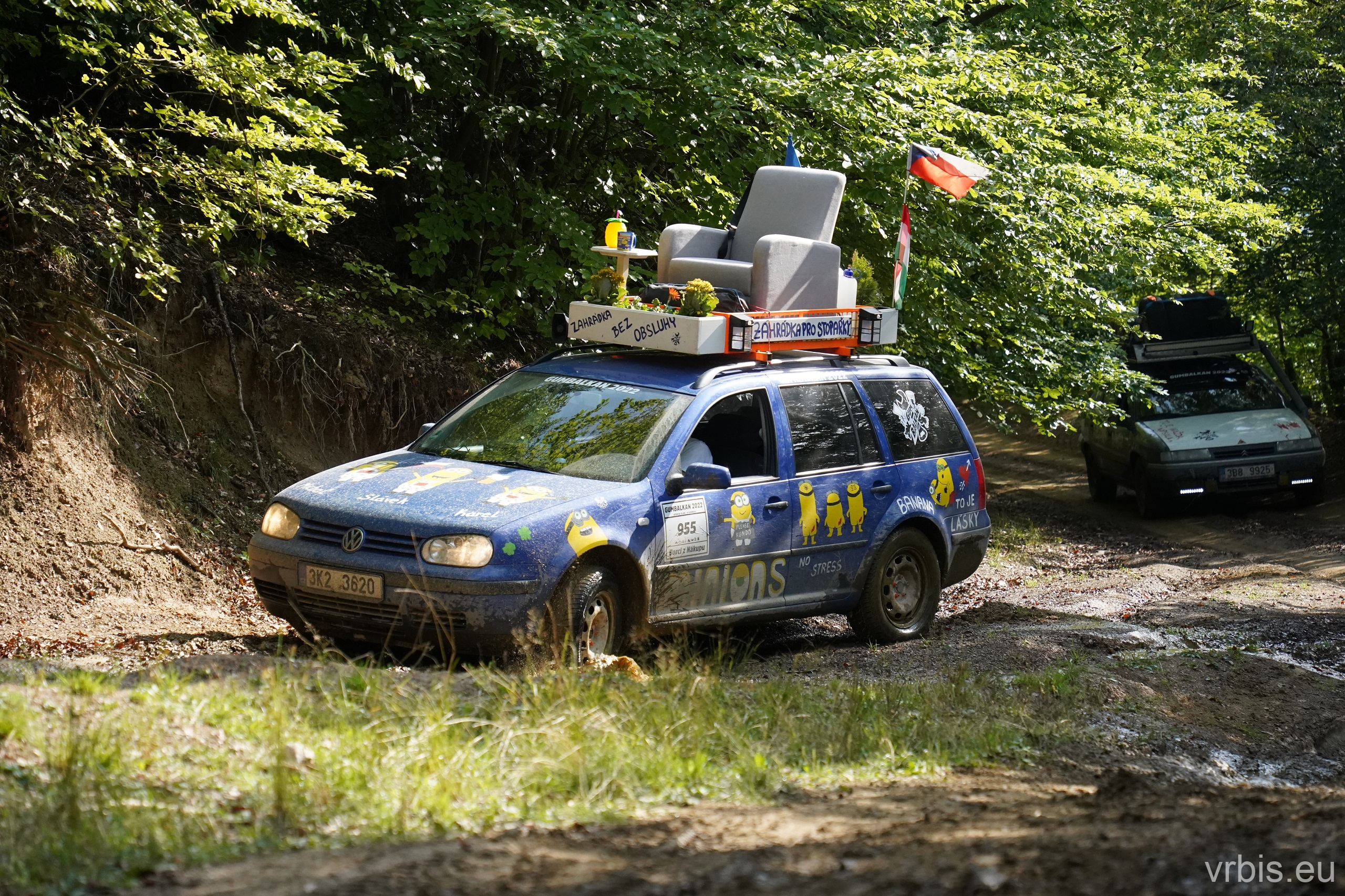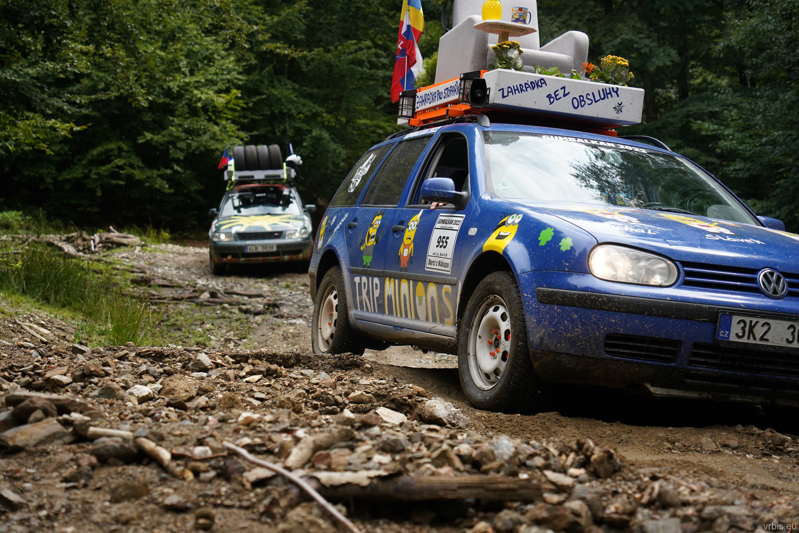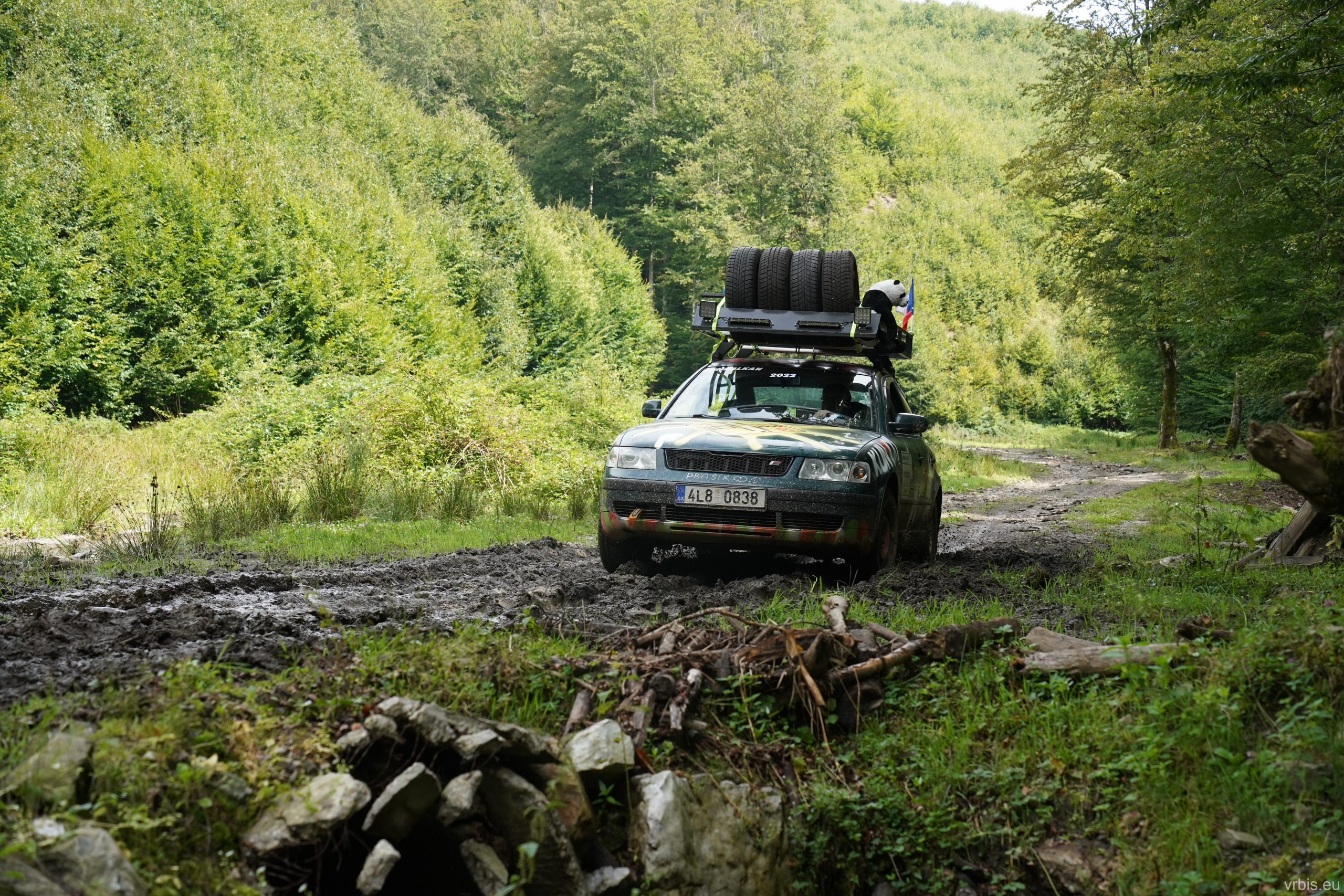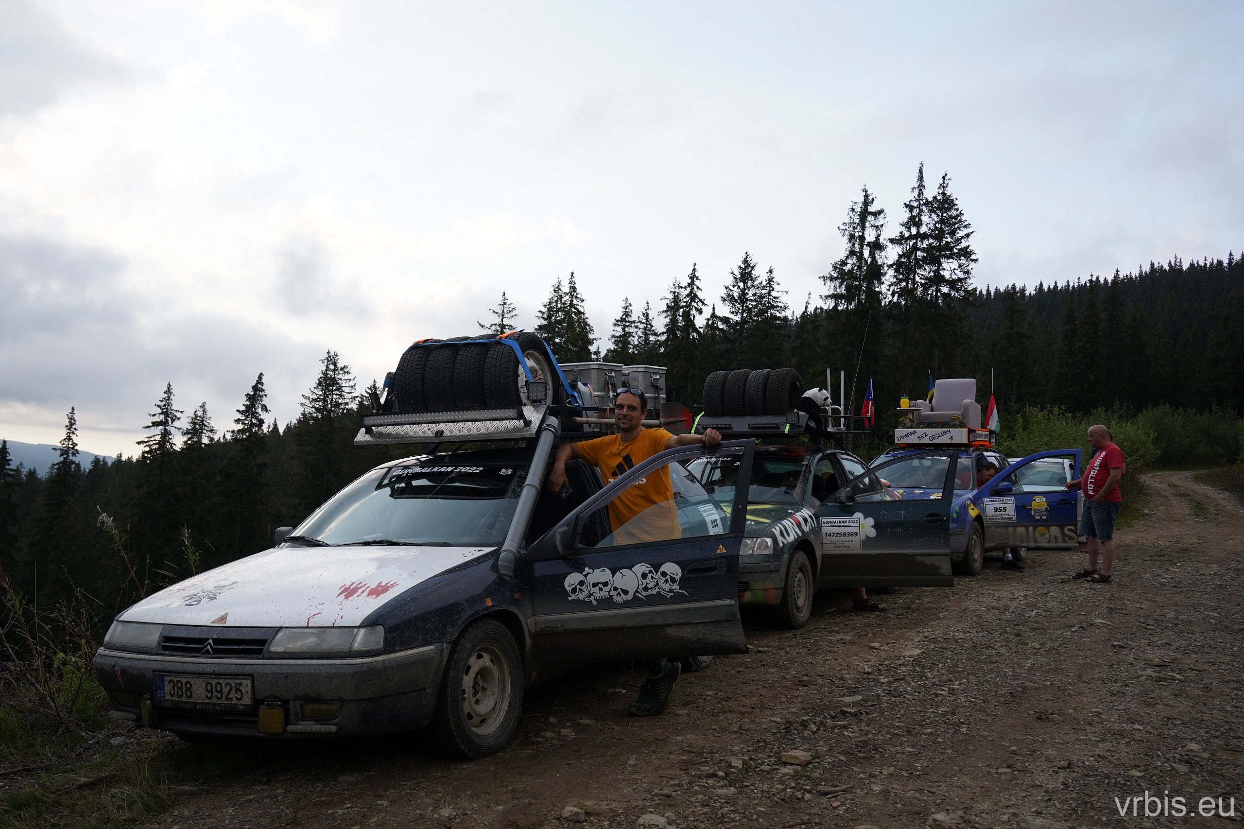 Po obědě a opravě pokračujeme lesní cestou dál. Vše se nese v poklidném duchu až do místa kde se cesta začíná svažovat z kopce. Je to opak toho co jsme předtím jeli nahoru, jen v horším stavu. Cesta jsou vlastně jen dvě rýhy vymleté od vody a traktoru, které jsou tak hluboké, že vjetí do nich by mohlo být osudné. S auty balancujeme na zbytcích původní cesty, je to jako jízda na kolejích. Volba správné stopy je klíčová. Michal se s Mimoněm vyhýbá výmolu a najíždí bokem auta na svah, tak že už to vypadlo že se převrátí na bok. Ale vše dobře dopadlo. Nejednou se auta při přejíždění mezi výmoly pohupují jen na dvou kolech. Když se dostáváme dolů, potkáváme několik dalších posádek, které si tuhle cestu vybrali směrem nahoru. Nezbývá něž jim popřát hodně štěstí. Težko říct, která z cest je horší… 😀