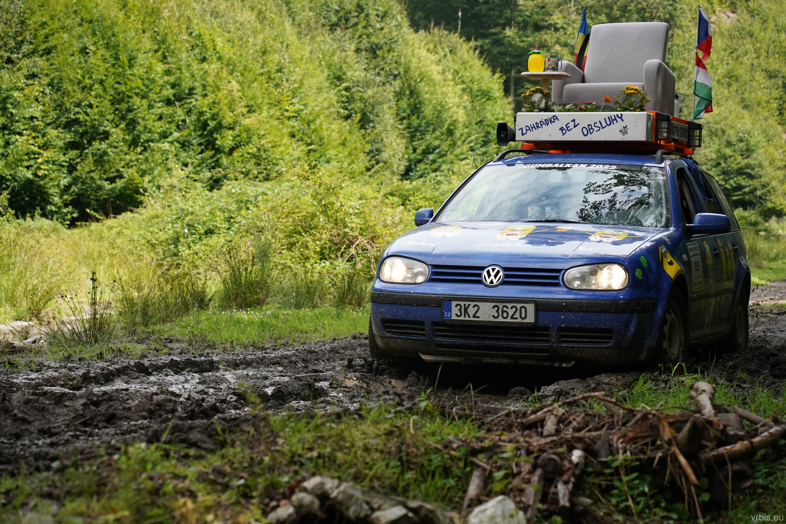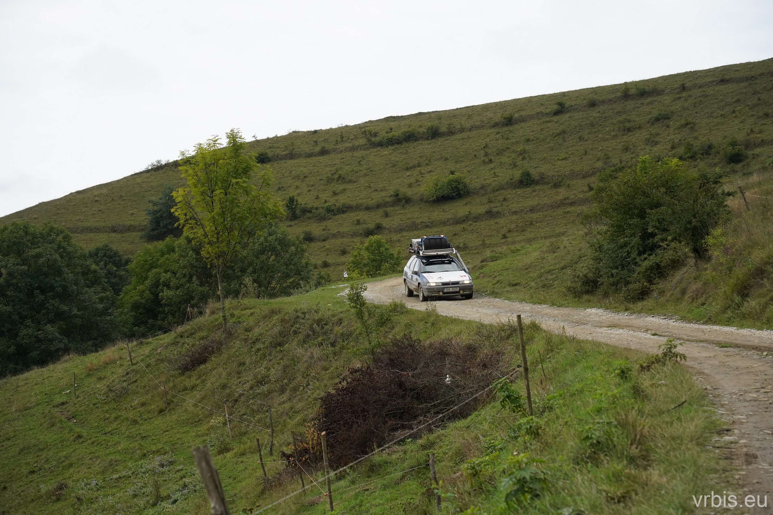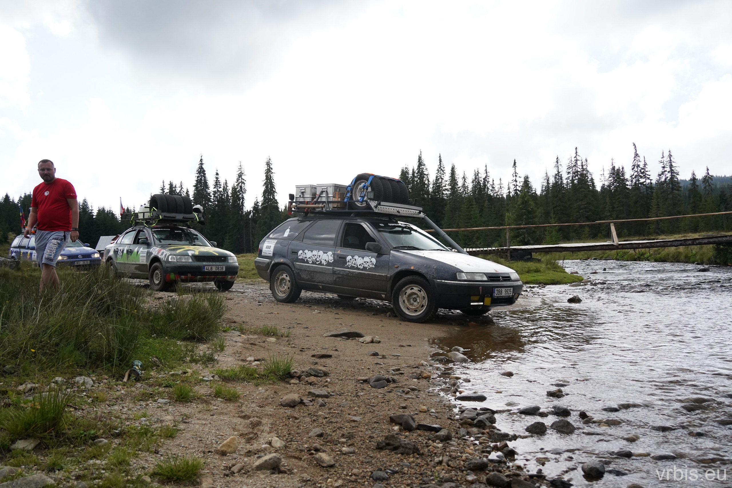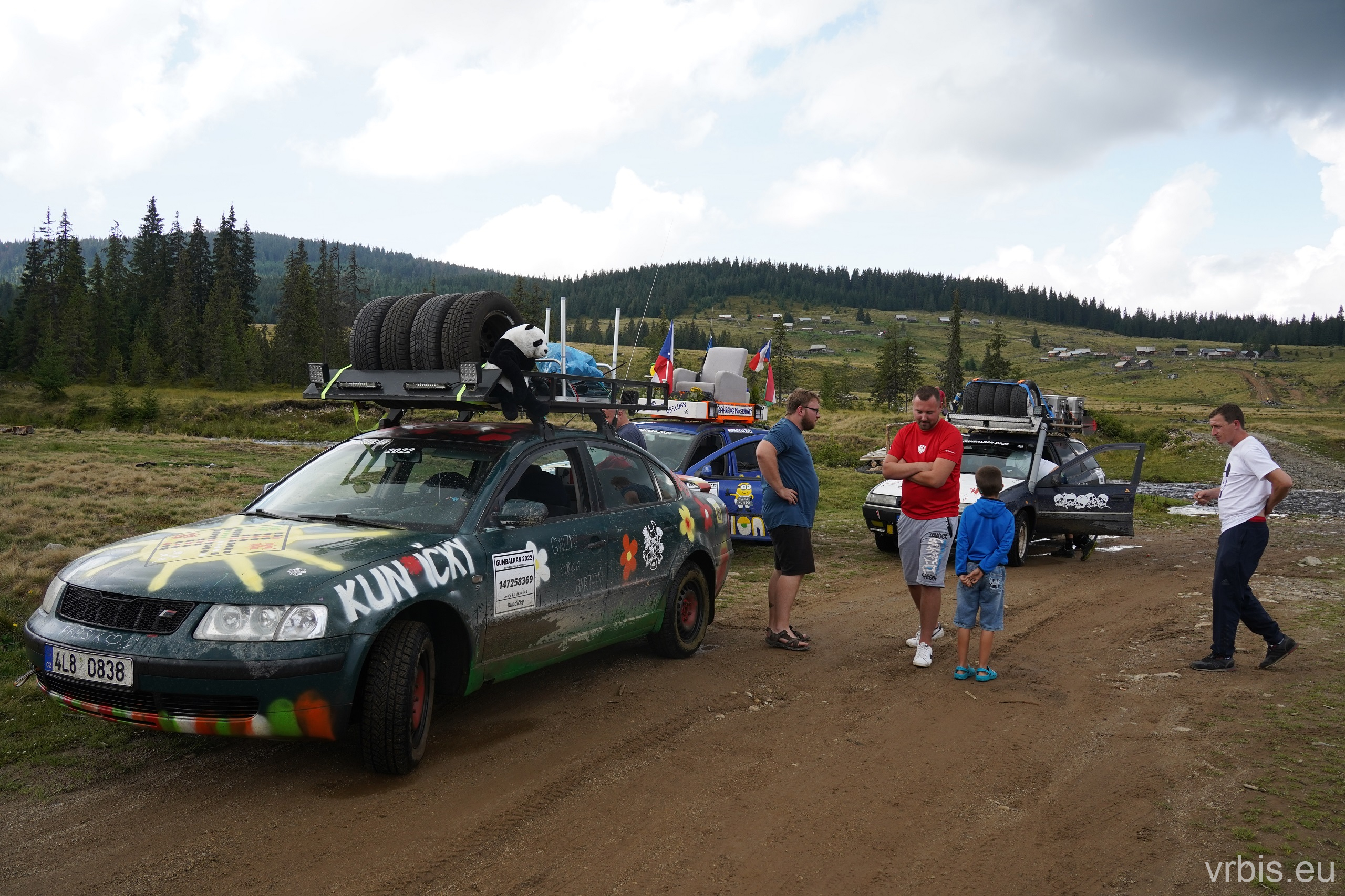 Po obědě a opravě pokračujeme lesní cestou dál. Vše se nese v poklidném duchu až do místa kde se cesta začíná svažovat z kopce. Je to opak toho co jsme předtím jeli nahoru, jen v horším stavu. Cesta jsou vlastně jen dvě rýhy vymleté od vody a traktoru, které jsou tak hluboké, že vjetí do nich by mohlo být osudné. S auty balancujeme na zbytcích původní cesty, je to jako jízda na kolejích. Volba správné stopy je klíčová. Michal se s Mimoněm vyhýbá výmolu a najíždí bokem auta na svah, tak že už to vypadlo že se převrátí na bok. Ale vše dobře dopadlo. Nejednou se auta při přejíždění mezi výmoly pohupují jen na dvou kolech. Když se dostáváme dolů, potkáváme několik dalších posádek, které si tuhle cestu vybrali směrem nahoru. Nezbývá něž jim popřát hodně štěstí. Težko říct, která z cest je horší… 😀