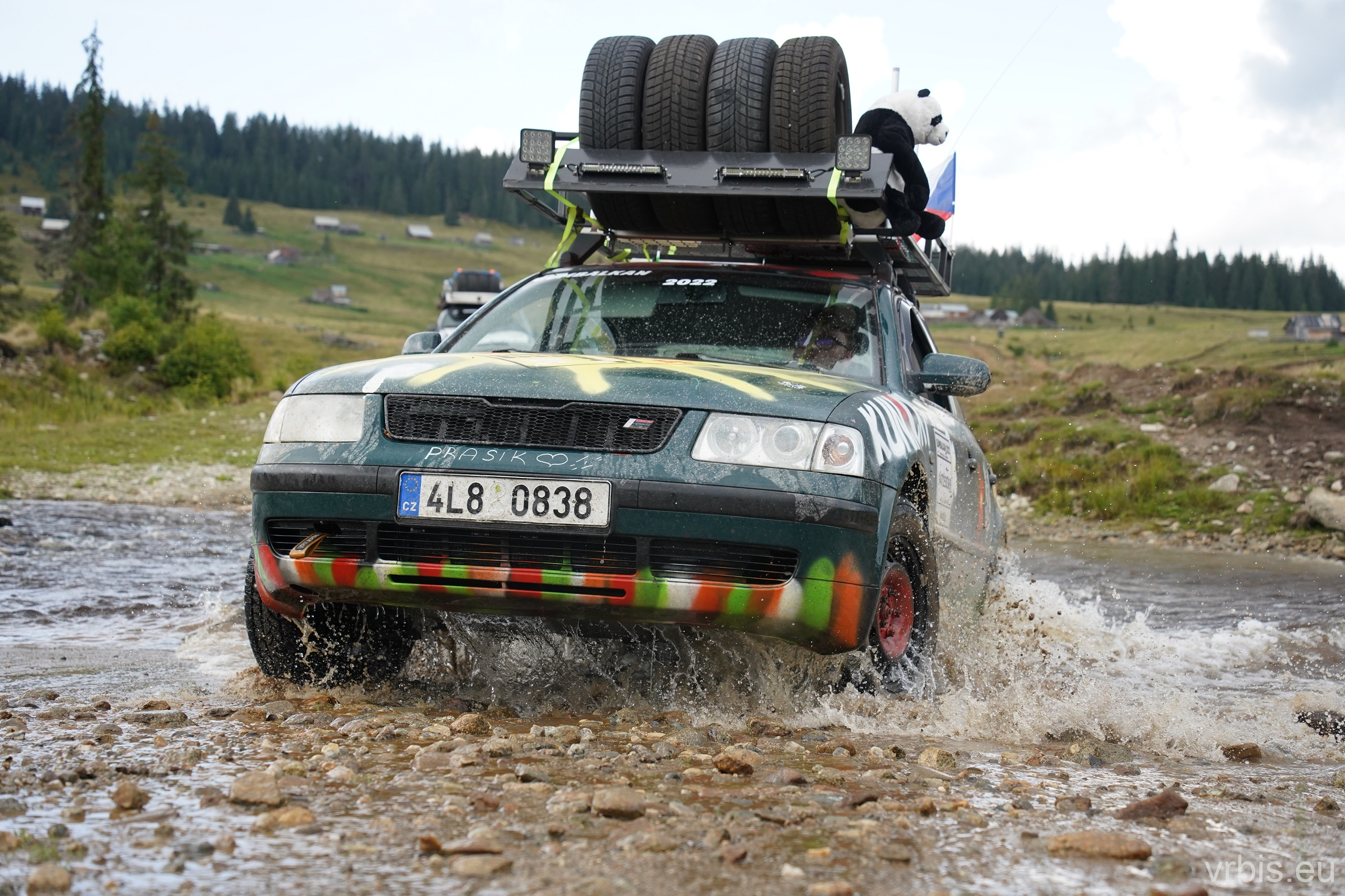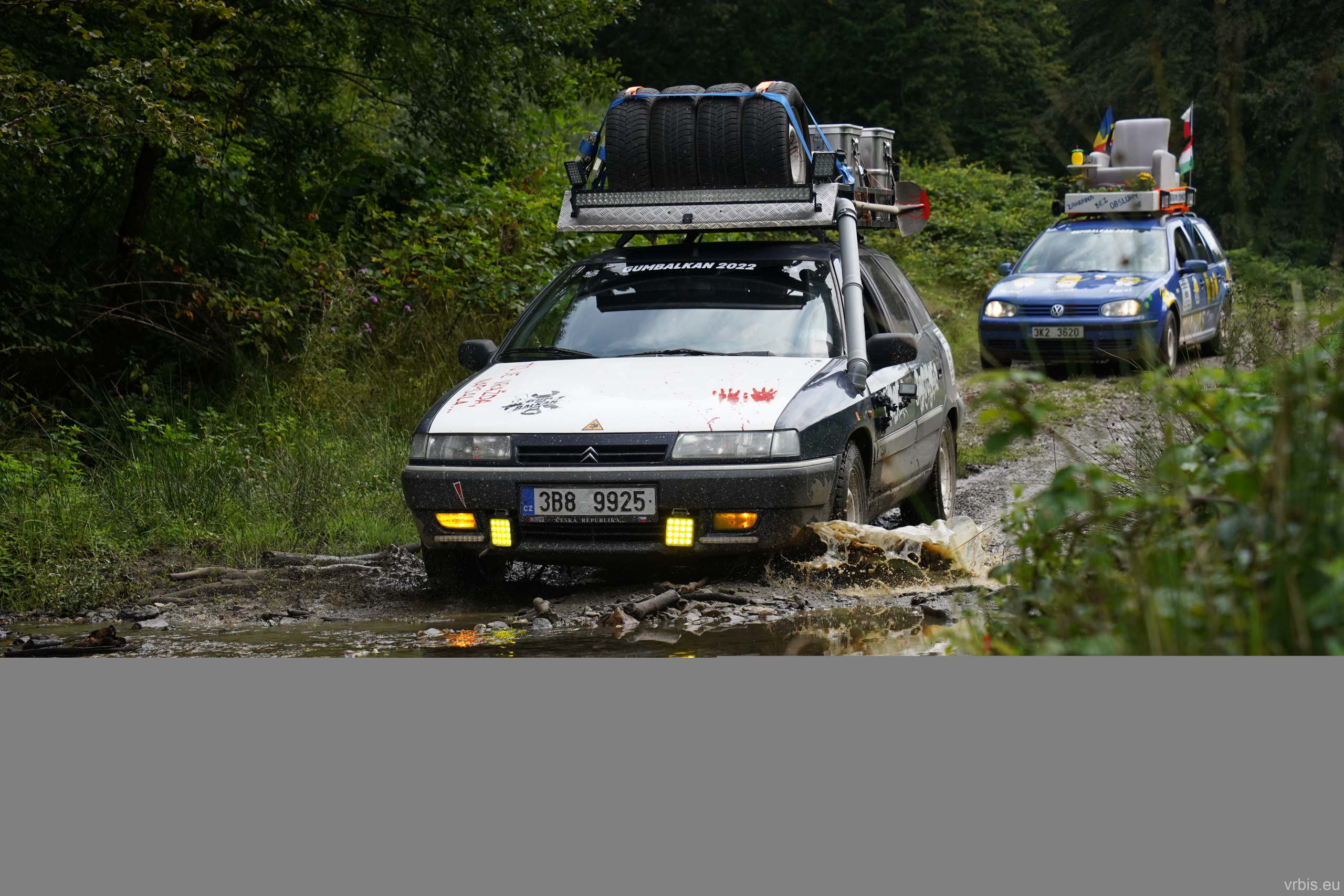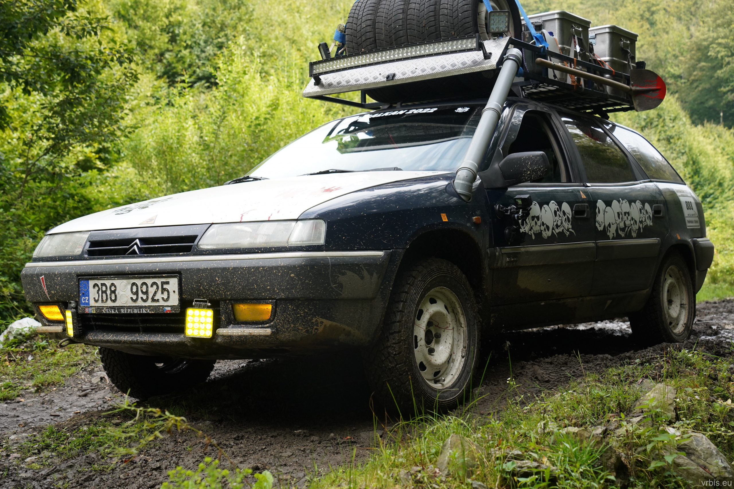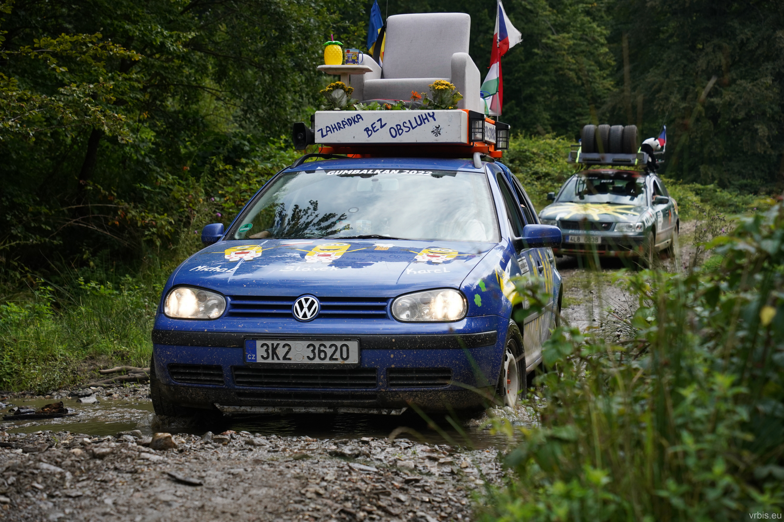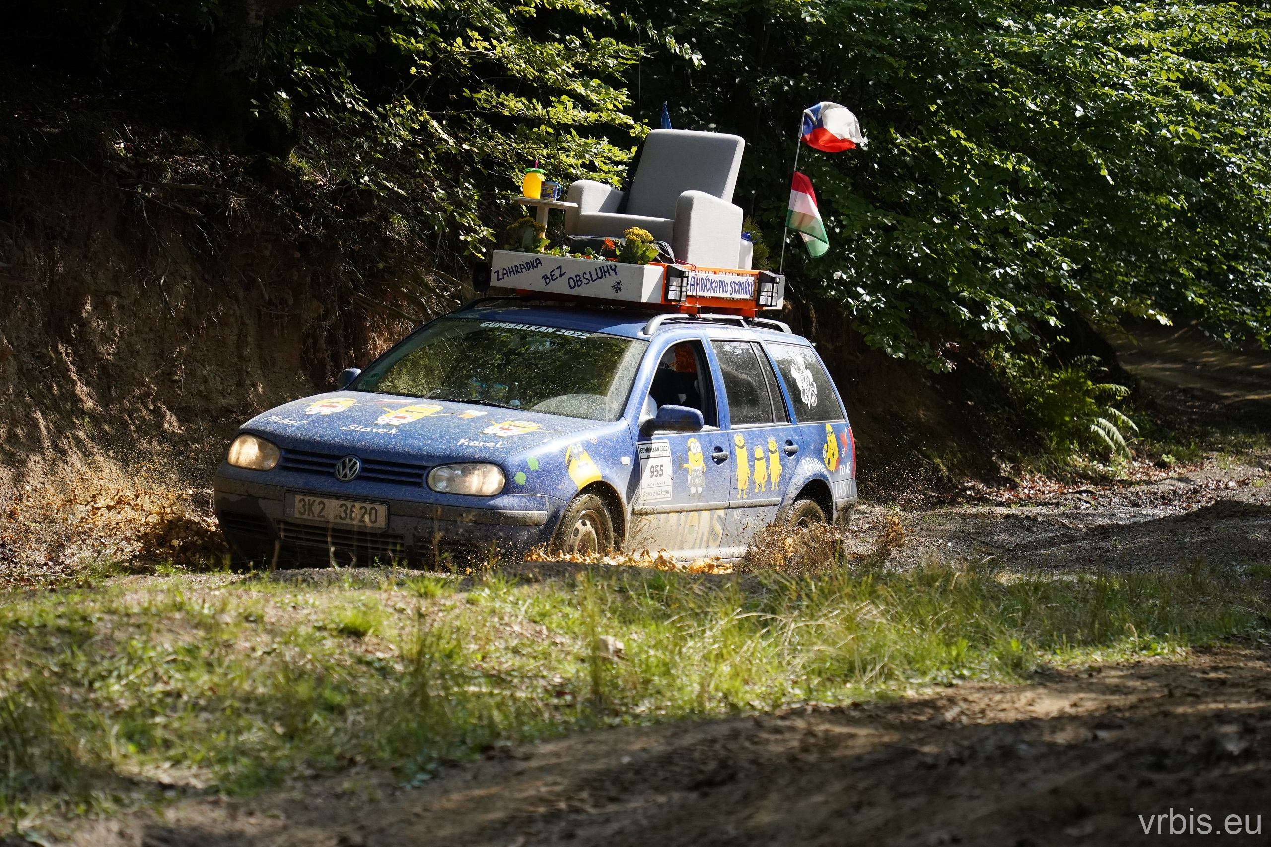 Po obědě a opravě pokračujeme lesní cestou dál. Vše se nese v poklidném duchu až do místa kde se cesta začíná svažovat z kopce. Je to opak toho co jsme předtím jeli nahoru, jen v horším stavu. Cesta jsou vlastně jen dvě rýhy vymleté od vody a traktoru, které jsou tak hluboké, že vjetí do nich by mohlo být osudné. S auty balancujeme na zbytcích původní cesty, je to jako jízda na kolejích. Volba správné stopy je klíčová. Michal se s Mimoněm vyhýbá výmolu a najíždí bokem auta na svah, tak že už to vypadlo že se převrátí na bok. Ale vše dobře dopadlo. Nejednou se auta při přejíždění mezi výmoly pohupují jen na dvou kolech. Když se dostáváme dolů, potkáváme několik dalších posádek, které si tuhle cestu vybrali směrem nahoru. Nezbývá něž jim popřát hodně štěstí. Težko říct, která z cest je horší… 😀
