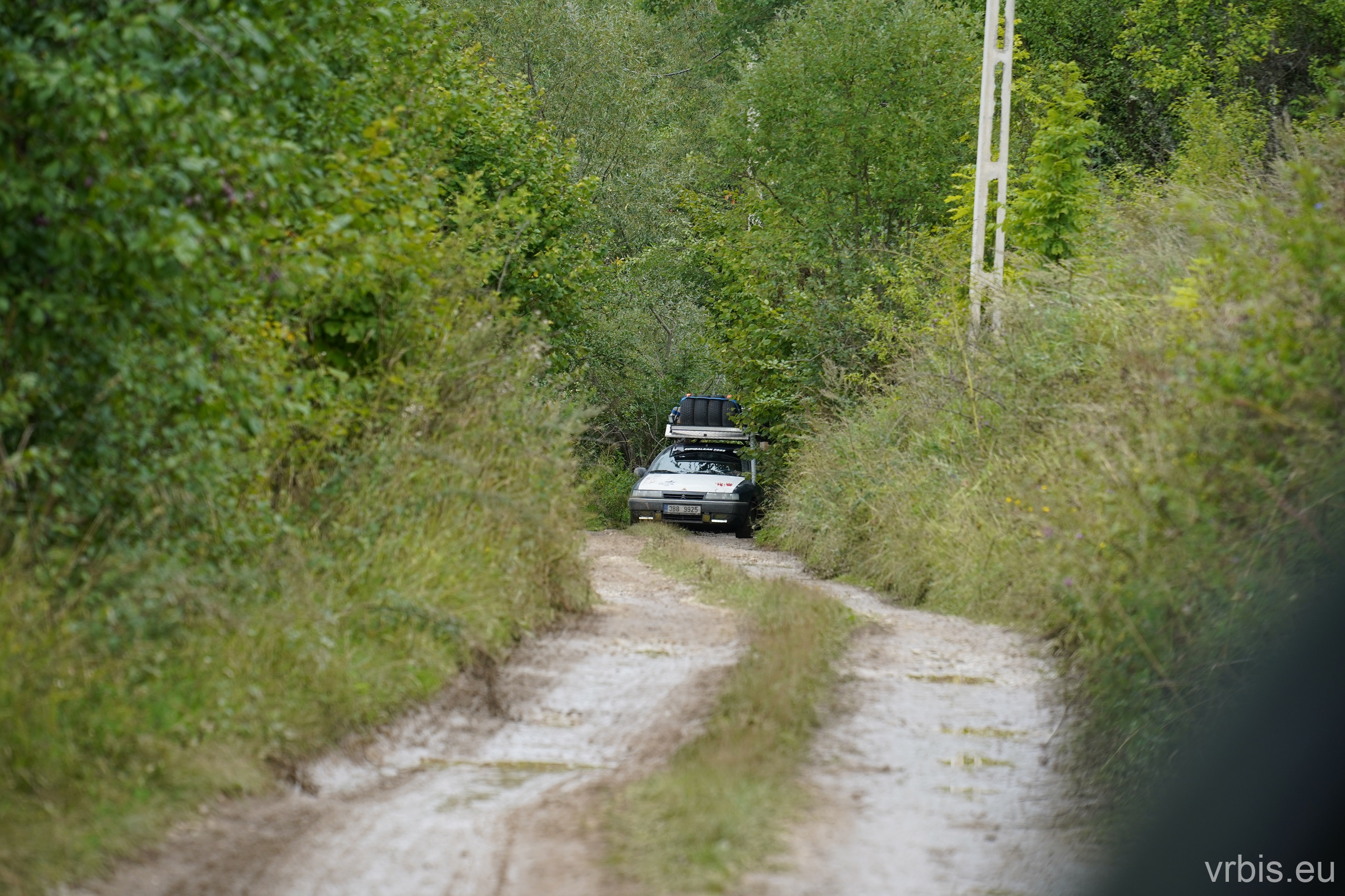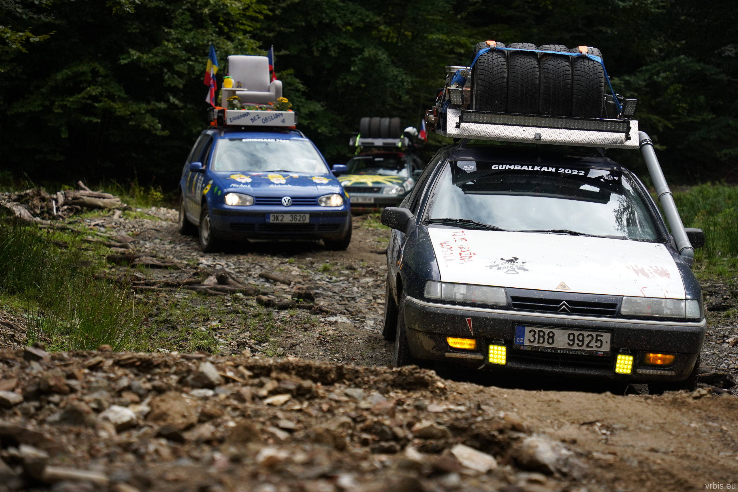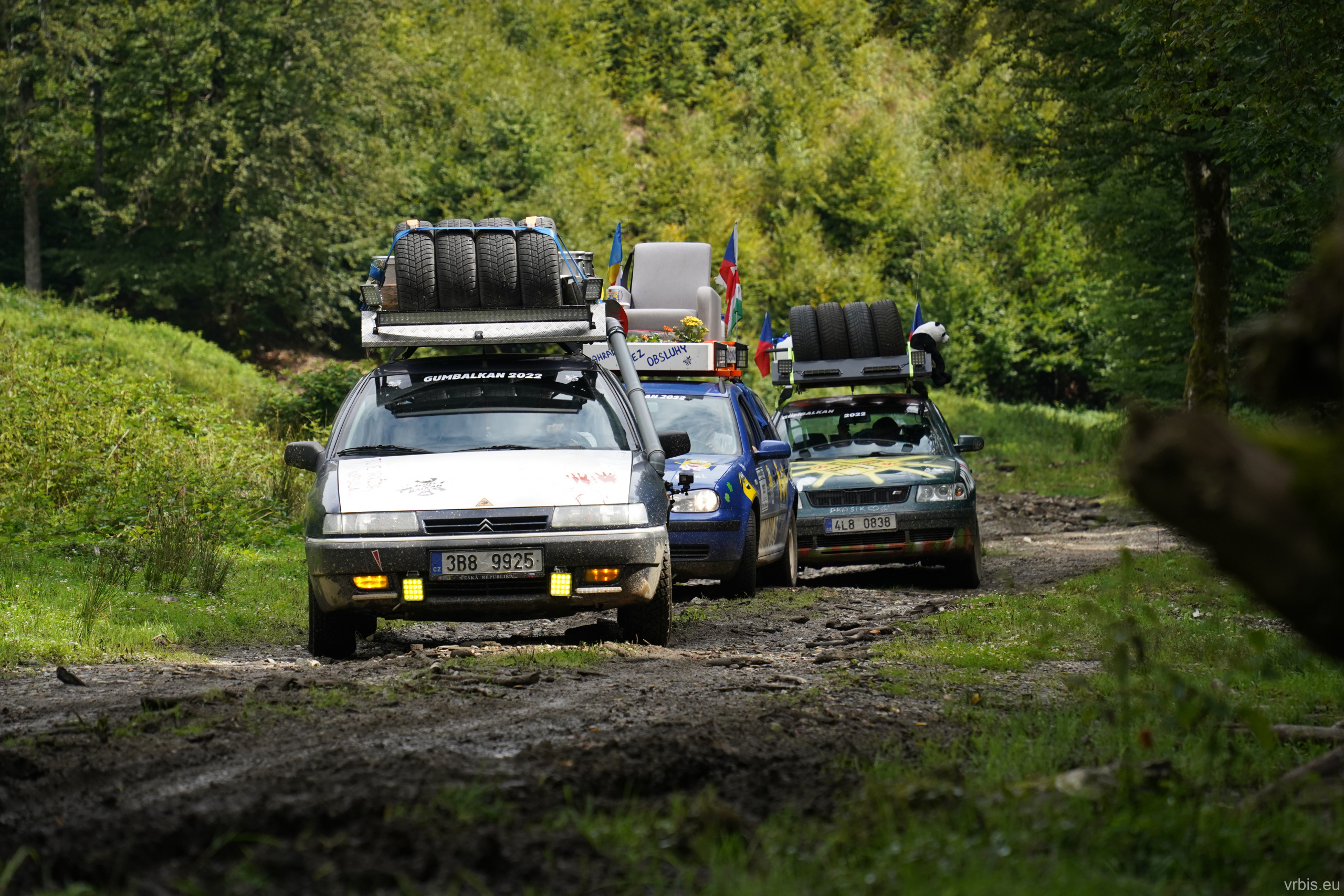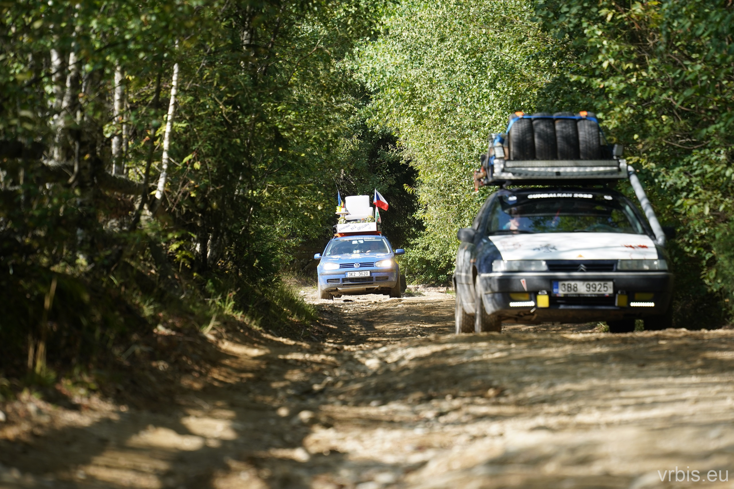 O několik kilometrů dále přichází jeden z nenáročnějších úseků dnešního dne. Vražda nemá v nízkých otáčkách skoro žádný výkon, zřejmně netlačí turbo nebo něco podobného. Prašná hlíněná lesní cesta je tak prudká, že se člověk po 10 krocích do kopce začíná zadýchávat. Můžu jet na jedničku a jen občas tam dostanu dvojku. Cesta je vymletá od vody, auta přejíždí hluboké výmoly po třech, někdy jen po dvou kolech. Jedu jako třetí, předem mnou je Mimoň a vpředu jede Prašík, který nečekaně zastavuje. To neměl dělat! Mimoň se už nezvládá rozjet. Michal, Dominik a Honza ho musejí roztláčet, ale zvládl to a jede. Do toho mi přijde na okýko zaklepat řidič Felicie za mnou. S prosbou „ať proboha nezastavujeme, že se pak nemůže rozjet!“ Ujišťuju ho, že mám úplně stejný poroblém. Se závanem připálené spojky se taky rozjíždím, kluci na mě mávají ať je předjedu, přidávám plyn a vrážím tam dvojku! 😀