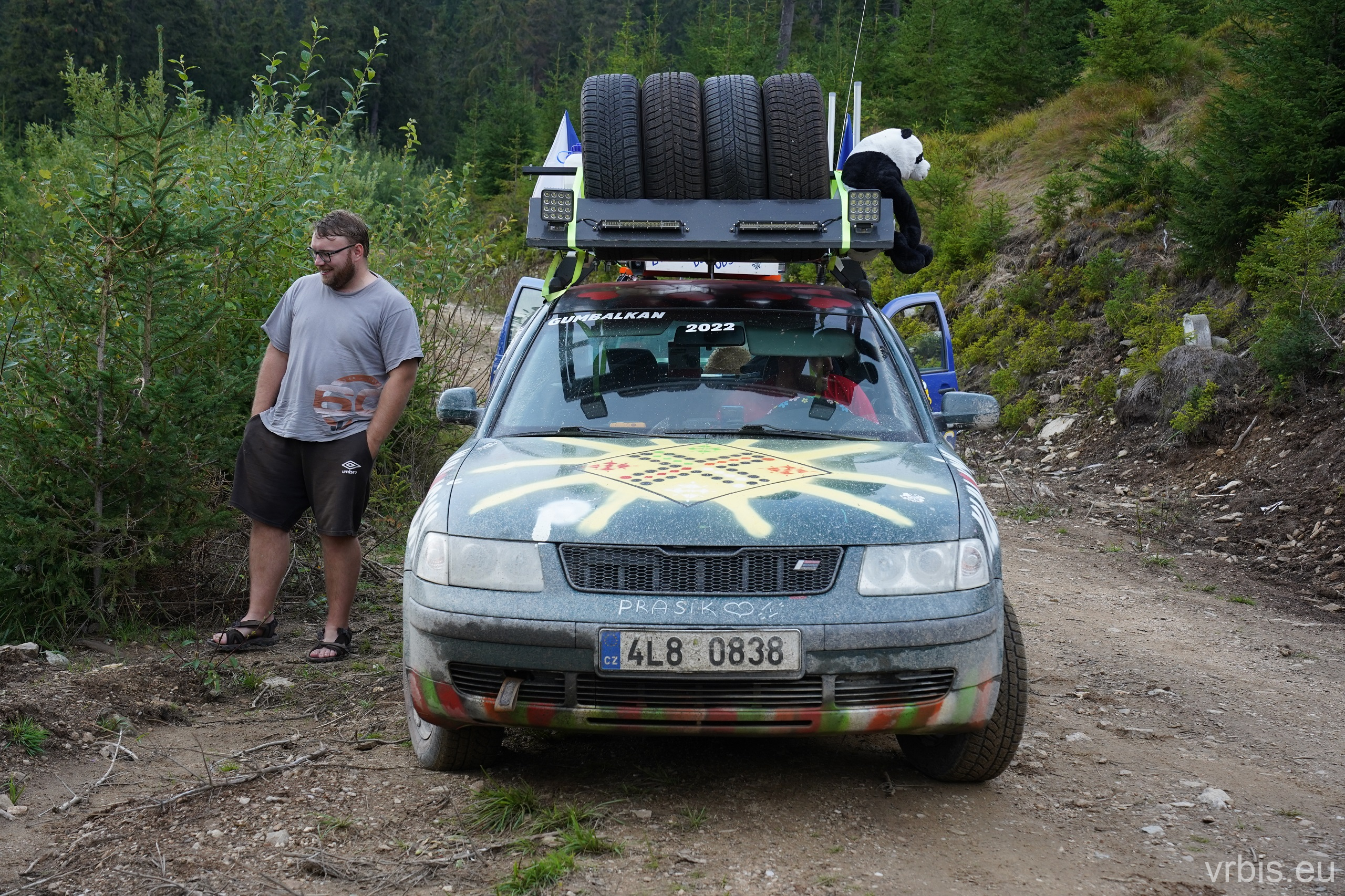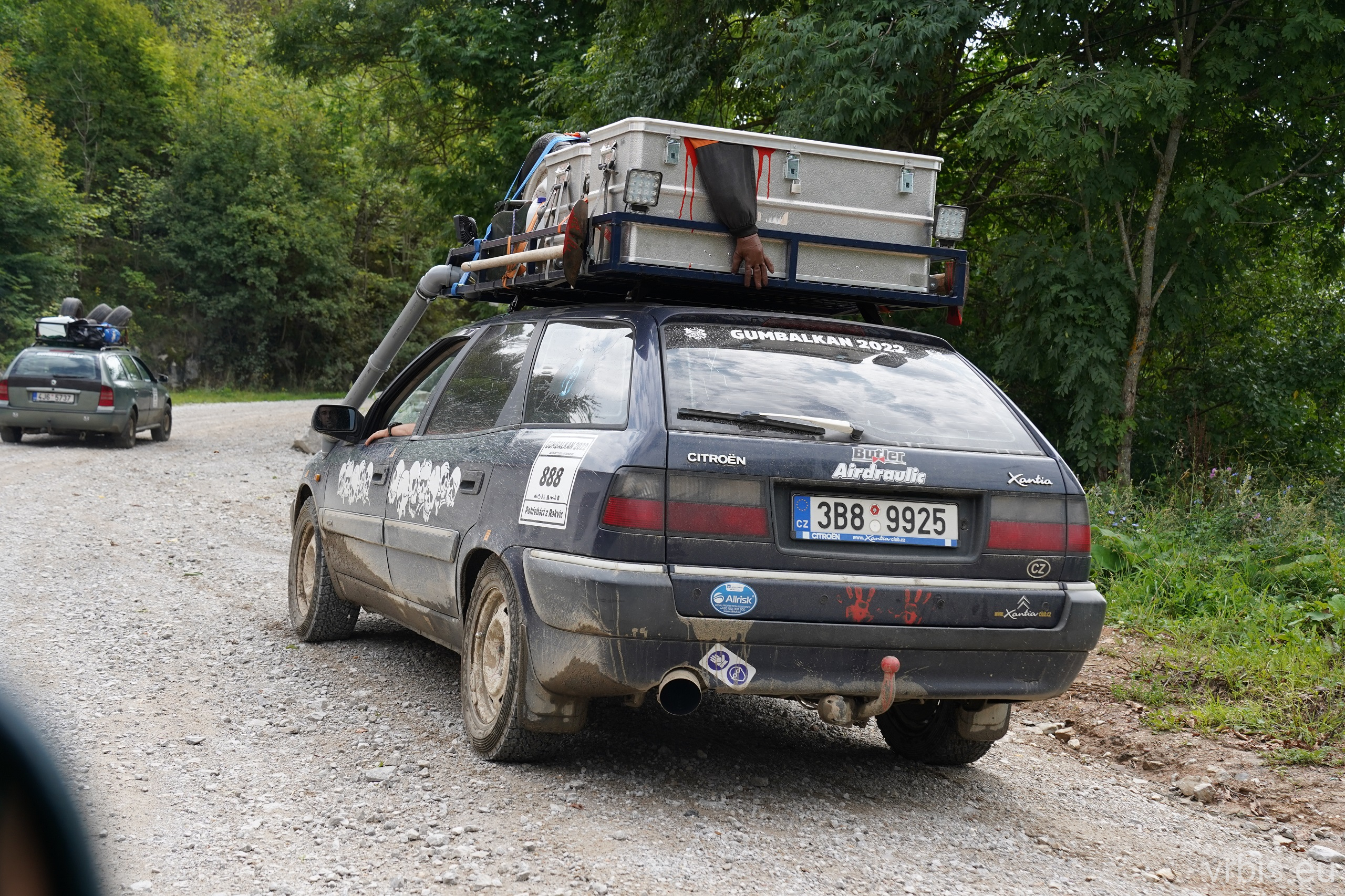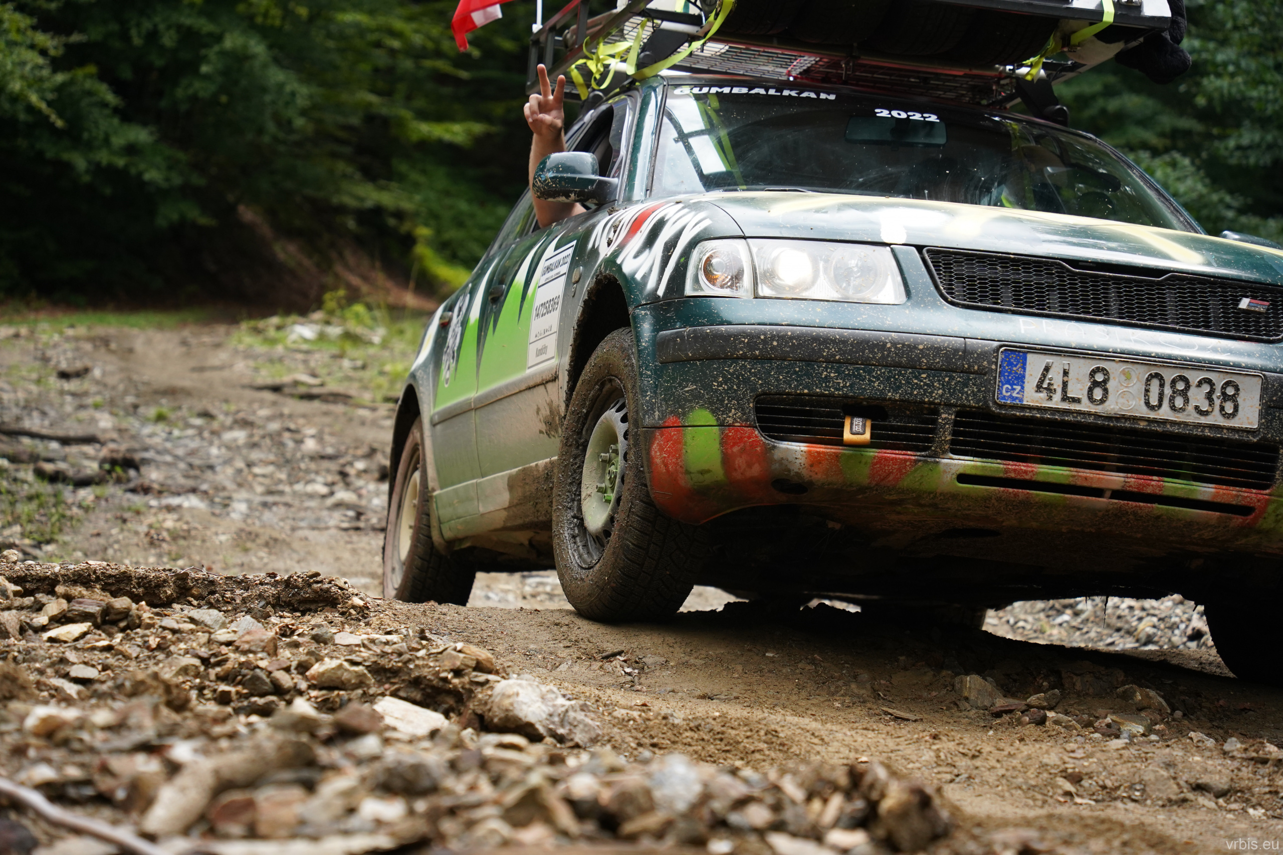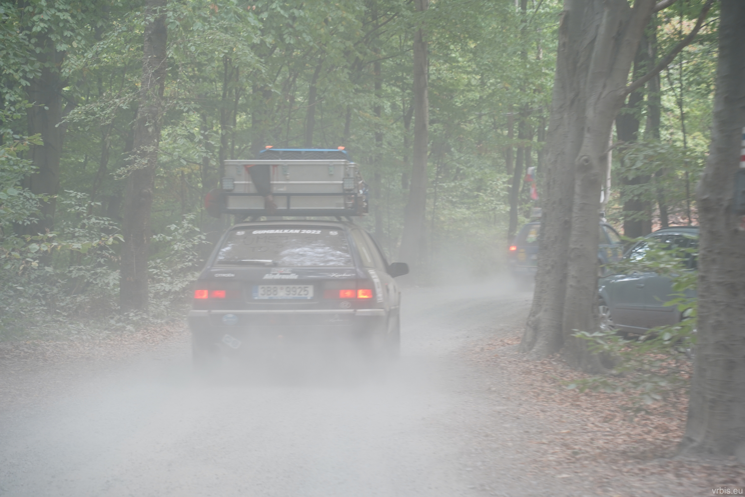O několik kilometrů dále přichází jeden z nenáročnějších úseků dnešního dne. Vražda nemá v nízkých otáčkách skoro žádný výkon, zřejmně netlačí turbo nebo něco podobného. Prašná hlíněná lesní cesta je tak prudká, že se člověk po 10 krocích do kopce začíná zadýchávat. Můžu jet na jedničku a jen občas tam dostanu dvojku. Cesta je vymletá od vody, auta přejíždí hluboké výmoly po třech, někdy jen po dvou kolech. Jedu jako třetí, předem mnou je Mimoň a vpředu jede Prašík, který nečekaně zastavuje. To neměl dělat! Mimoň se už nezvládá rozjet. Michal, Dominik a Honza ho musejí roztláčet, ale zvládl to a jede. Do toho mi přijde na okýko zaklepat řidič Felicie za mnou. S prosbou „ať proboha nezastavujeme, že se pak nemůže rozjet!“ Ujišťuju ho, že mám úplně stejný poroblém. Se závanem připálené spojky se taky rozjíždím, kluci na mě mávají ať je předjedu, přidávám plyn a vrážím tam dvojku! 😀