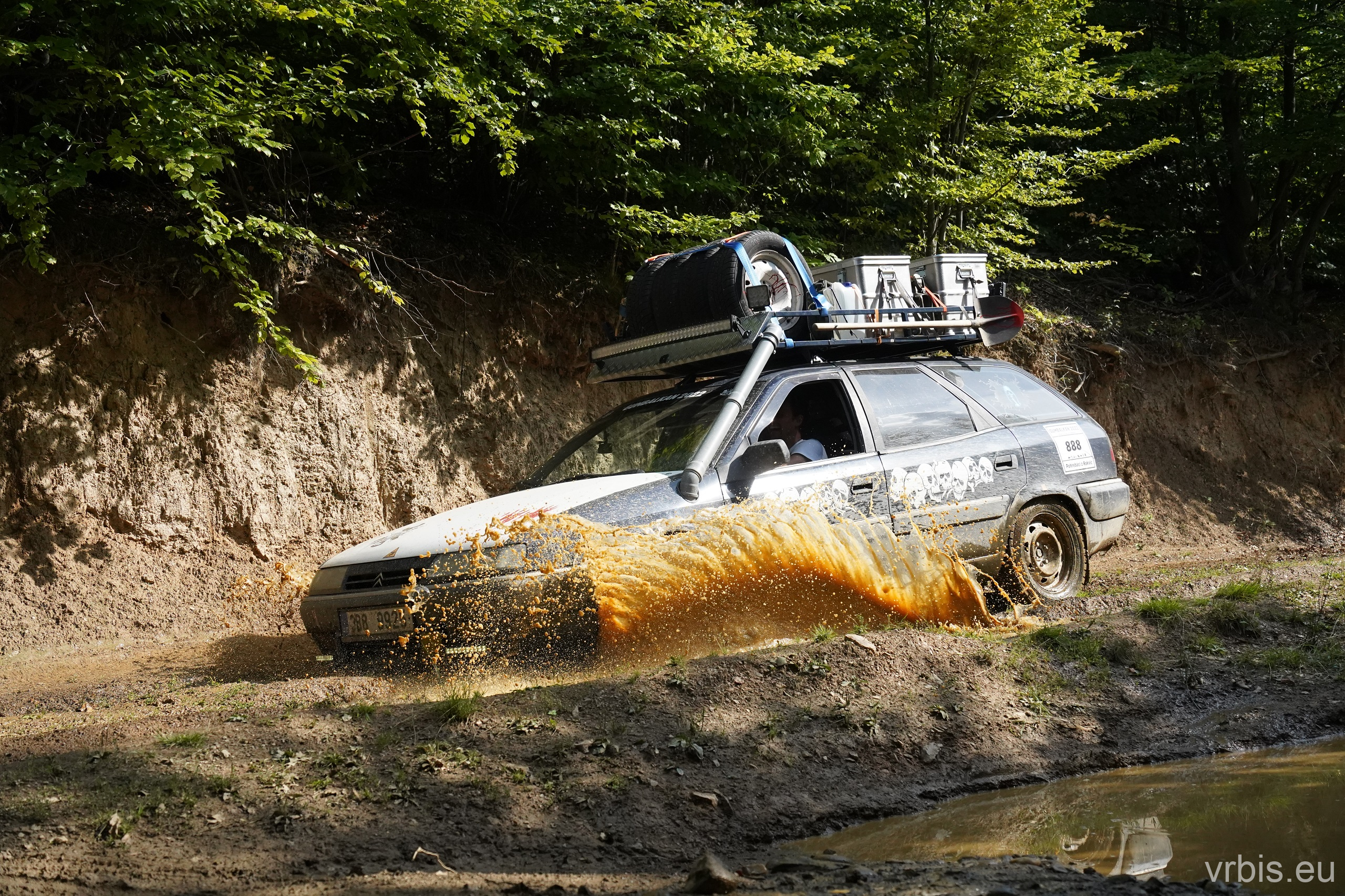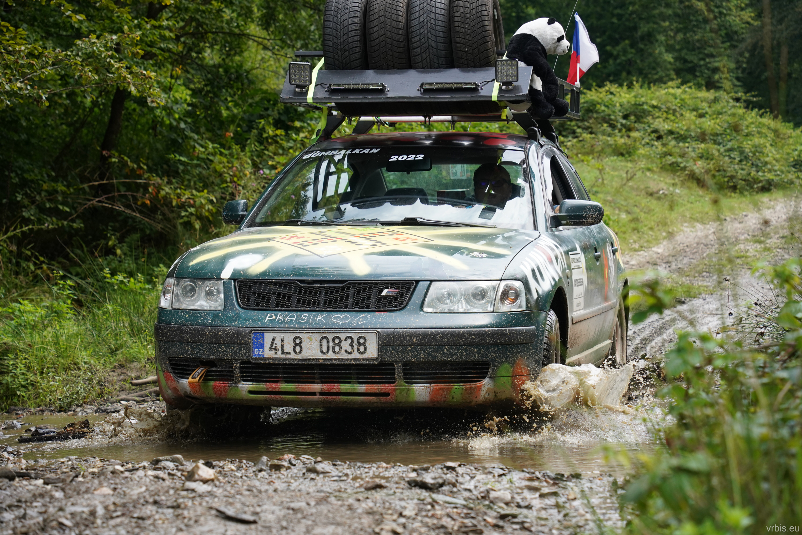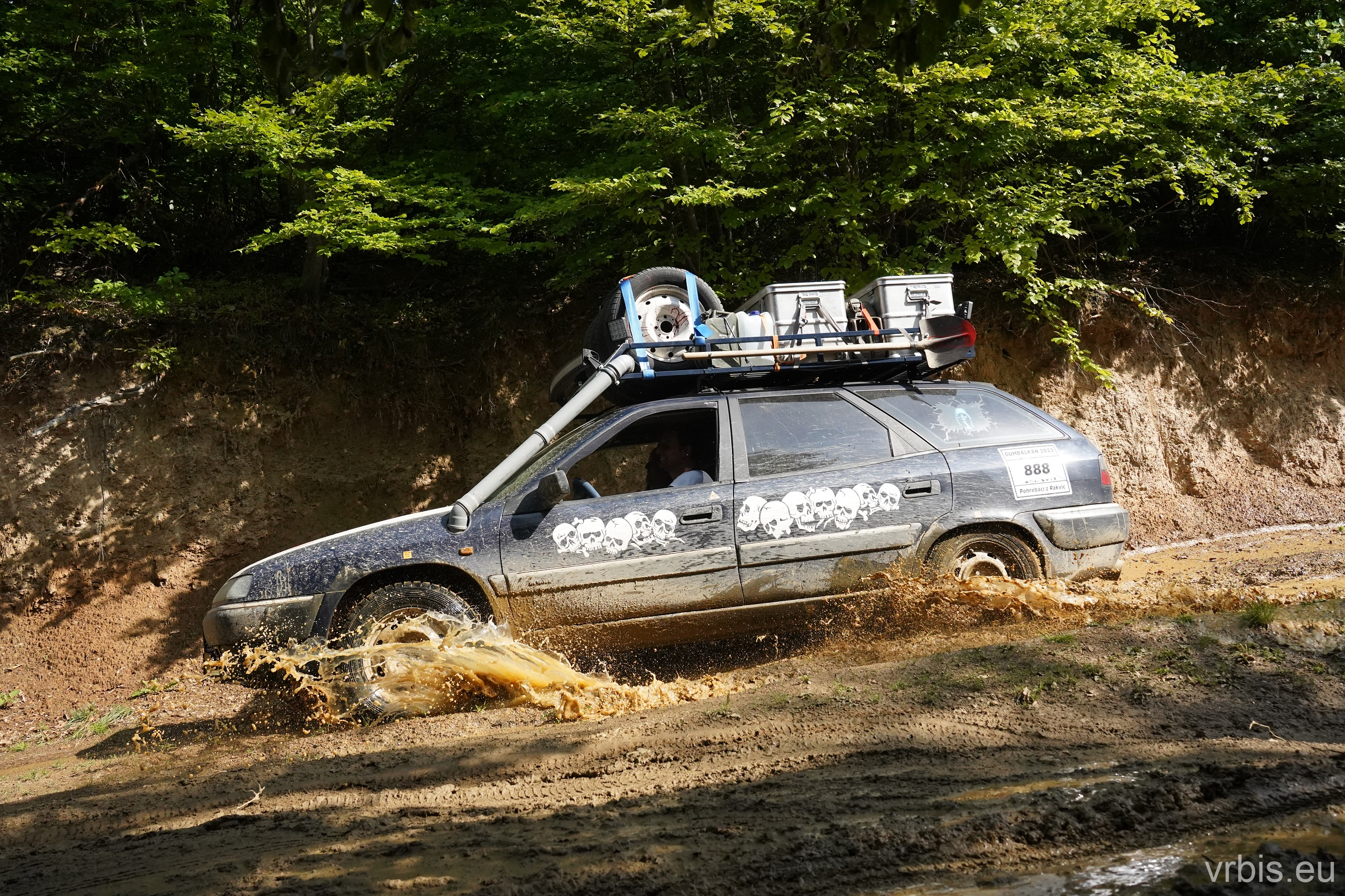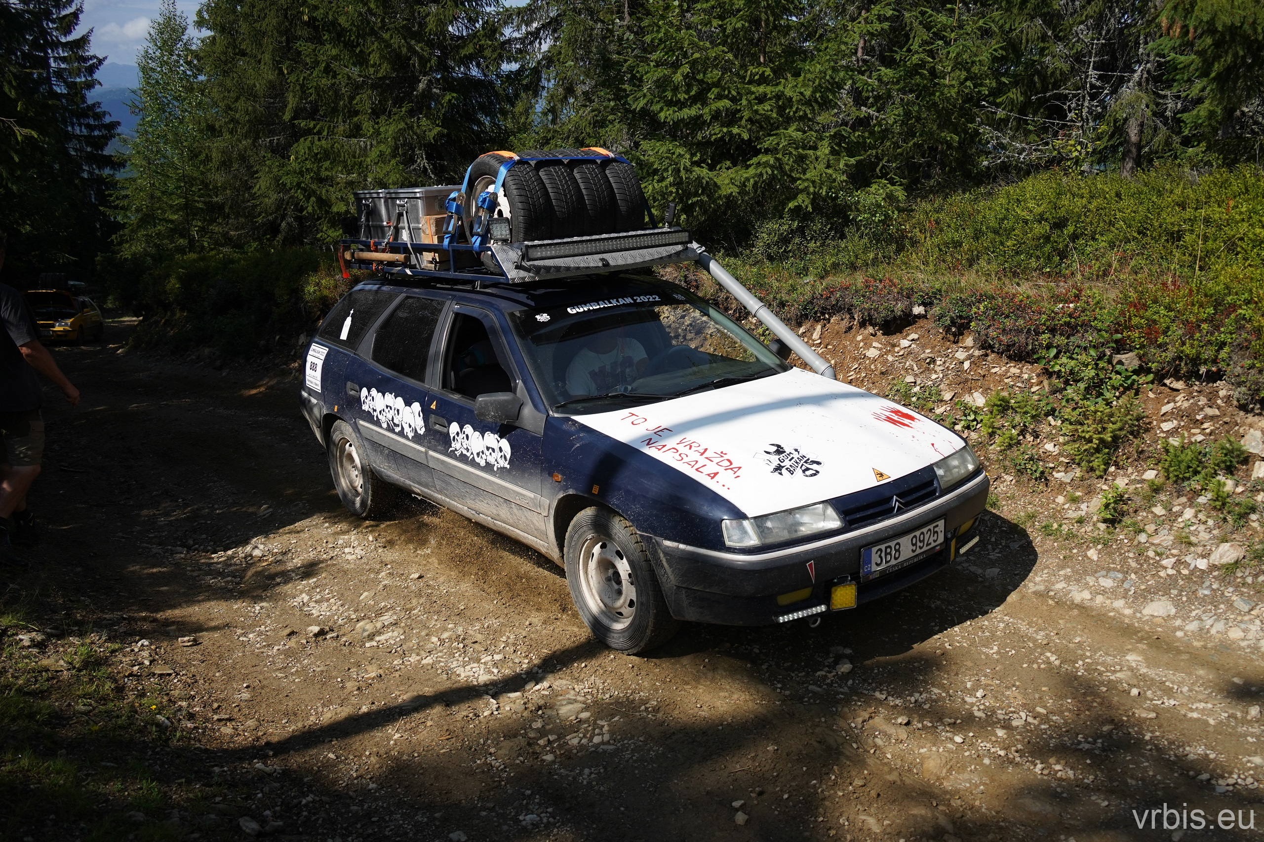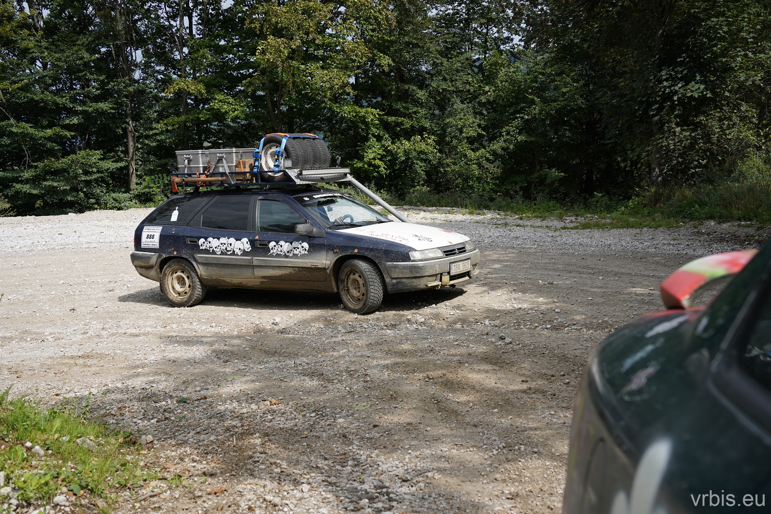 O několik kilometrů dále přichází jeden z nenáročnějších úseků dnešního dne. Vražda nemá v nízkých otáčkách skoro žádný výkon, zřejmně netlačí turbo nebo něco podobného. Prašná hlíněná lesní cesta je tak prudká, že se člověk po 10 krocích do kopce začíná zadýchávat. Můžu jet na jedničku a jen občas tam dostanu dvojku. Cesta je vymletá od vody, auta přejíždí hluboké výmoly po třech, někdy jen po dvou kolech. Jedu jako třetí, předem mnou je Mimoň a vpředu jede Prašík, který nečekaně zastavuje. To neměl dělat! Mimoň se už nezvládá rozjet. Michal, Dominik a Honza ho musejí roztláčet, ale zvládl to a jede. Do toho mi přijde na okýko zaklepat řidič Felicie za mnou. S prosbou „ať proboha nezastavujeme, že se pak nemůže rozjet!“ Ujišťuju ho, že mám úplně stejný poroblém. Se závanem připálené spojky se taky rozjíždím, kluci na mě mávají ať je předjedu, přidávám plyn a vrážím tam dvojku! 😀