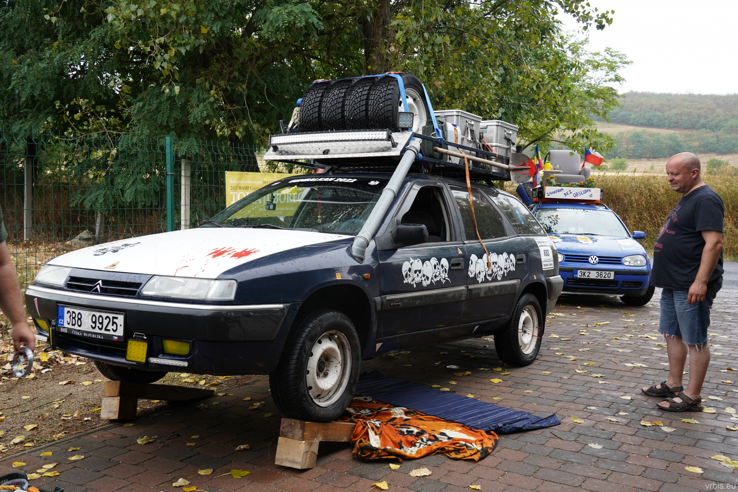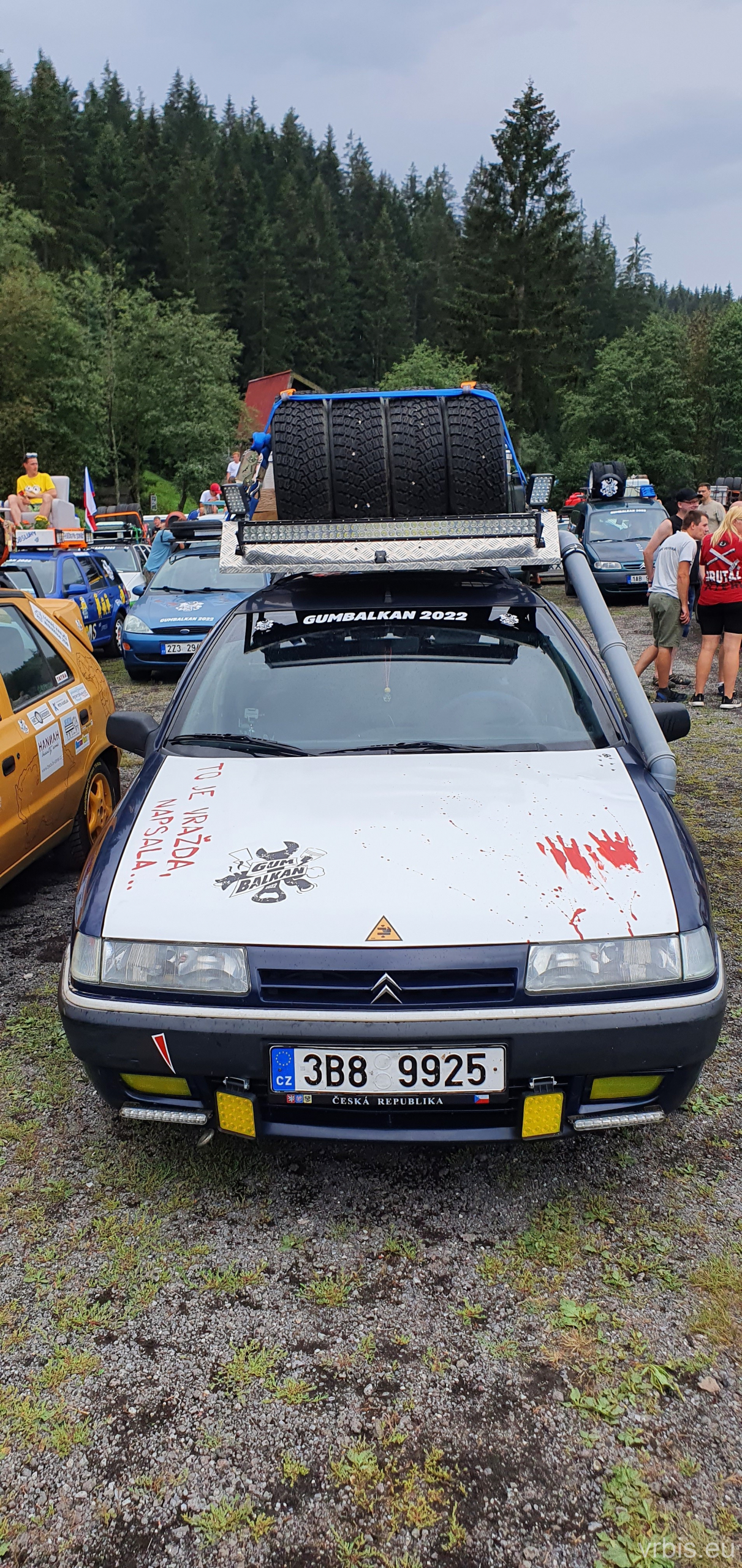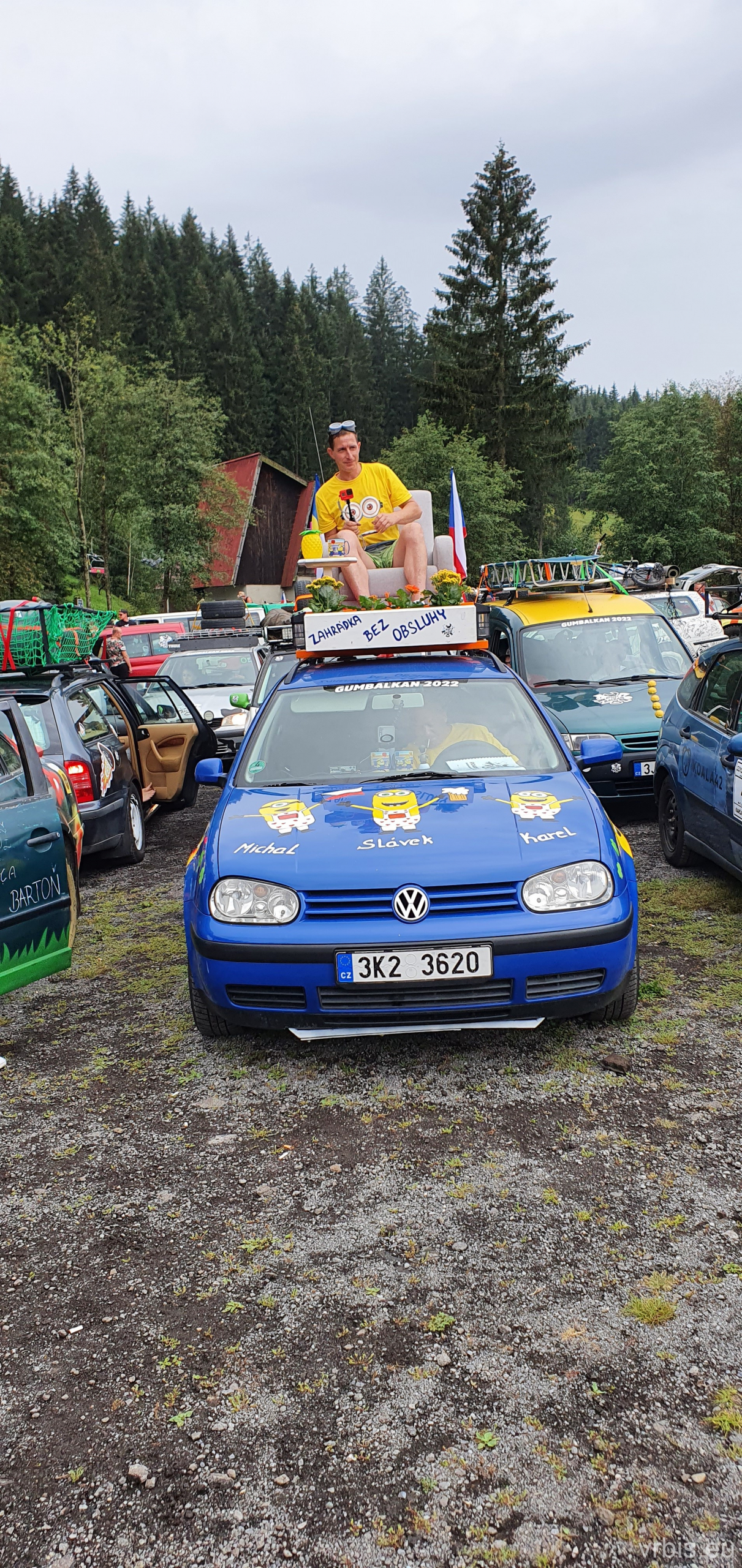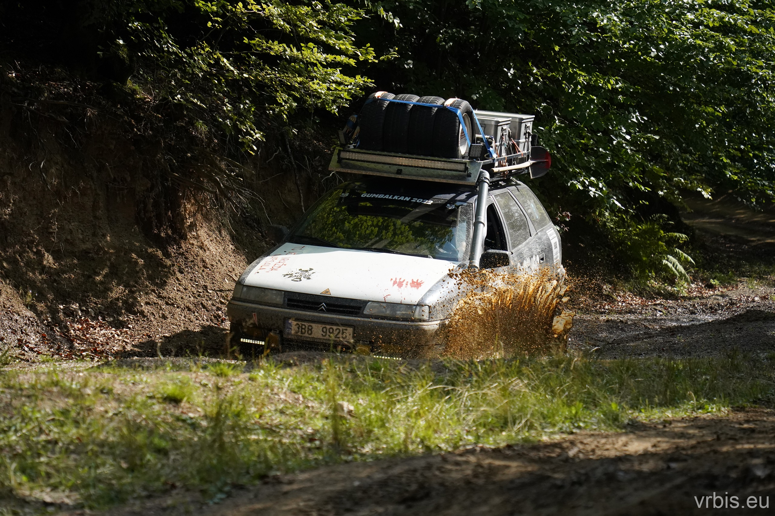 O několik kilometrů dále přichází jeden z nenáročnějších úseků dnešního dne. Vražda nemá v nízkých otáčkách skoro žádný výkon, zřejmně netlačí turbo nebo něco podobného. Prašná hlíněná lesní cesta je tak prudká, že se člověk po 10 krocích do kopce začíná zadýchávat. Můžu jet na jedničku a jen občas tam dostanu dvojku. Cesta je vymletá od vody, auta přejíždí hluboké výmoly po třech, někdy jen po dvou kolech. Jedu jako třetí, předem mnou je Mimoň a vpředu jede Prašík, který nečekaně zastavuje. To neměl dělat! Mimoň se už nezvládá rozjet. Michal, Dominik a Honza ho musejí roztláčet, ale zvládl to a jede. Do toho mi přijde na okýko zaklepat řidič Felicie za mnou. S prosbou „ať proboha nezastavujeme, že se pak nemůže rozjet!“ Ujišťuju ho, že mám úplně stejný poroblém. Se závanem připálené spojky se taky rozjíždím, kluci na mě mávají ať je předjedu, přidávám plyn a vrážím tam dvojku! 😀