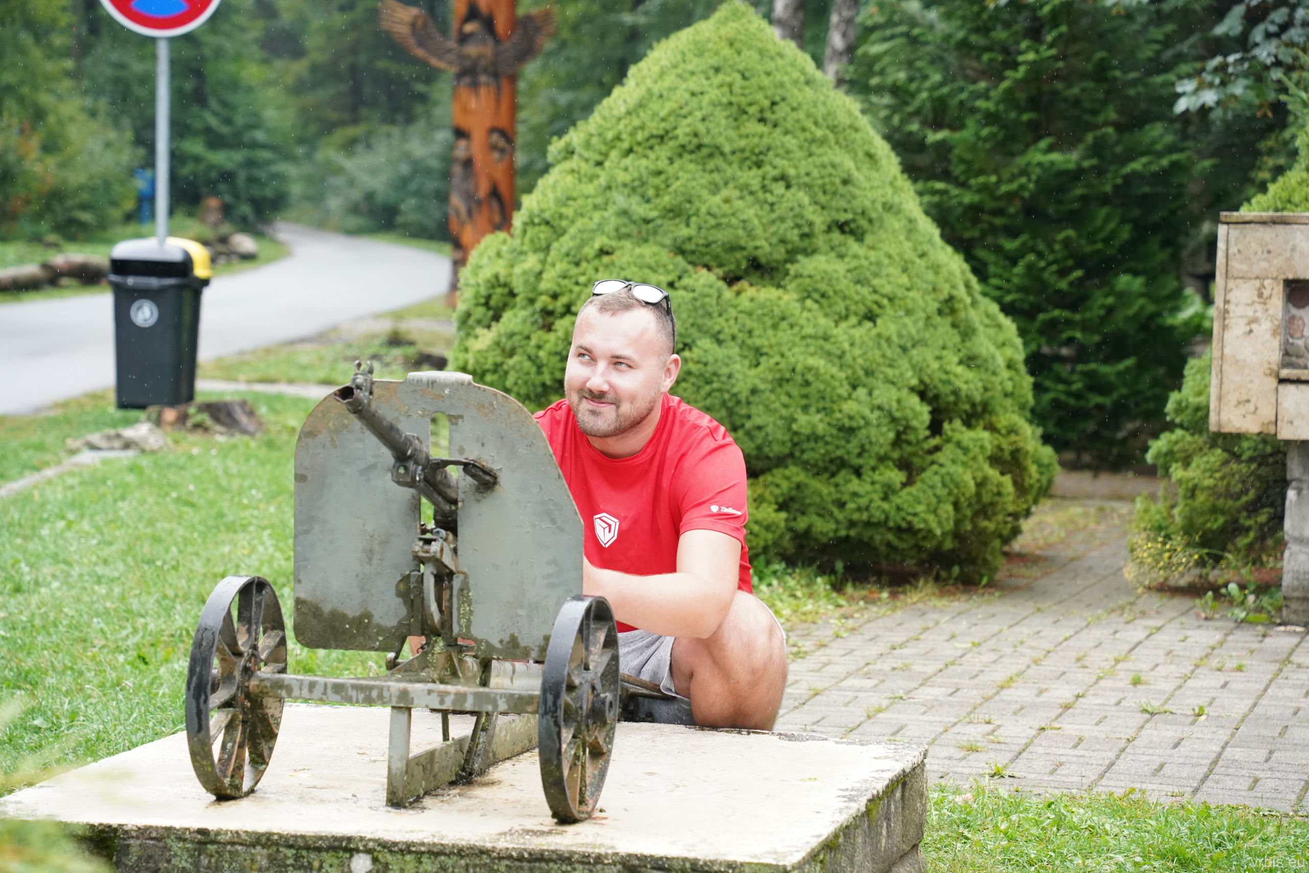 Takto jedeme několik Zik-Zak 180°-zatáček, když se přede mnou ukázala zatáčka ve které se cesta zvedala snad až do nebe. V nájezdové zóně je navíc hluboká rýha napříč cesty. Rozhoduji se jak to nejlépe projet. Potřebuju rychlost, ale nemůžu moc rychle najet do té rýhy a hlavně ne oběma kolama naráz, jinak mi to vyrazí nejen zuby. Volím současnou rychlost a přejezd šikmo přes rýhu. Pravé kolo to zládá, levé už ale ne… 🙁 zůstávám vyset! LP a PZ kolo v rýze. Nemůžu ani vpřed ani vzad. Kluci se snaží tlačit, ale to zůstává v tomhle kopci bez účinku. „Navyják!“ ještě že ho mám 😎 Vše zapojuju a vytahuju lano, ale to je krátké, nedostanu se s ním okolo stromu… Naštěstí mám ještě úvazy, tohle už klaplo. Napínám lano, vše vypadá dobře, jen asi navyják nemá tolik síly, kolik by v tomle kopci potřeboval. Rozhoduji se pomoct mu autem. Karel přebírá ovládání navyjáku, já se u toho snažím rozjet, ale to je k ničemu jen se povoluje lano a navyják dostává ještě víc zabrat. Po nějaké době se přece jen auto dostává do pozice, kdy už kola nejsou uvízlá v rýze. Za pomoci ostatních, kteří auto tlačili, se zvládám rozjet. Po cestě nahoru už zastavujeme jen jednou, kdy proti nám jede auto. Uhýbáme na boční cestu abysme si mohli dopřát rozjezd. Starší pán s jeho 4×4 nám nabízí, že nás nahoru vytáhne. S úsměvem a poděkováním odmítáme. Ikdyž vímě, že toho můžeme litovat, ale tohle je Gumbalkáááán! 😀