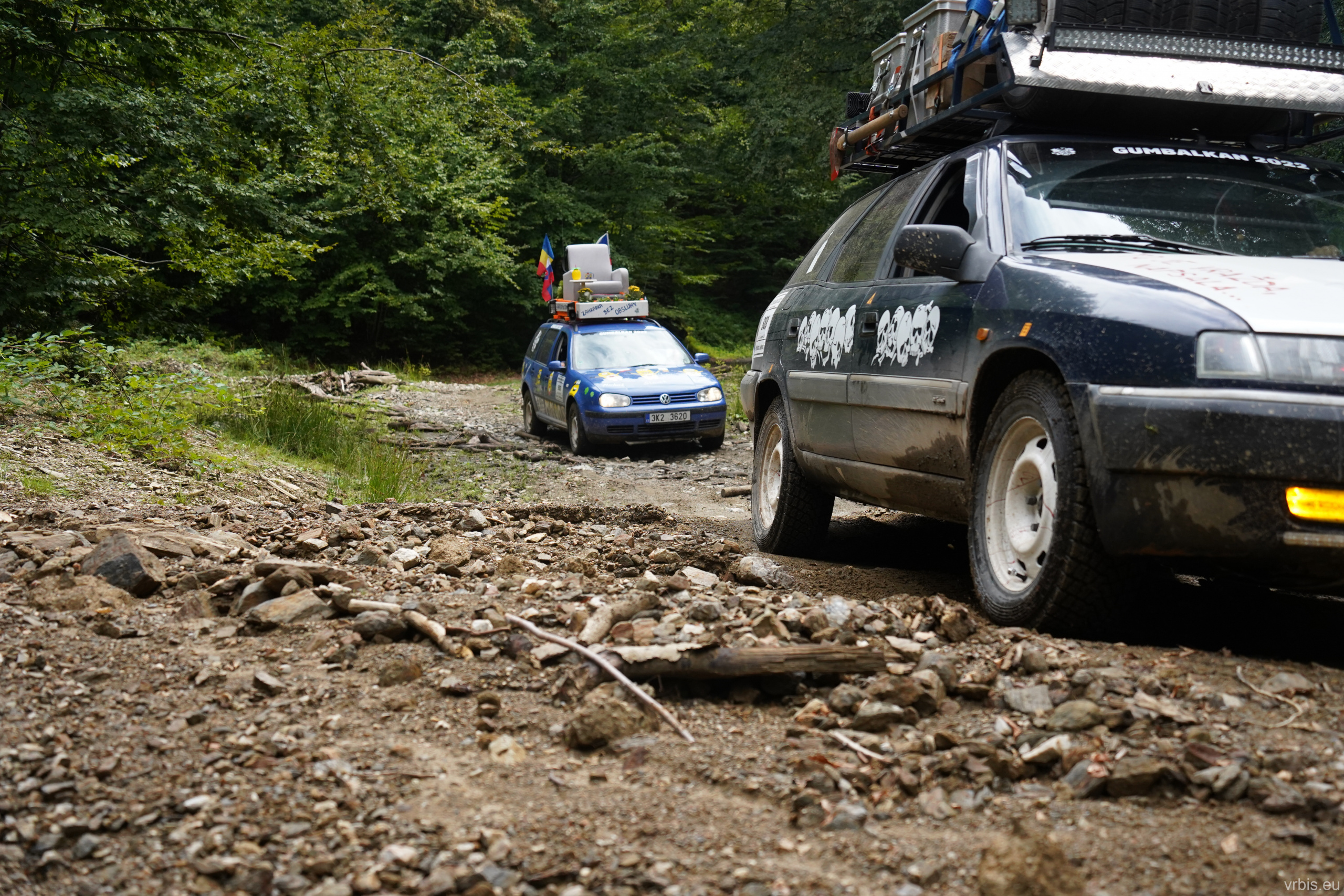 Rumunské (ne)cesty nás dovedli až na úpatí hory „Vârful Cucurbăta Mare“, kde jsme dojeli další posádky. Šnečím tempem jsme se za nimi vlekli po kamenité lesní cestě už asi 20 minut než mě to přestalo bavit. Volám do vysílačky „To je nudááá!! Nepředjedeme je?“. V zápětí se ozvalo „Ukaž jim to!“. Toho jsem se chytil, ikdyž byla cesta relativně úzká, pořád zde bylo ale dost místa na to abycho auta předjeli.