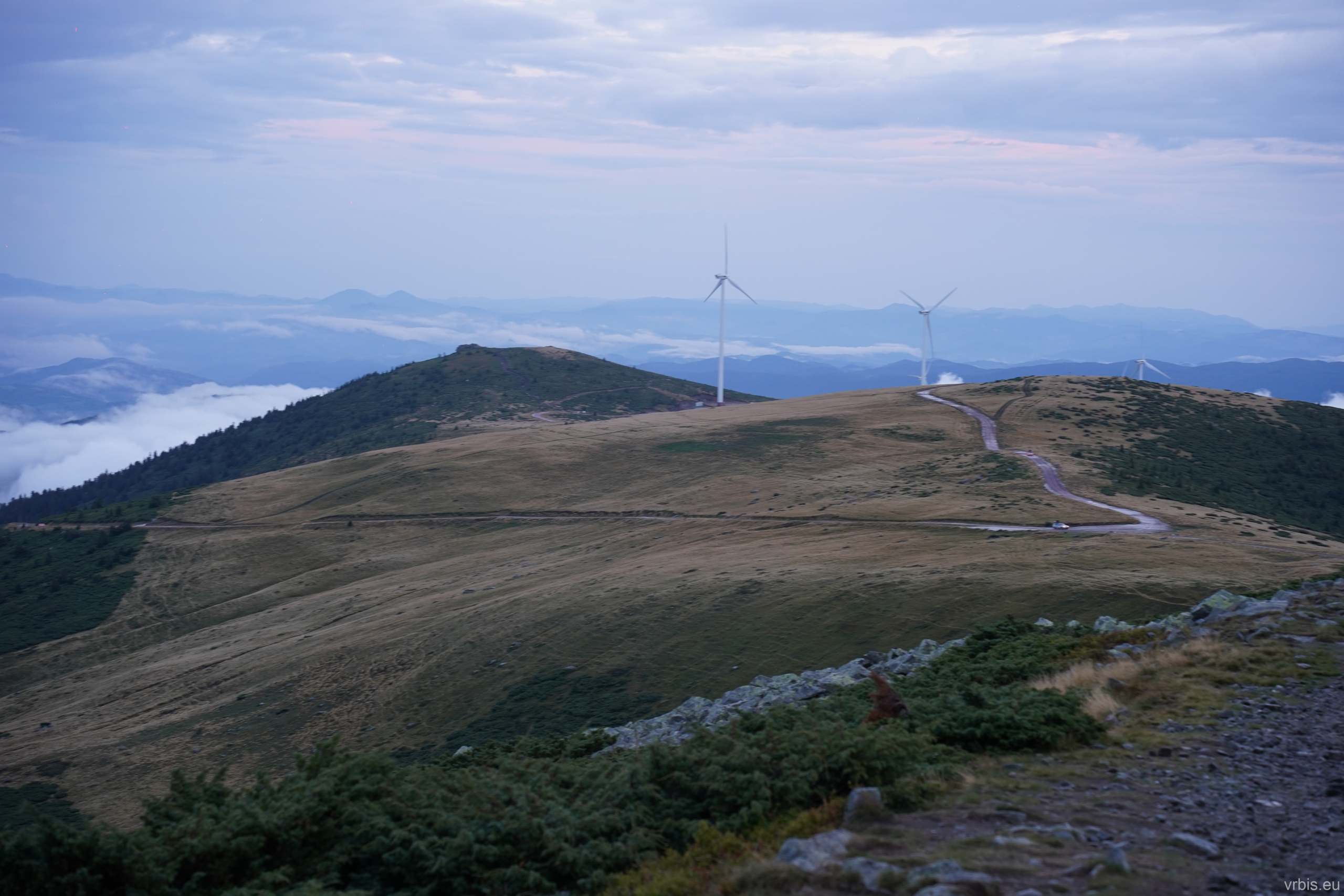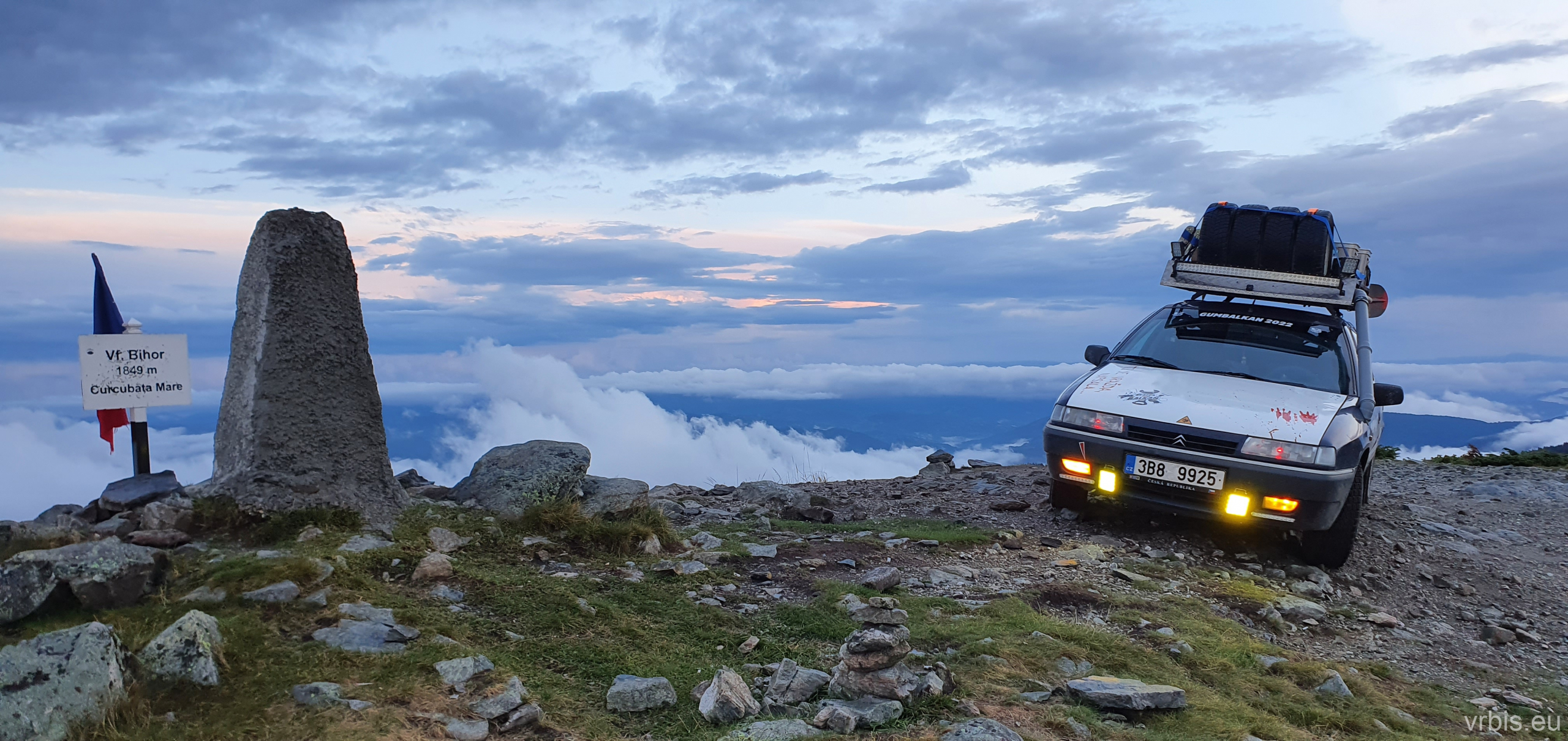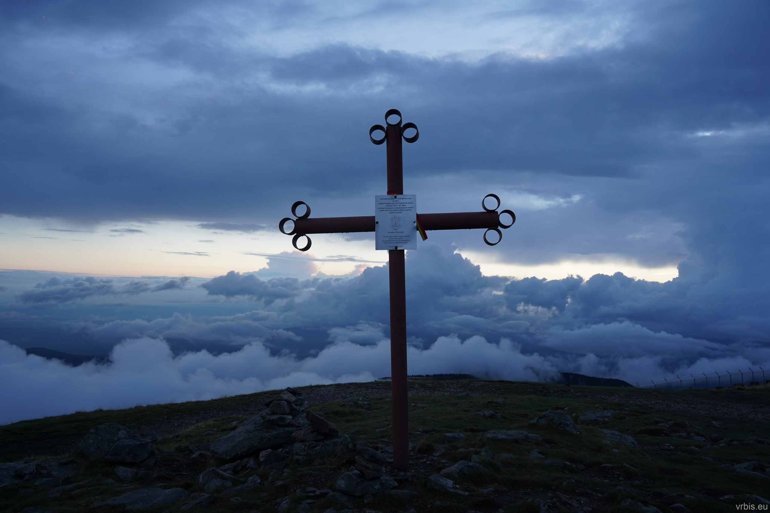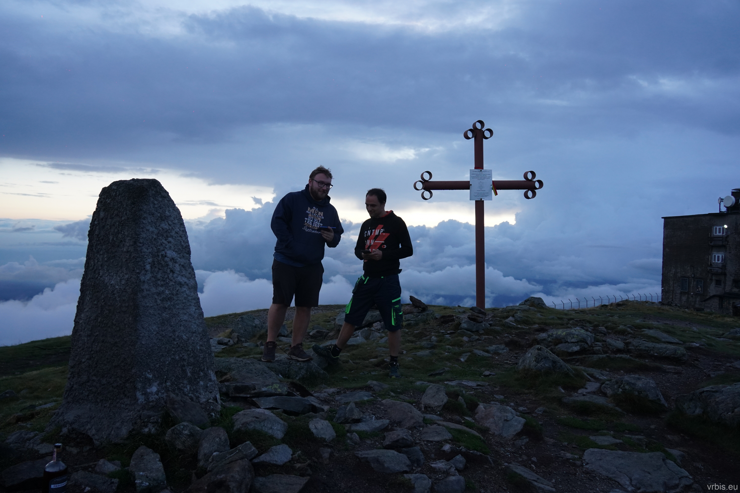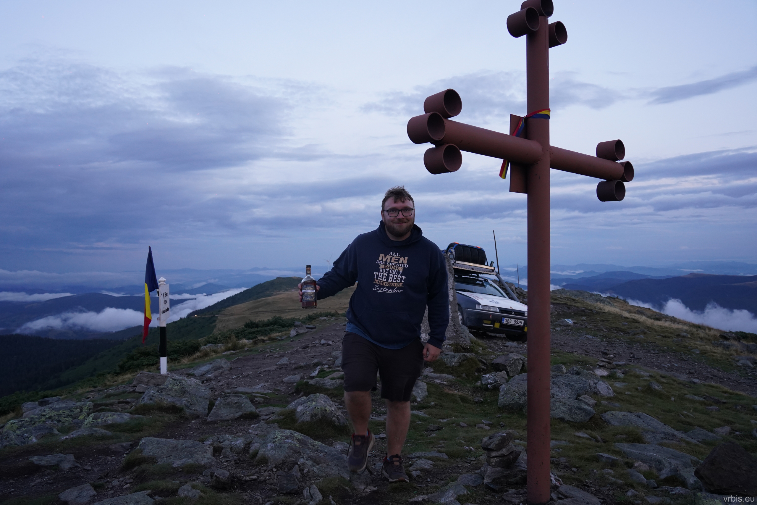 Jsem nahoře, nebo spíš na hoře -Vârful Cucurbăta Mare (1849 m)! B-) Yes, to byl nářez! Chlápci mi přišli pogratulovat a pozvali mě večer k nim na panáka. Stopy, které jsem viděl na rozcestí, byli od nich, ale v půlce to vzdali. Klobouk dolů před tím autem, dnes dostalo zabrat! Zbytek party dorazil asi po 15 minutách, ale vzali to tou jednodužší cestou. Dominik přišel s láhví rumu, dali jsme si panáčka a udělali pár fotek. Bylo už docela pozdě, slunce zapadlo a tak jsme se vydali dolů najít tábořště. Sjel jsem pomalu dolů a užíval si ty výhledy. Na rozcestí jsem zastavil a čekal na ostatní. Dost se ochladilo.