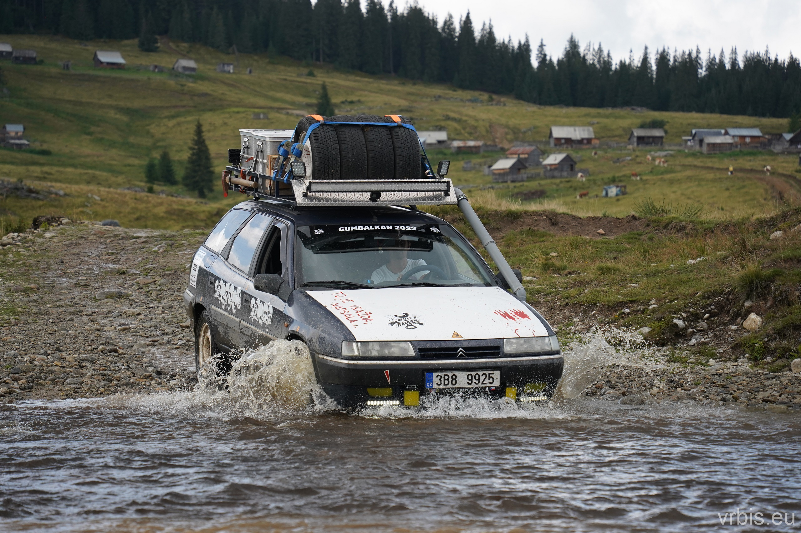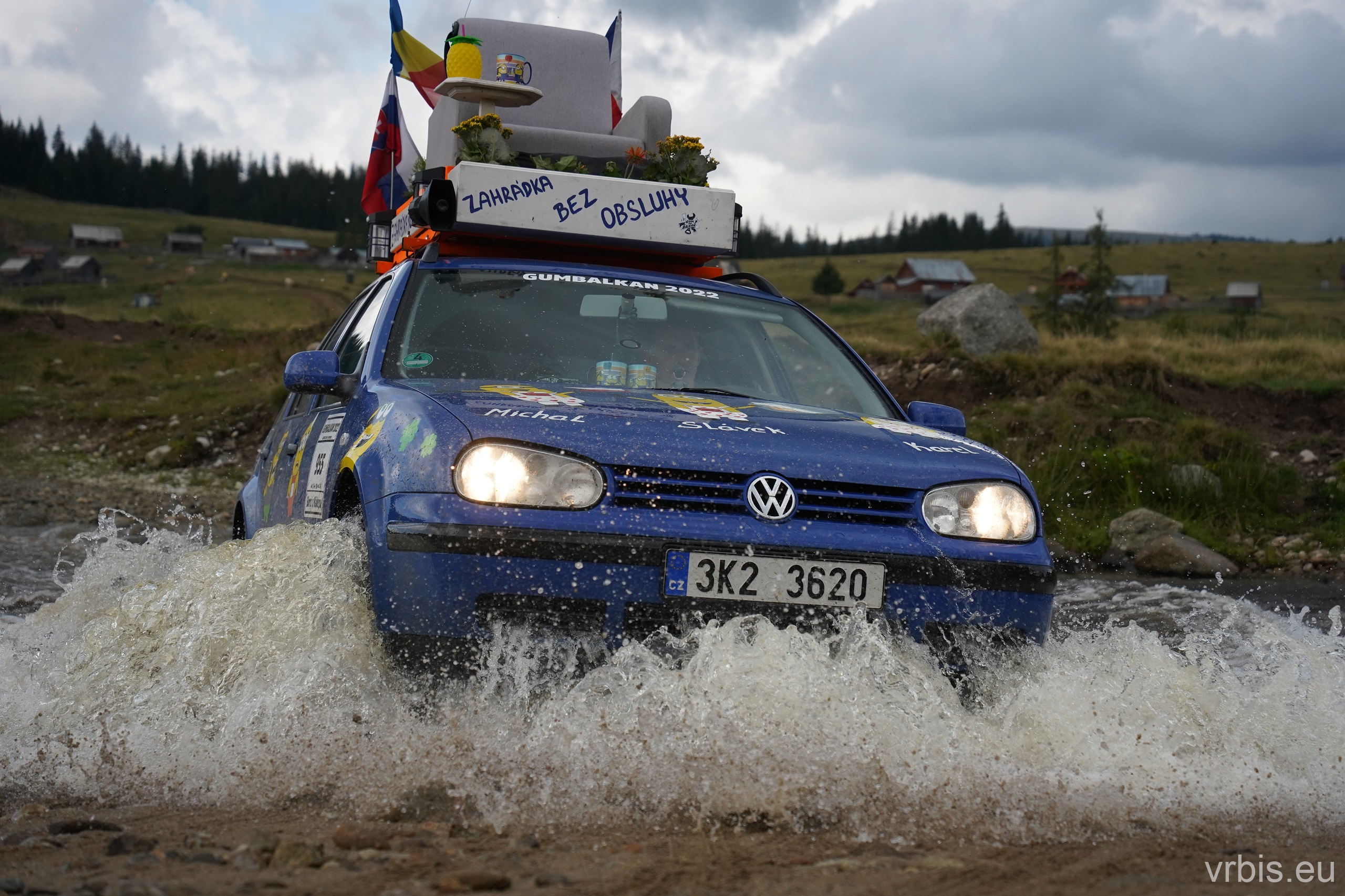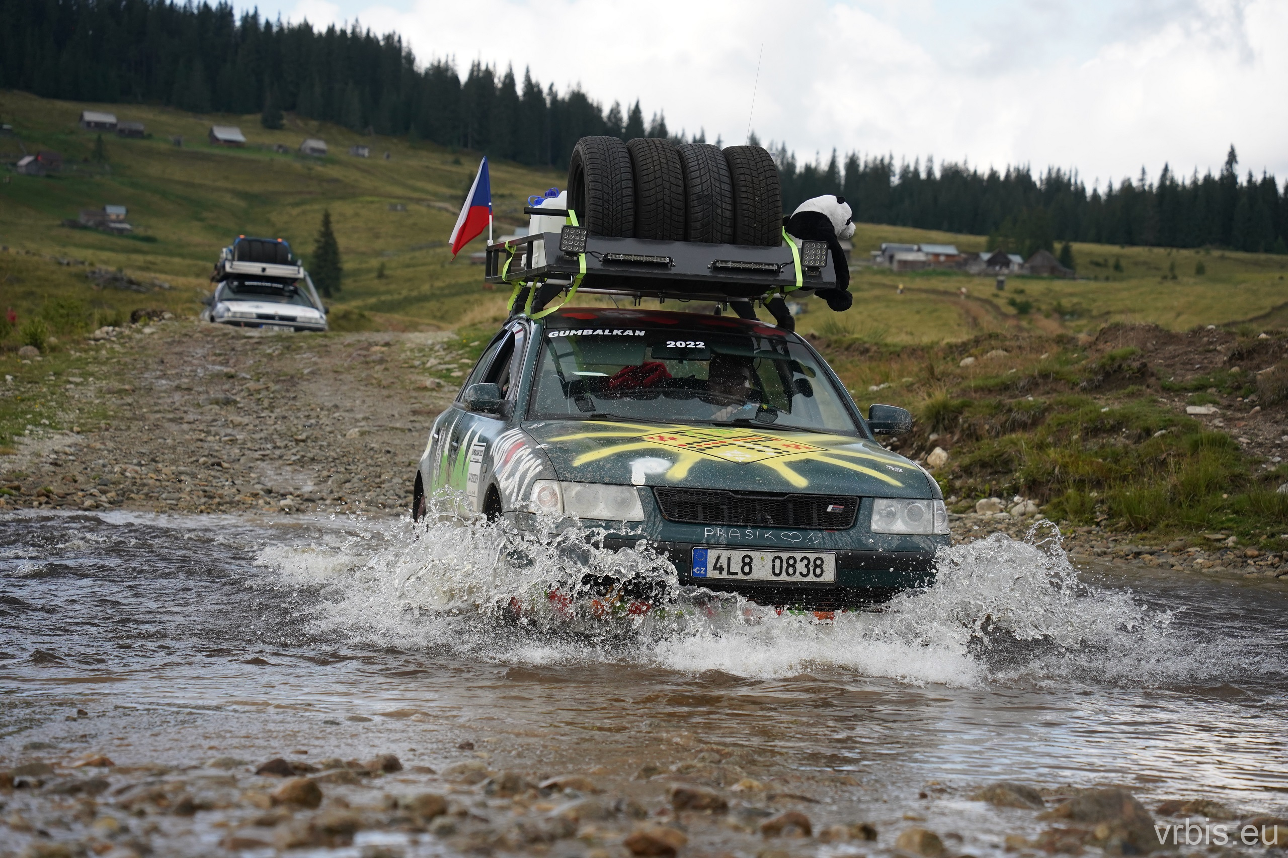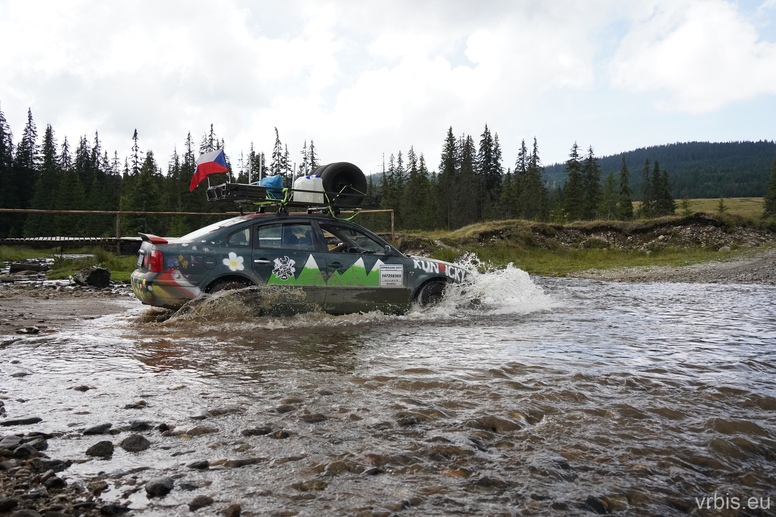 Po asi 100 km zábavy v terénu nás Roadbook přivádí opět do civilizace. Prohlídka města „Cluj-Napoca“ probíhá stylem „Drive-throw“. Zastavujeme natankovat a u toho si všímáme jak máme v porovnání s ostatními zaneřáděný auta. A to v rumunsku rozhodně nejezdí žádný leštěnky 😀 Další cesta vede do obchodu, kde nakupujeme zásoby na další dny. V tom několika z nás přichází na mobil upozornění před silnou bouřkou. Schodujeme se, že dnes to na kempování v přírodě nebude. Splníme tak i Karlův sen vyspat se po cestě aspoň jednou v posteli a dát si teplou sprchu. Ukolujeme ho tedy hledáním ubytování mezi tím než dojedeme na dnešní poslední Checkpoint. Než jsme stihli naložit nákup do aut, obloha potemněla a zvedl se vítr. Začíná pršet dřív než jsme odvezli vrátit vozík. Během několika minut se silnice proměňujíe v řeku, z oblohy doslova tečou souvislé proudy vody.