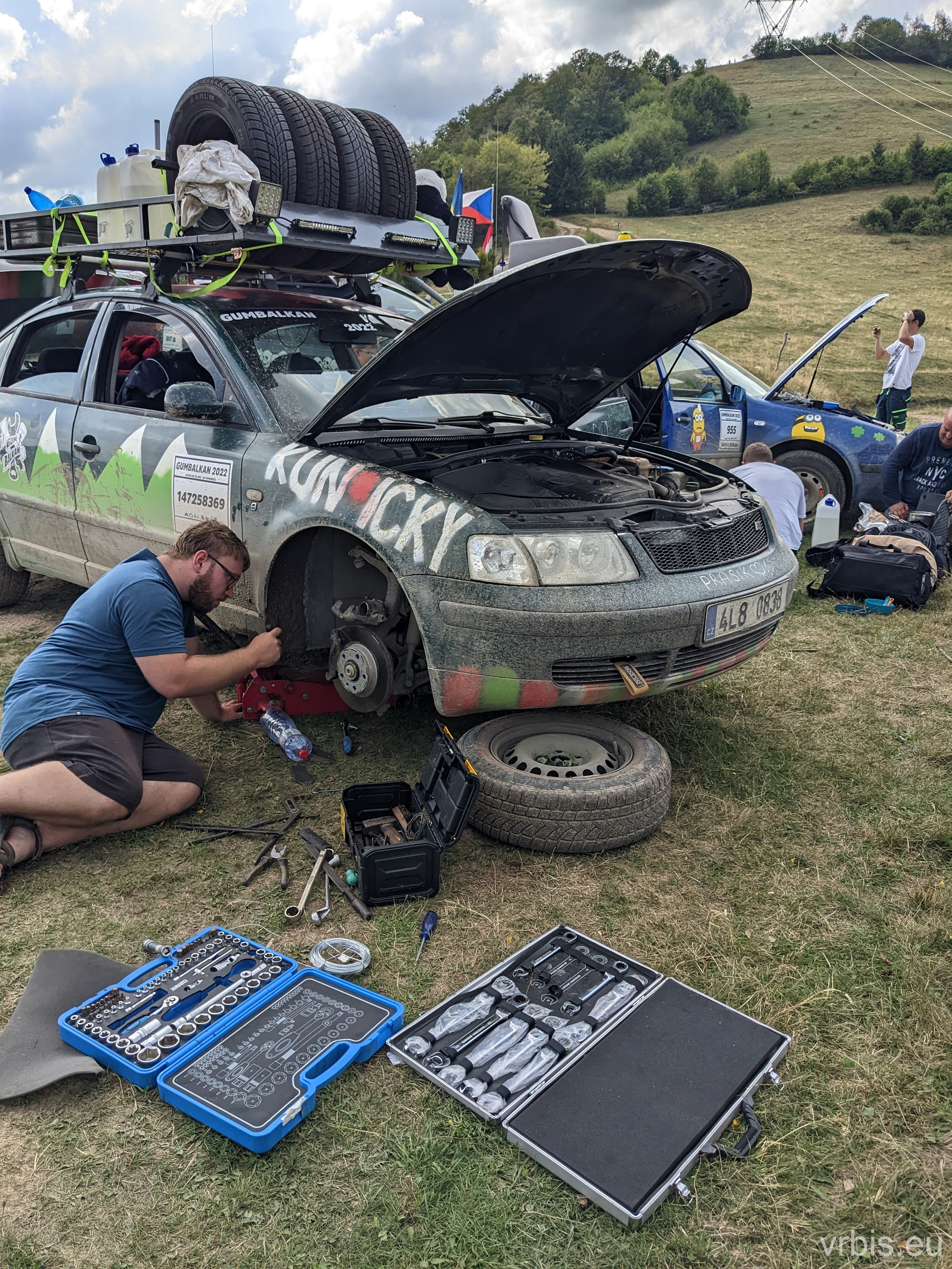Brodíme přes řeky, bláto nám od kol lítá až na střechu. Dokonce i Karel už přestal nadávat a Mimoň stíhá tempo. Jak tak jedeme, tak poslouchám, že mi něco mlátí na přední nápravě. Mám obavy co to může být, teď když jsme na cestách kvůli kterým jsem sem jeli, nechci abych pro nějakou poruchu nemohl pokračovat. Na dalším bodě zvedám auto a sundávám kolo. Hned vidím, kde je problém a padá mi kámen ze srdce. Jen „vyskočil“ stabilizátor z uložení, oprava zabrala jen pár minut a můžeme jet dál! 🙂