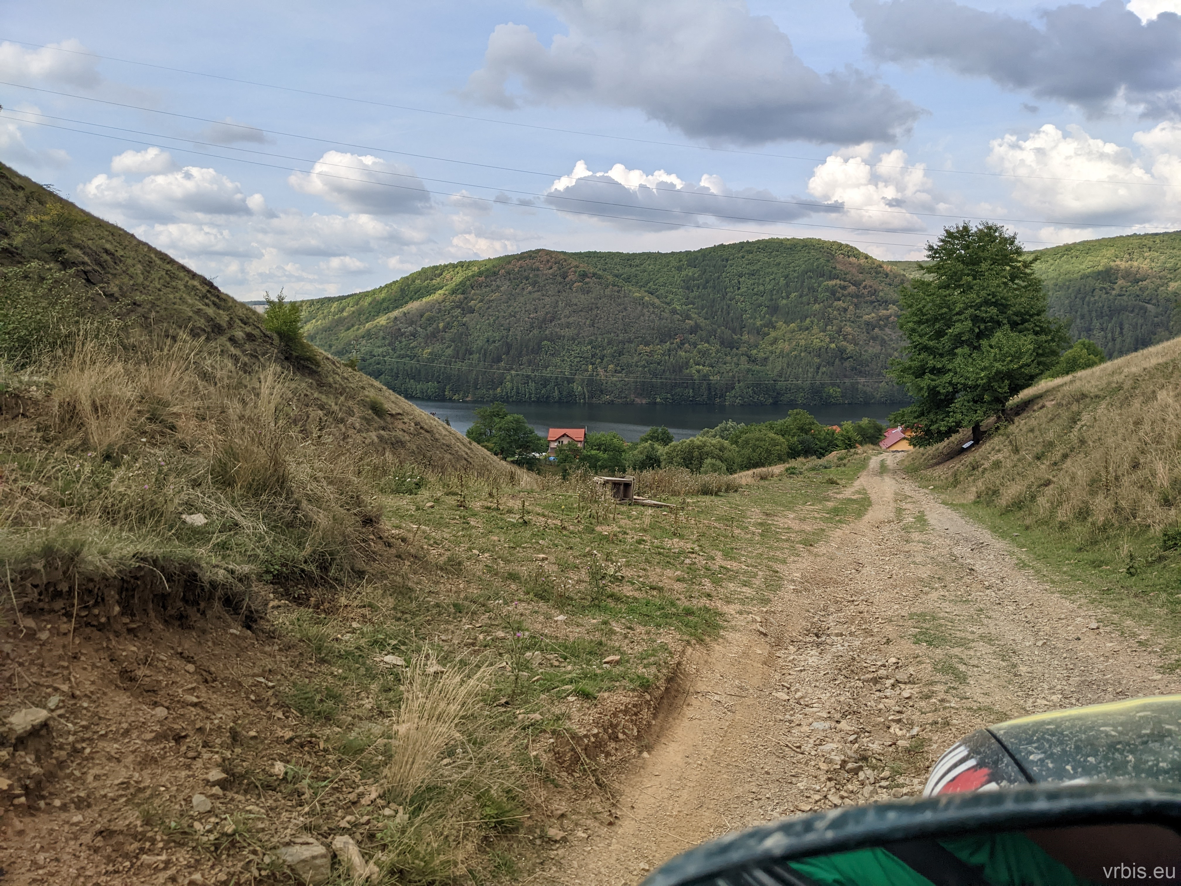 Jeden z těch dumperů vyjel z poza stromu. Uhýbáme na stranu, řidič na nás nechápavě kouká, ale vše prochází. Jedeme dál a potkávám ještě asi dva takové, vše probíhá v poklidu. Když tu přijíždíme na konec cesty. Před námi je obrovská hromada kamení, ale v mapě je tu cesta. To není možný, někudy ty dumpery jezdit musí. Jedu se podívat na opačnou stranu než ukazuje mapa. A to se vyplácí, je tu cesta nahoru. Vyjíždíme po ní a hned to vše začíná dávat smysl. Jsme na nové hrázy přehrady, která je právě ve výstavbě. Dále se napojujeme na původní klikatou cestu vedoucí okolo přehrady a po několika kilometrech dojíždíme do cíle. Zde nacházíme několik domů až po střechu zatopených zářivě zelenou vodou.