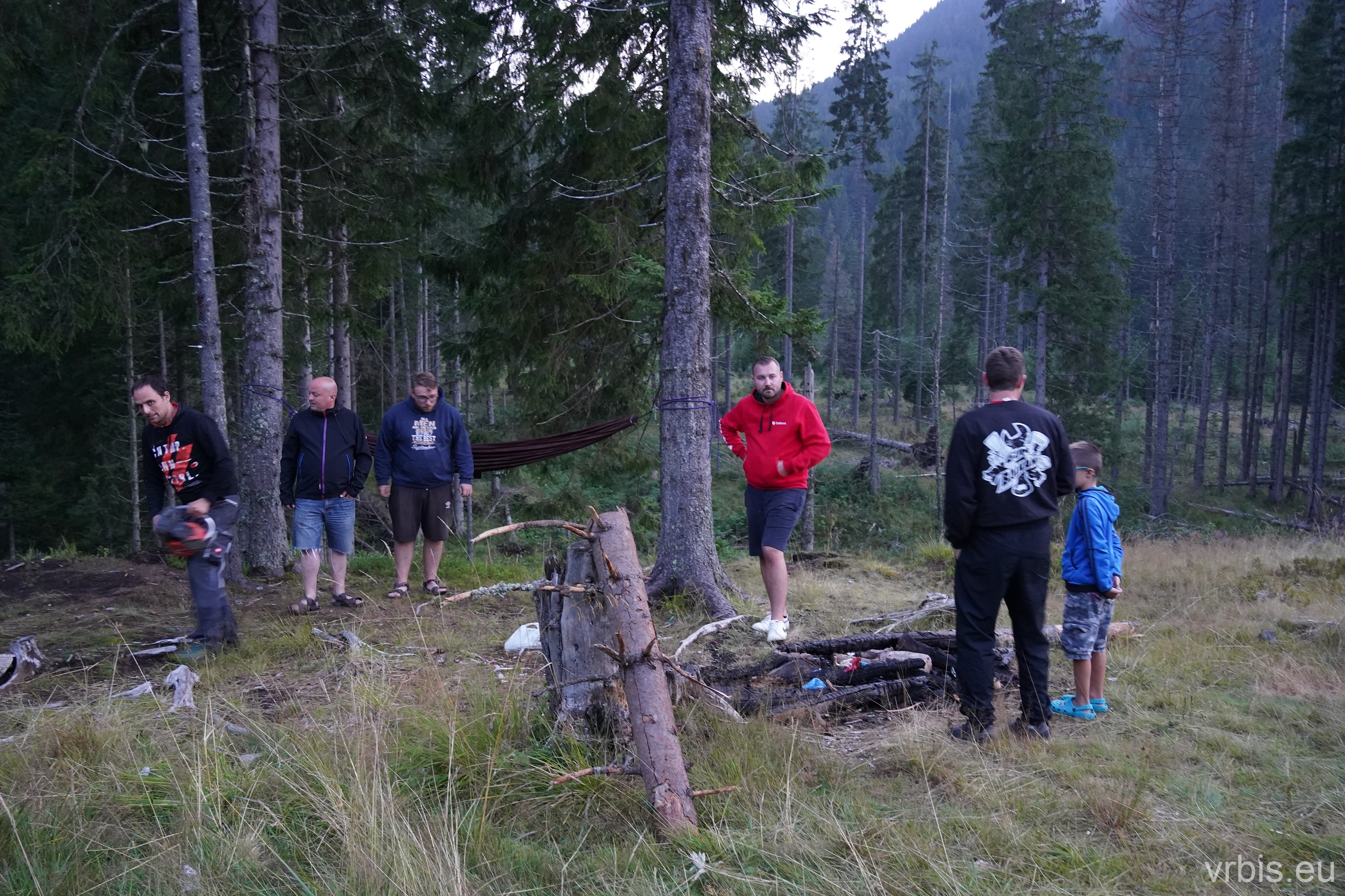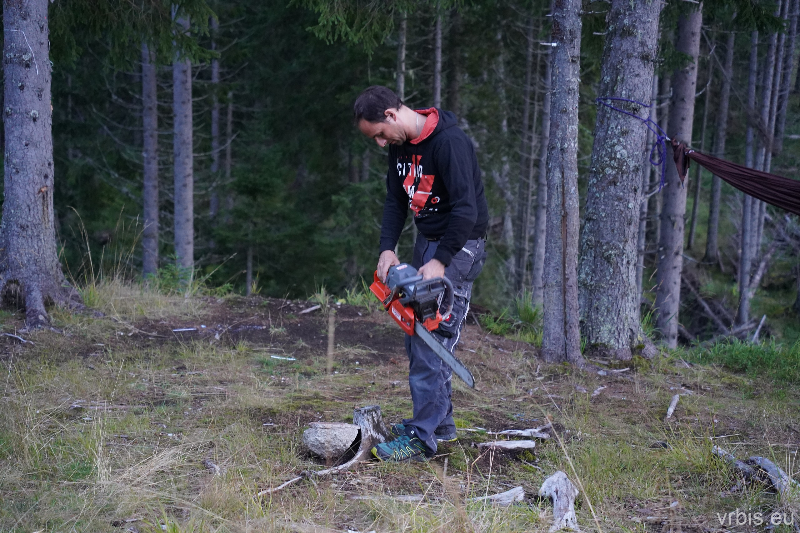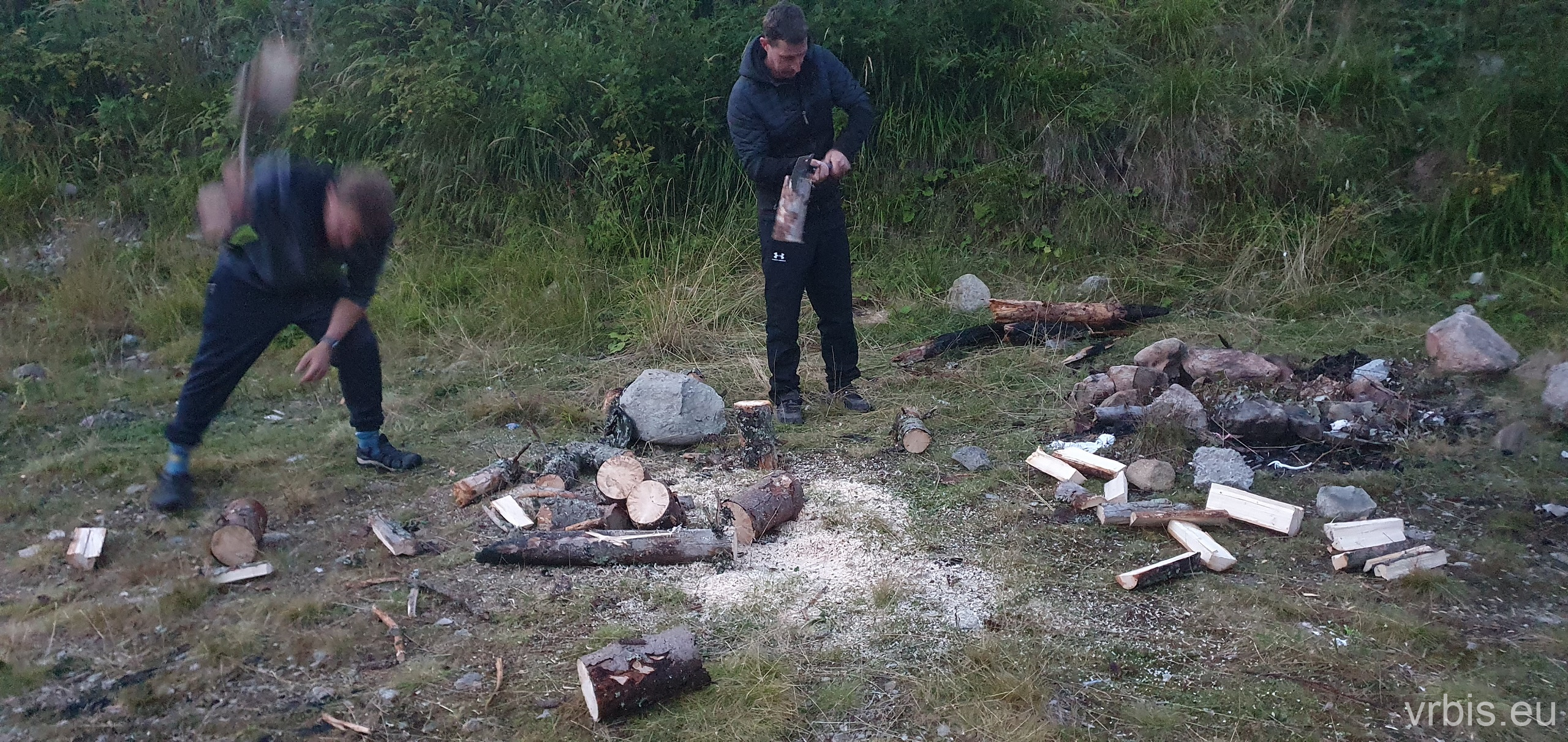 Dnešní večeři si ugrilujeme. Místo jsme vybírali účelně, ohniště už tu někdo vybudoval. Zbývá nachystat dřevo. Zde přichází ke slovu motorvá pila, kterou jsem bral pro případ, že by na cestě byly popadané stromy. To se zatím nestalo, ale svoji službu si muže odkroutit i takto. Během několika minut společné práce je dříví nařezané, nasekané a oheň už praská. Po večeři a několika pivká i tento den končí.