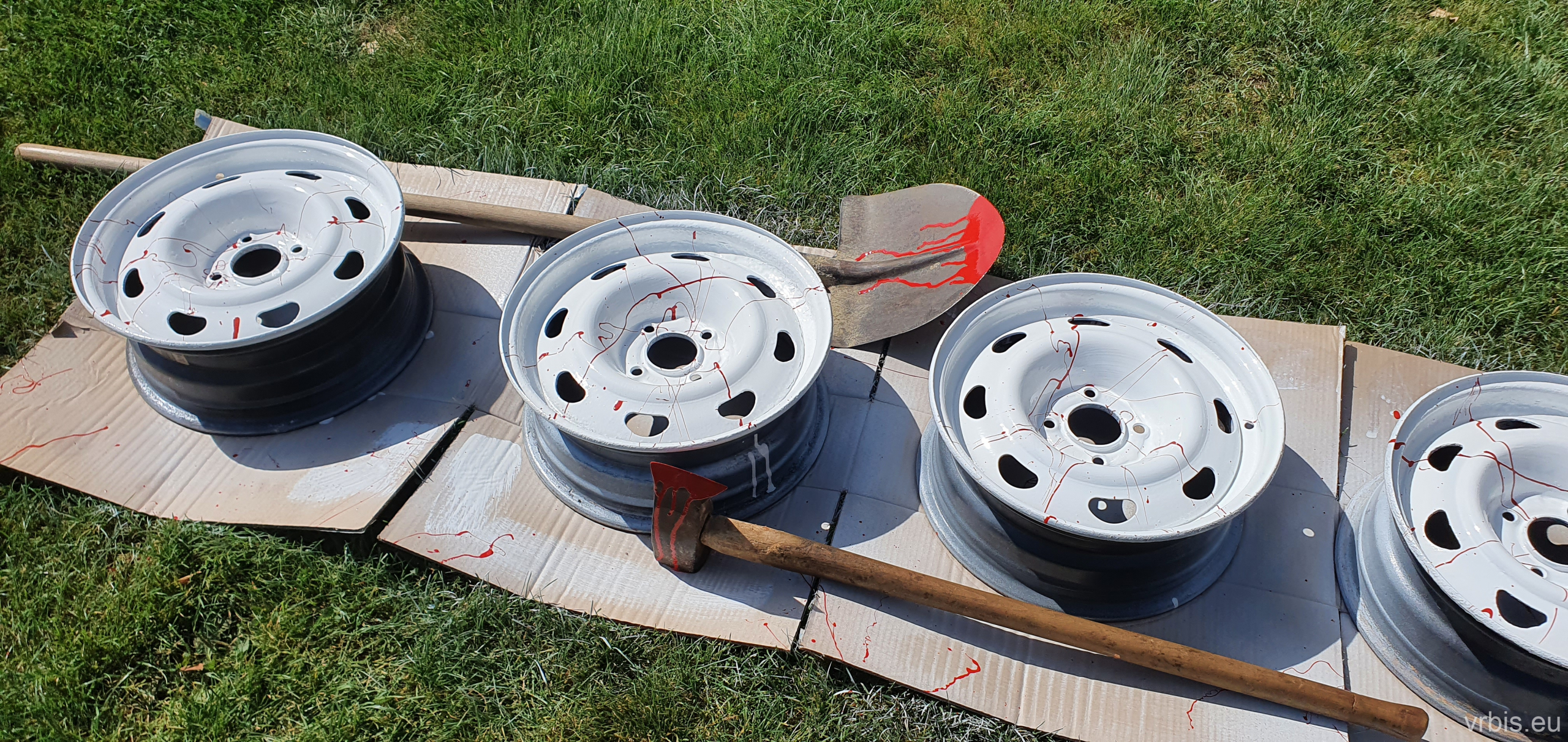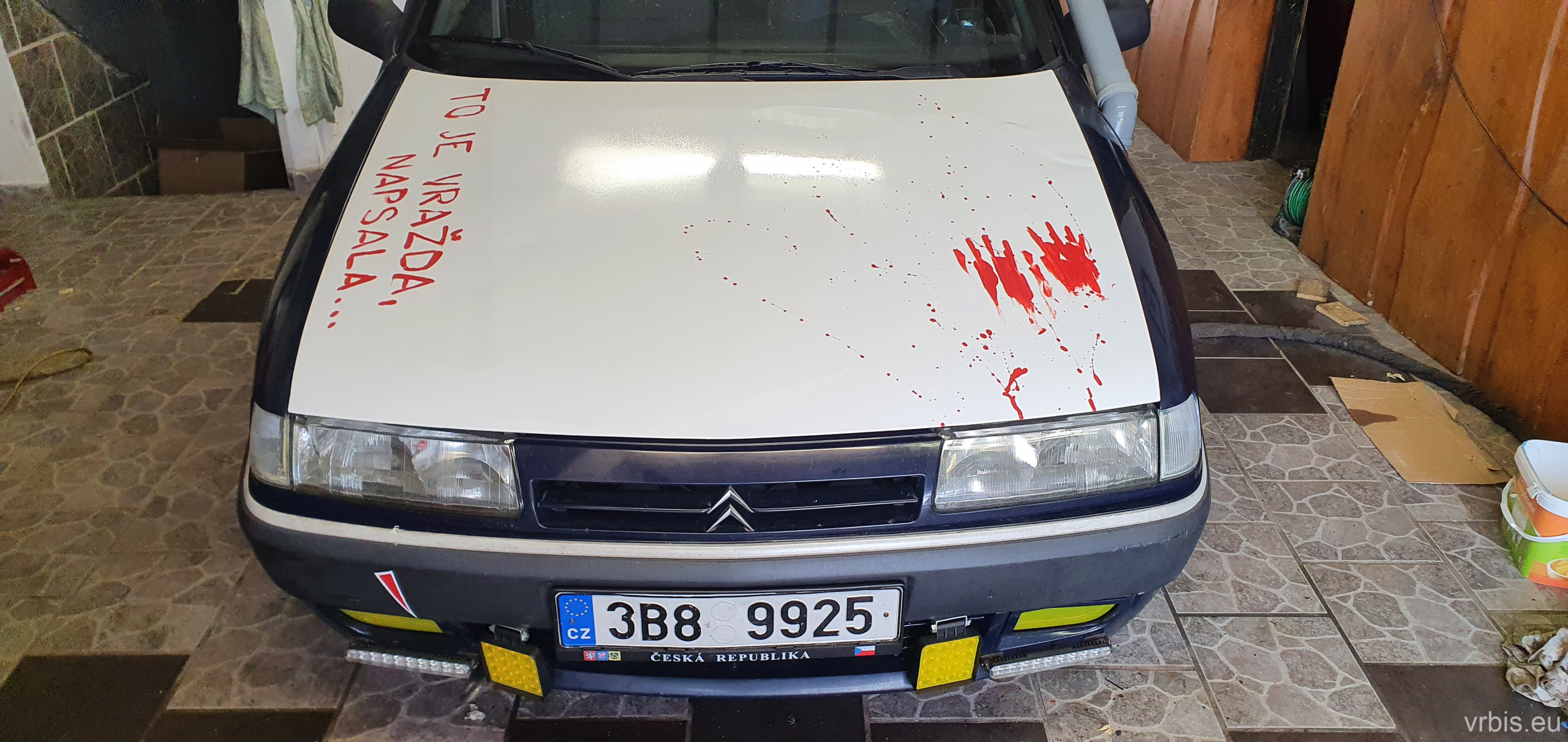 Krvavé nálepky na kapotě byly tak kvalitní, že za ty 4 měsíce byly modré namísto červené. Takže jsme je sundali, zbytky lepidla jsme chtěli umýt čističem na brzdy. No umyli jsme je, ale i s barvou… 😀 Inu kvalita z Amazonu… Takže se kapota znovu obrousila a dostala nový lak. Jelikož už jsme ale neměli nové nálpky, tak jsme si museli pomoct jinak, ale výsledek je nakonec o dost lepší. Obětí se stal 7-letý synovec 😀