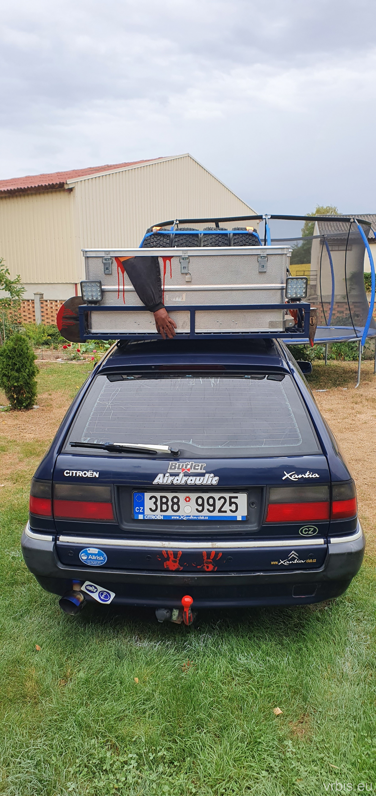 Když jsem borcům poslal fotky jak se vyvýjejí přípravy, dostal jsem odpověď „Ještě by to chtělo mrtvolu v pytli na střechu“. To bych nebyl já, abych to nevzal jako výzvu – „Chalenge accepted“. Zbývalo už jen pár hodiny do odjezdu a když garáží procházela švagrová, hned jsem ji sdělil své plány a výsledek na sebe nenechal dlouho čekat. Její jedna rukavice (druhou prý bohužel ztratila…) a rukáv z mích starých montérek vytvvořili to co ještě scházelo.