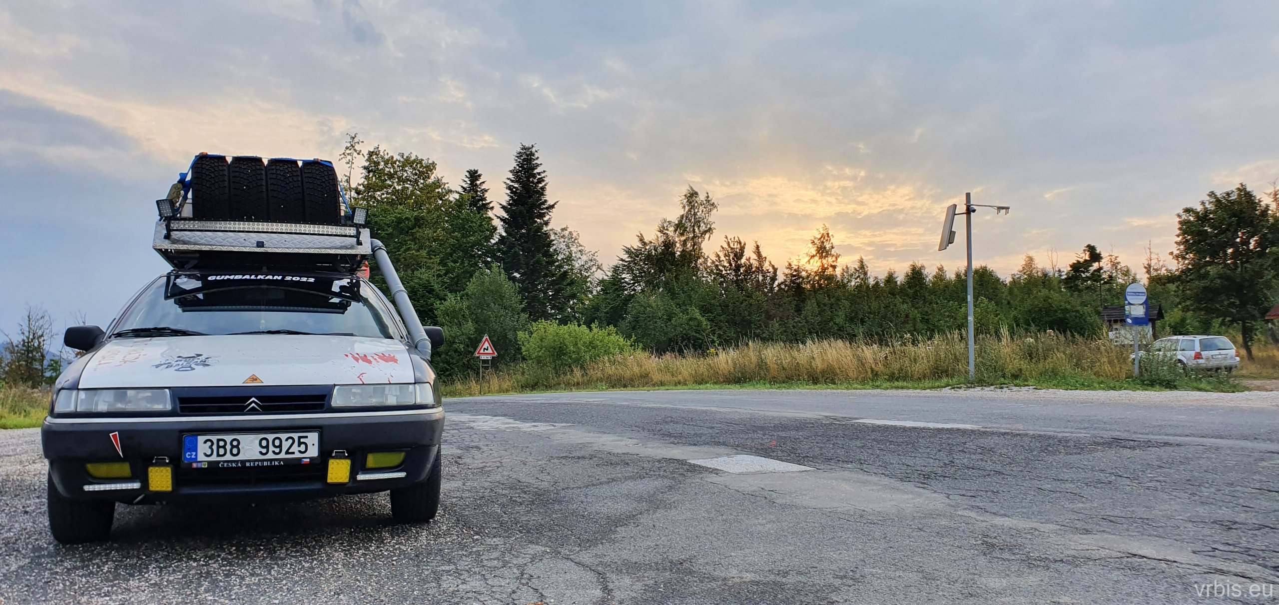 Na jednom úseku jsme potkali zoufale stopující místní houbaře. Jejich auto nevypadalo být zcela v pořádku, zastavil jsem s myšlenkou pomoci. Rukama nohama mi vysvětlil, že potřebují kladivo. Zahrabal jsem v nářadí a vytáhl menší kladivo a podal ho Rumunovi. V naději, že budu moci pomoc jsem ho následoval k auto. Jeden z jeho kolegů se právě snažil dostat hevér pod auto, které leželo takříkajíc na pupku. Zhodnotil jsem situaci, co se asi stalo a jak můžeme pomoci. Auto mělo vytržené kolo i s poloosou z převodovky, vyhozený spodní čep a kolo bylo vytočené do pravého úholu vůči směru jízdy. V podstatě je to na odtahovku, oprava na místě zabere hodně času a ten my nemáme. Bylo jich asi šest a očividně si vědí poradit sami. Rozhodl jsem se jim kladivo věnovat a popřál jim hodně štěstí.