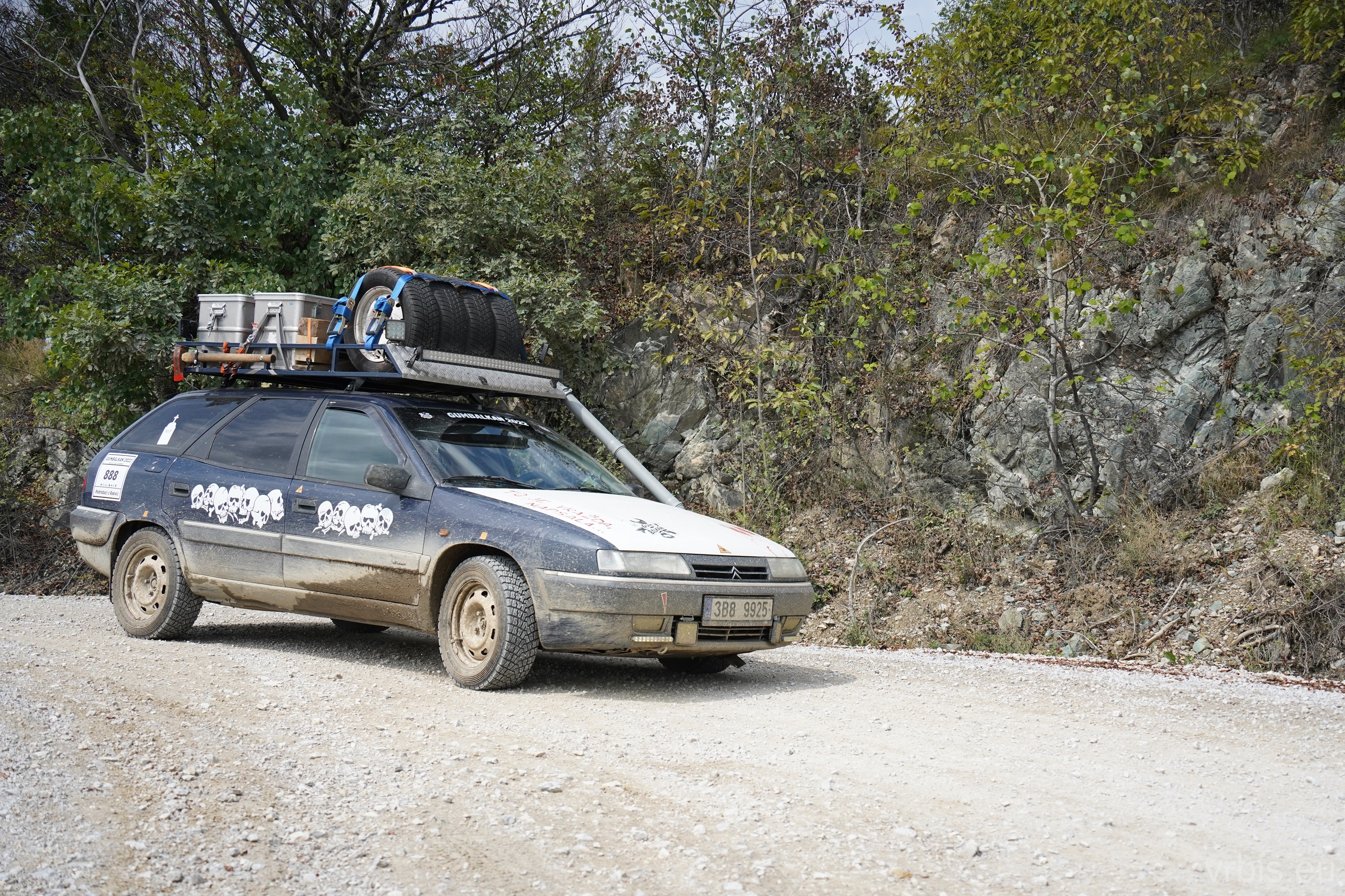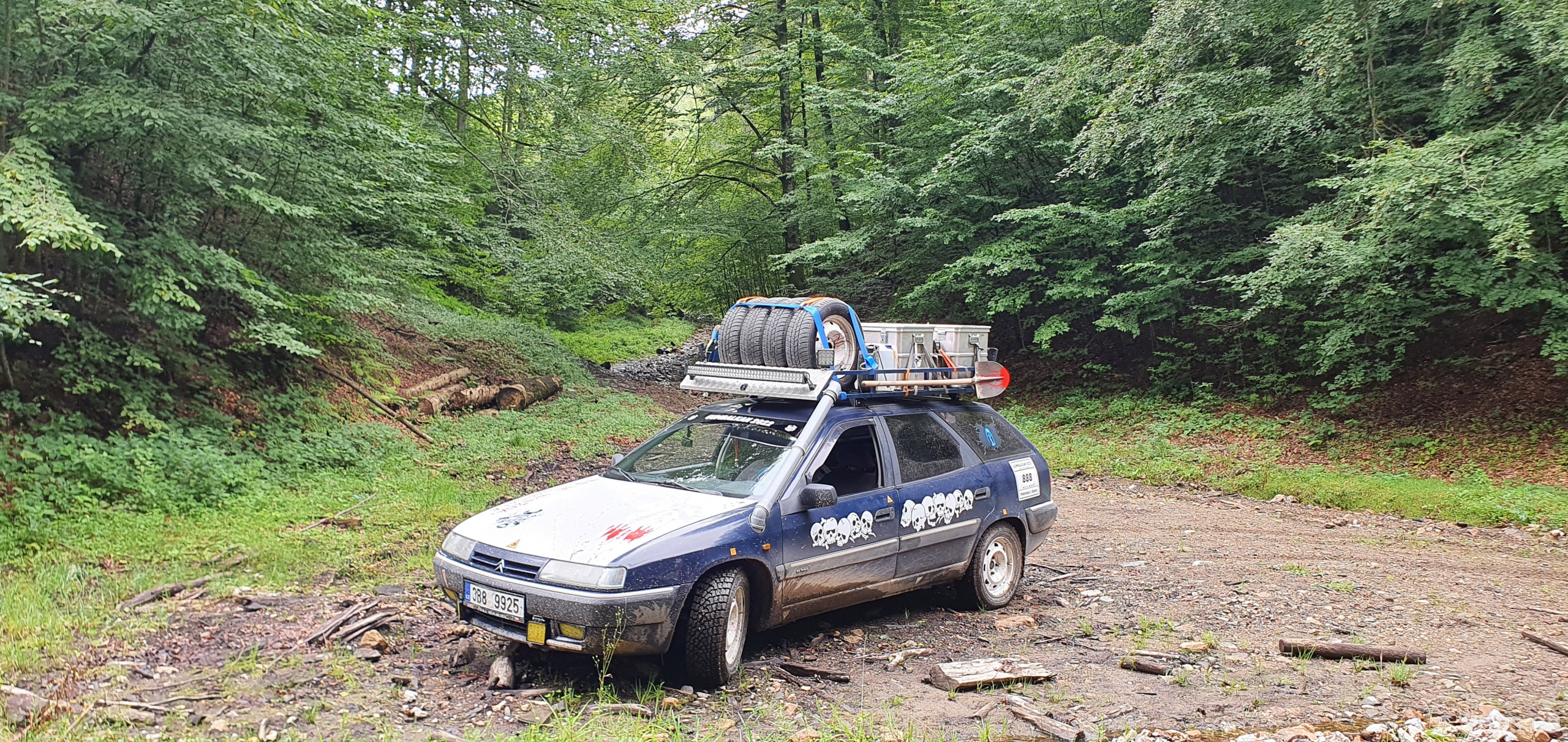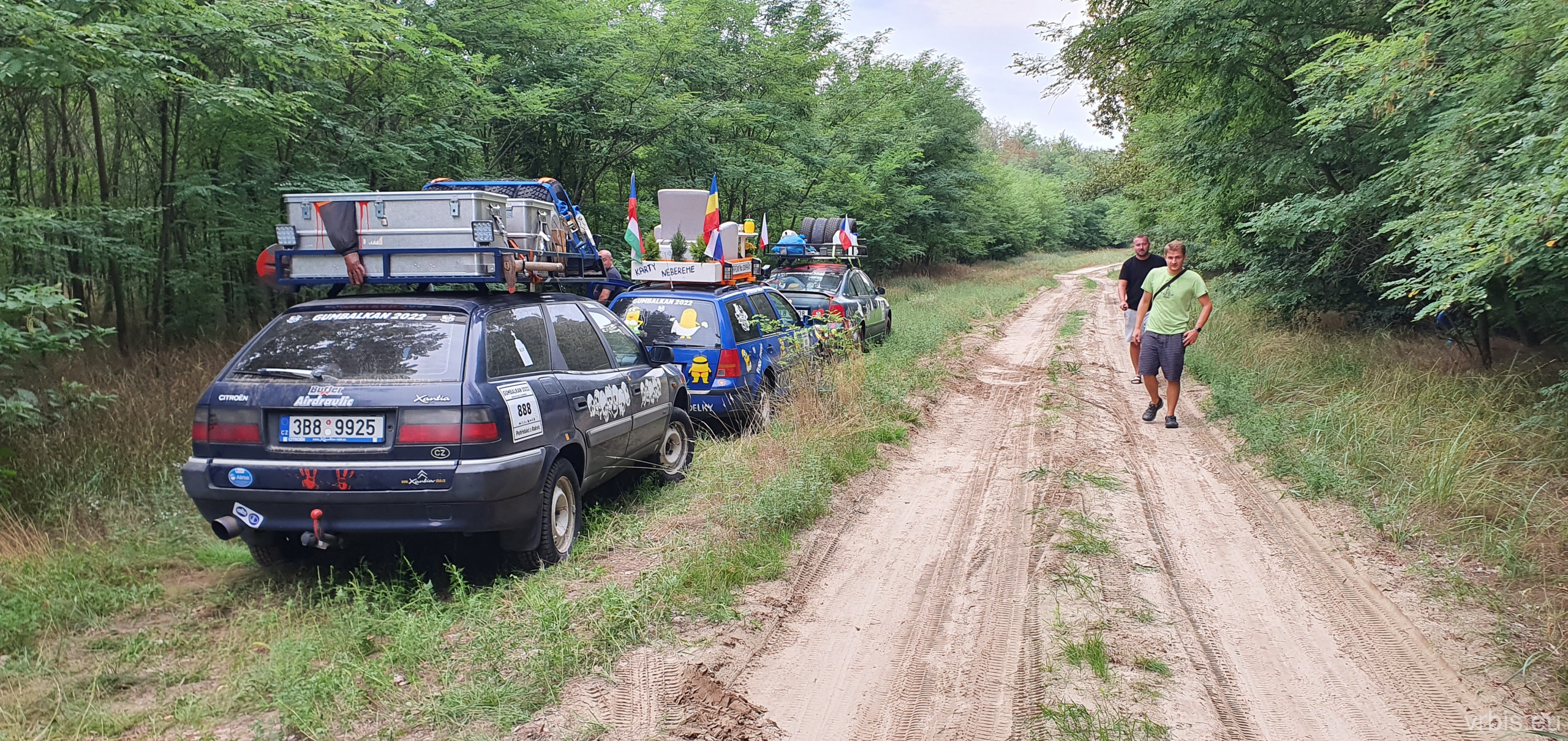 O několik kilometrů dále přichází jeden z nenáročnějších úseků dnešního dne. Vražda nemá v nízkých otáčkách skoro žádný výkon, zřejmně netlačí turbo nebo něco podobného. Prašná hlíněná lesní cesta je tak prudká, že se člověk po 10 krocích do kopce začíná zadýchávat. Můžu jet na jedničku a jen občas tam dostanu dvojku. Cesta je vymletá od vody, auta přejíždí hluboké výmoly po třech, někdy jen po dvou kolech. Jedu jako třetí, předem mnou je Mimoň a vpředu jede Prašík, který nečekaně zastavuje. To neměl dělat! Mimoň se už nezvládá rozjet. Michal, Dominik a Honza ho musejí roztláčet, ale zvládl to a jede. Do toho mi přijde na okýko zaklepat řidič Felicie za mnou. S prosbou „ať proboha nezastavujeme, že se pak nemůže rozjet!“ Ujišťuju ho, že mám úplně stejný poroblém. Se závanem připálené spojky se taky rozjíždím, kluci na mě mávají ať je předjedu, přidávám plyn a vrážím tam dvojku! 😀