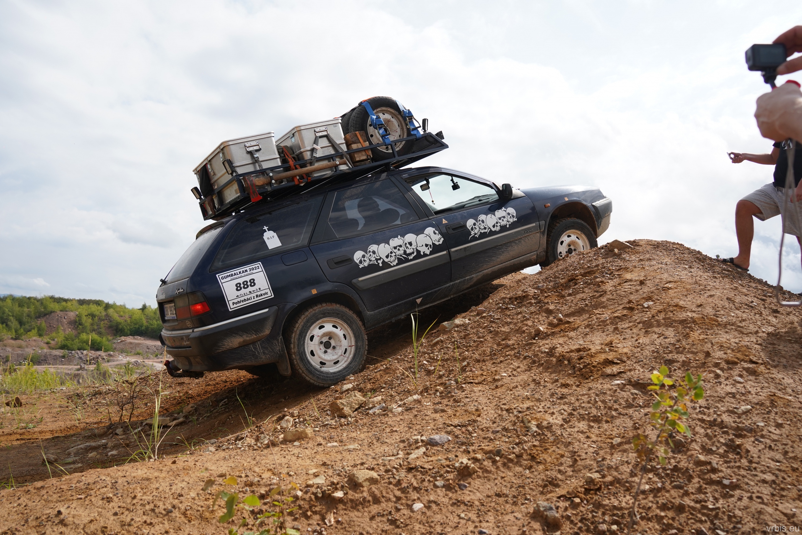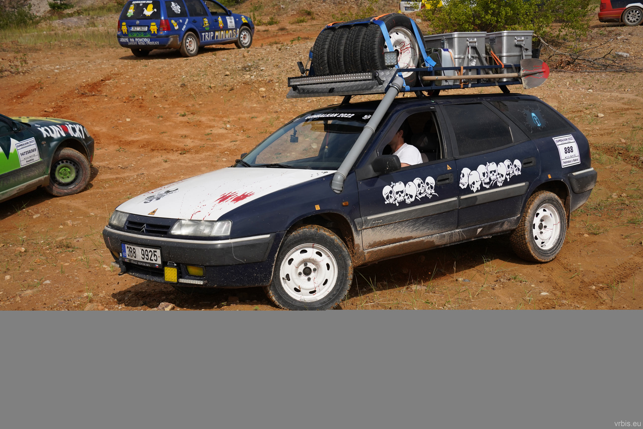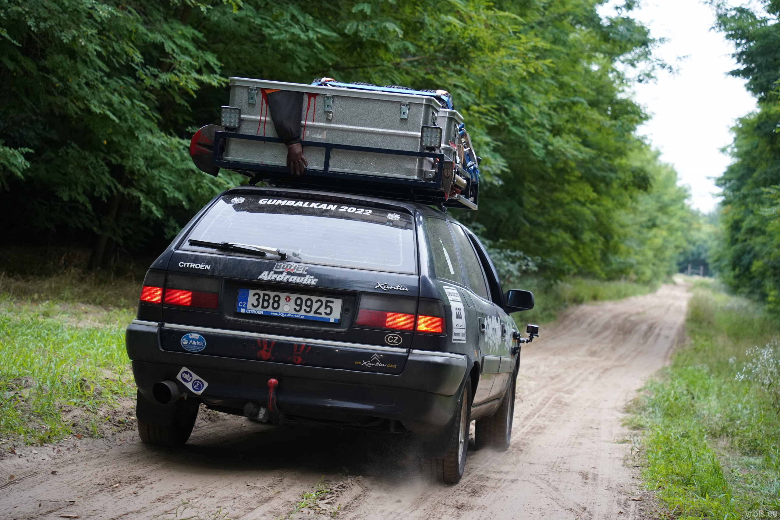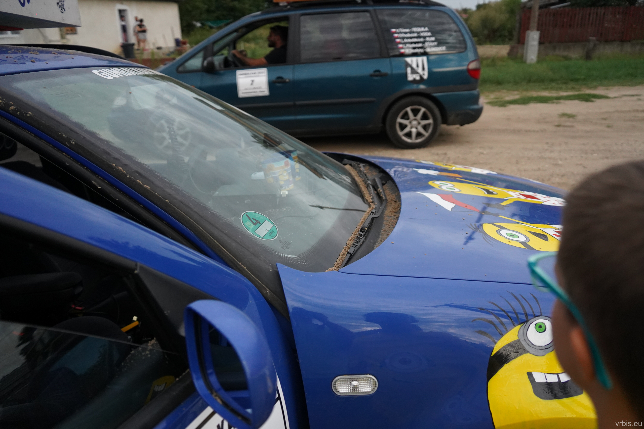 O několik kilometrů dále přichází jeden z nenáročnějších úseků dnešního dne. Vražda nemá v nízkých otáčkách skoro žádný výkon, zřejmně netlačí turbo nebo něco podobného. Prašná hlíněná lesní cesta je tak prudká, že se člověk po 10 krocích do kopce začíná zadýchávat. Můžu jet na jedničku a jen občas tam dostanu dvojku. Cesta je vymletá od vody, auta přejíždí hluboké výmoly po třech, někdy jen po dvou kolech. Jedu jako třetí, předem mnou je Mimoň a vpředu jede Prašík, který nečekaně zastavuje. To neměl dělat! Mimoň se už nezvládá rozjet. Michal, Dominik a Honza ho musejí roztláčet, ale zvládl to a jede. Do toho mi přijde na okýko zaklepat řidič Felicie za mnou. S prosbou „ať proboha nezastavujeme, že se pak nemůže rozjet!“ Ujišťuju ho, že mám úplně stejný poroblém. Se závanem připálené spojky se taky rozjíždím, kluci na mě mávají ať je předjedu, přidávám plyn a vrážím tam dvojku! 😀