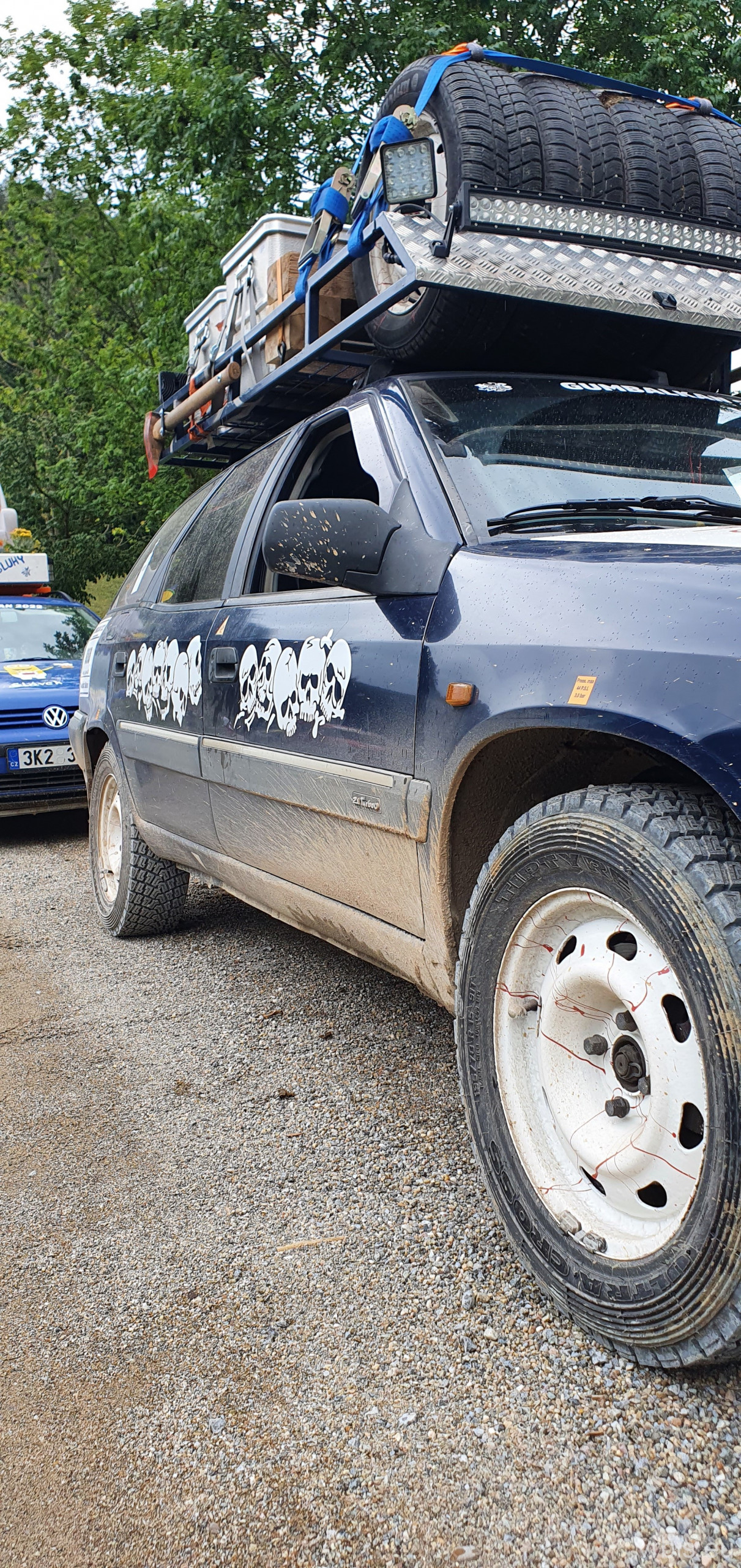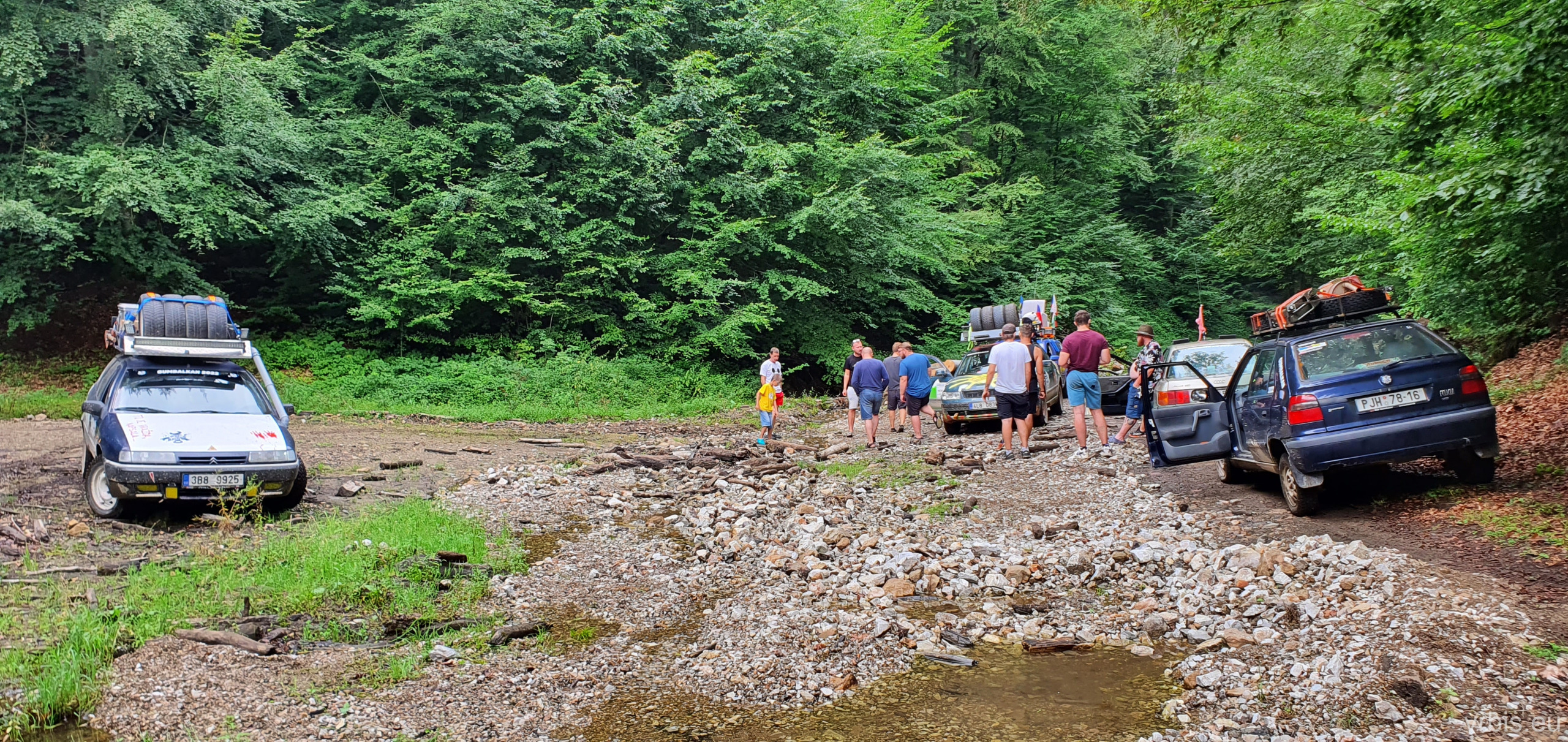 Po obědě a opravě pokračujeme lesní cestou dál. Vše se nese v poklidném duchu až do místa kde se cesta začíná svažovat z kopce. Je to opak toho co jsme předtím jeli nahoru, jen v horším stavu. Cesta jsou vlastně jen dvě rýhy vymleté od vody a traktoru, které jsou tak hluboké, že vjetí do nich by mohlo být osudné. S auty balancujeme na zbytcích původní cesty, je to jako jízda na kolejích. Volba správné stopy je klíčová. Michal se s Mimoněm vyhýbá výmolu a najíždí bokem auta na svah, tak že už to vypadlo že se převrátí na bok. Ale vše dobře dopadlo. Nejednou se auta při přejíždění mezi výmoly pohupují jen na dvou kolech. Když se dostáváme dolů, potkáváme několik dalších posádek, které si tuhle cestu vybrali směrem nahoru. Nezbývá něž jim popřát hodně štěstí. Težko říct, která z cest je horší… 😀