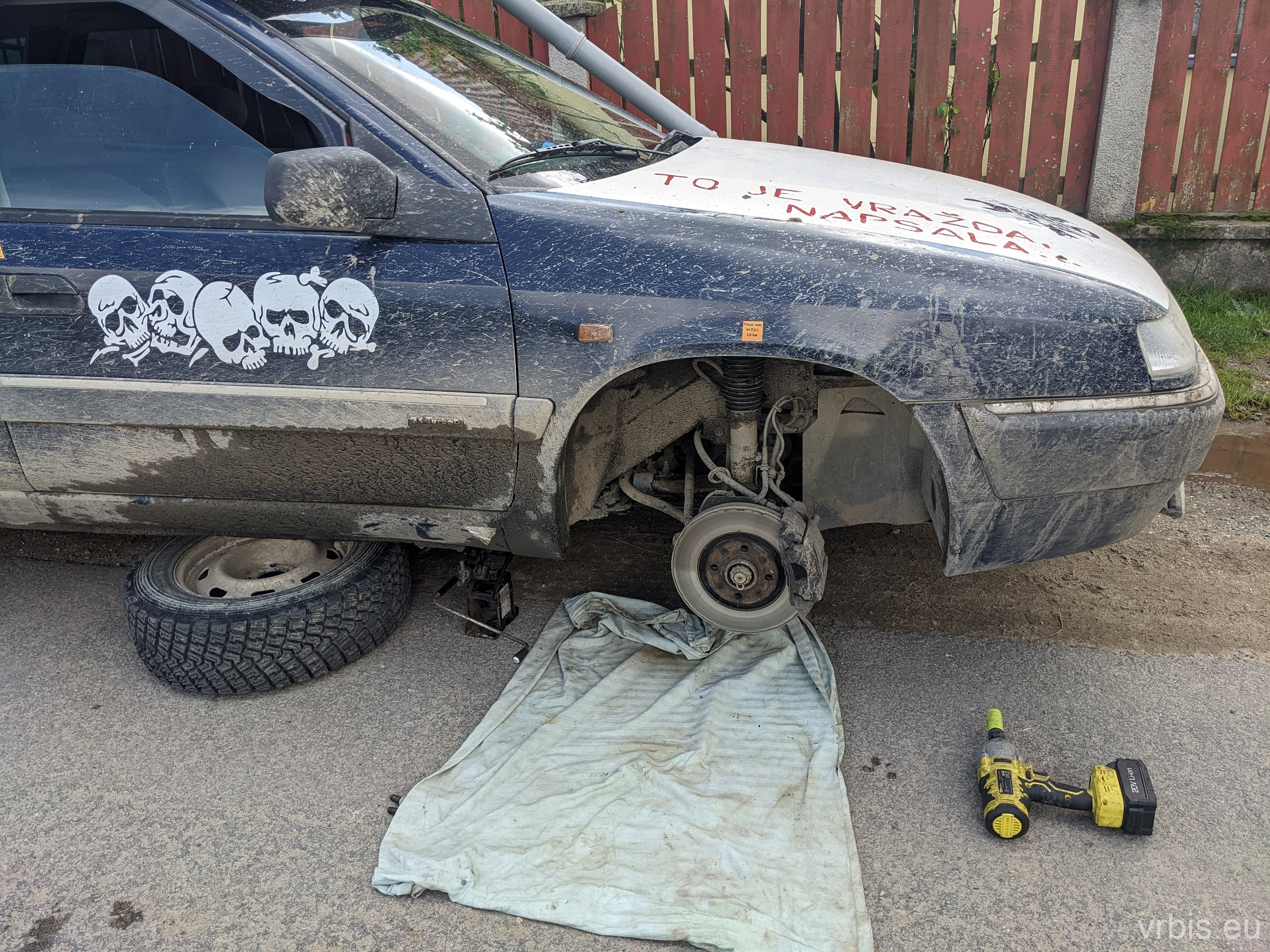 Brodíme přes řeky, bláto nám od kol lítá až na střechu. Dokonce i Karel už přestal nadávat a Mimoň stíhá tempo. Jak tak jedeme, tak poslouchám, že mi něco mlátí na přední nápravě. Mám obavy co to může být, teď když jsme na cestách kvůli kterým jsem sem jeli, nechci abych pro nějakou poruchu nemohl pokračovat. Na dalším bodě zvedám auto a sundávám kolo. Hned vidím, kde je problém a padá mi kámen ze srdce. Jen „vyskočil“ stabilizátor z uložení, oprava zabrala jen pár minut a můžeme jet dál! 🙂
