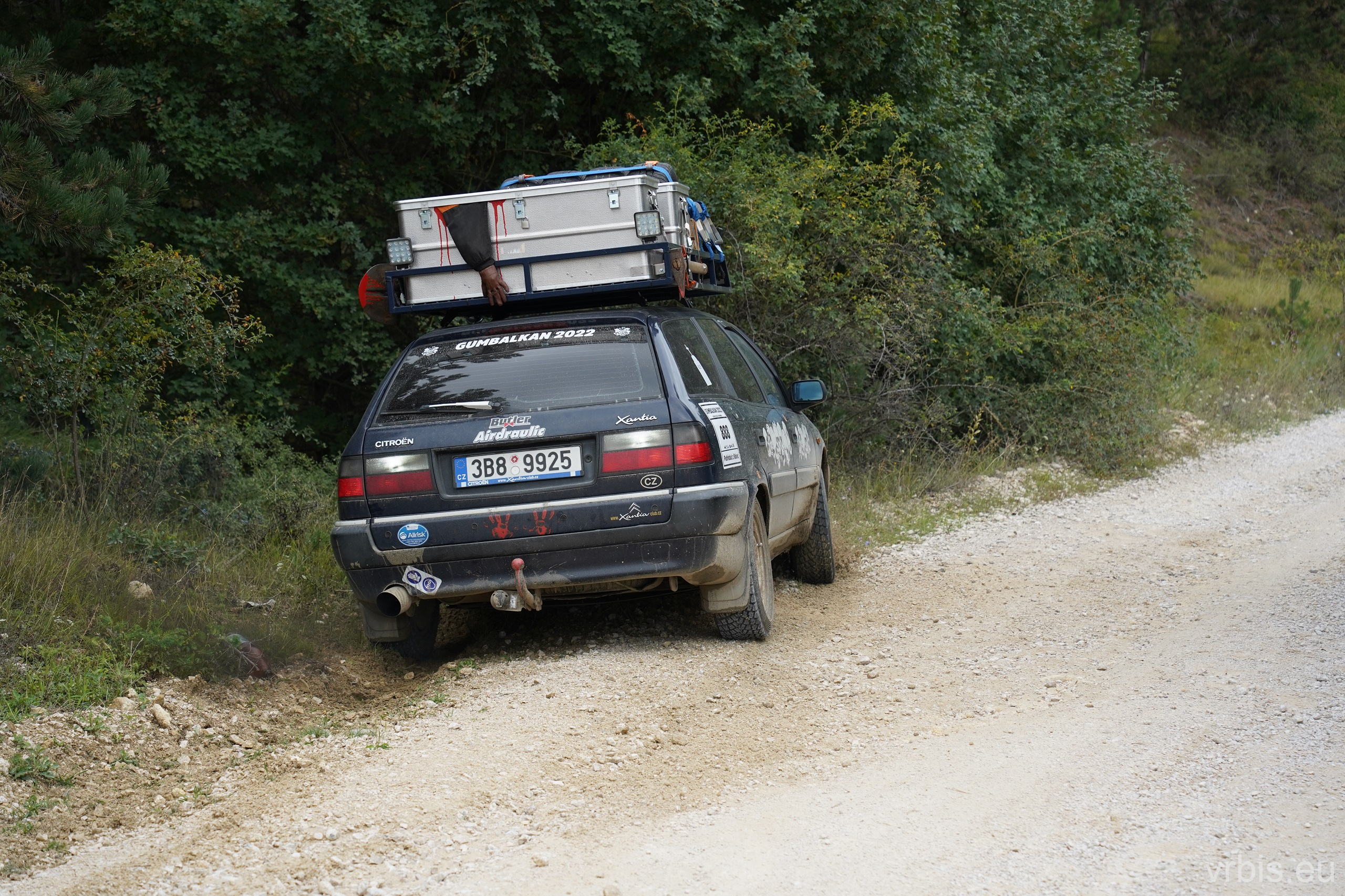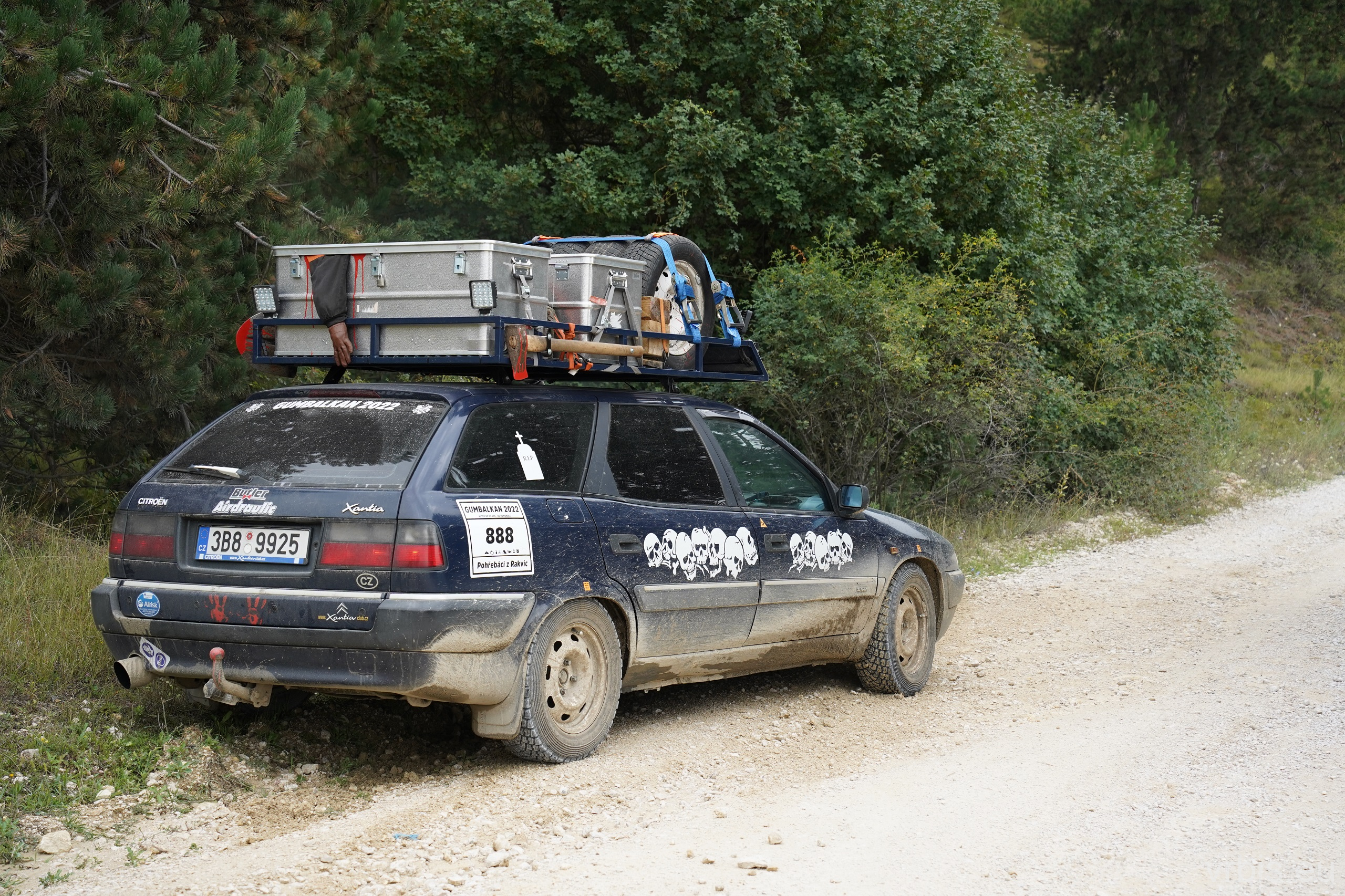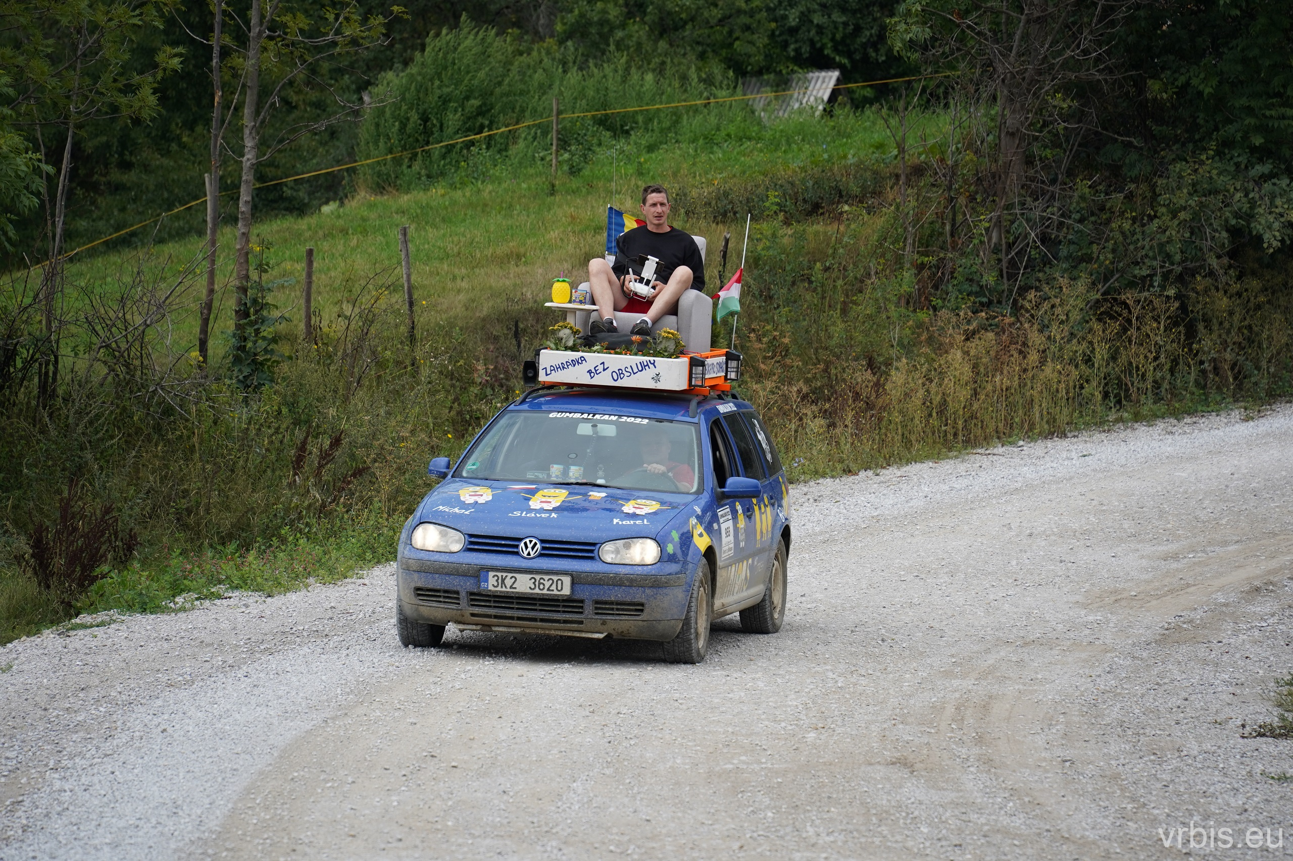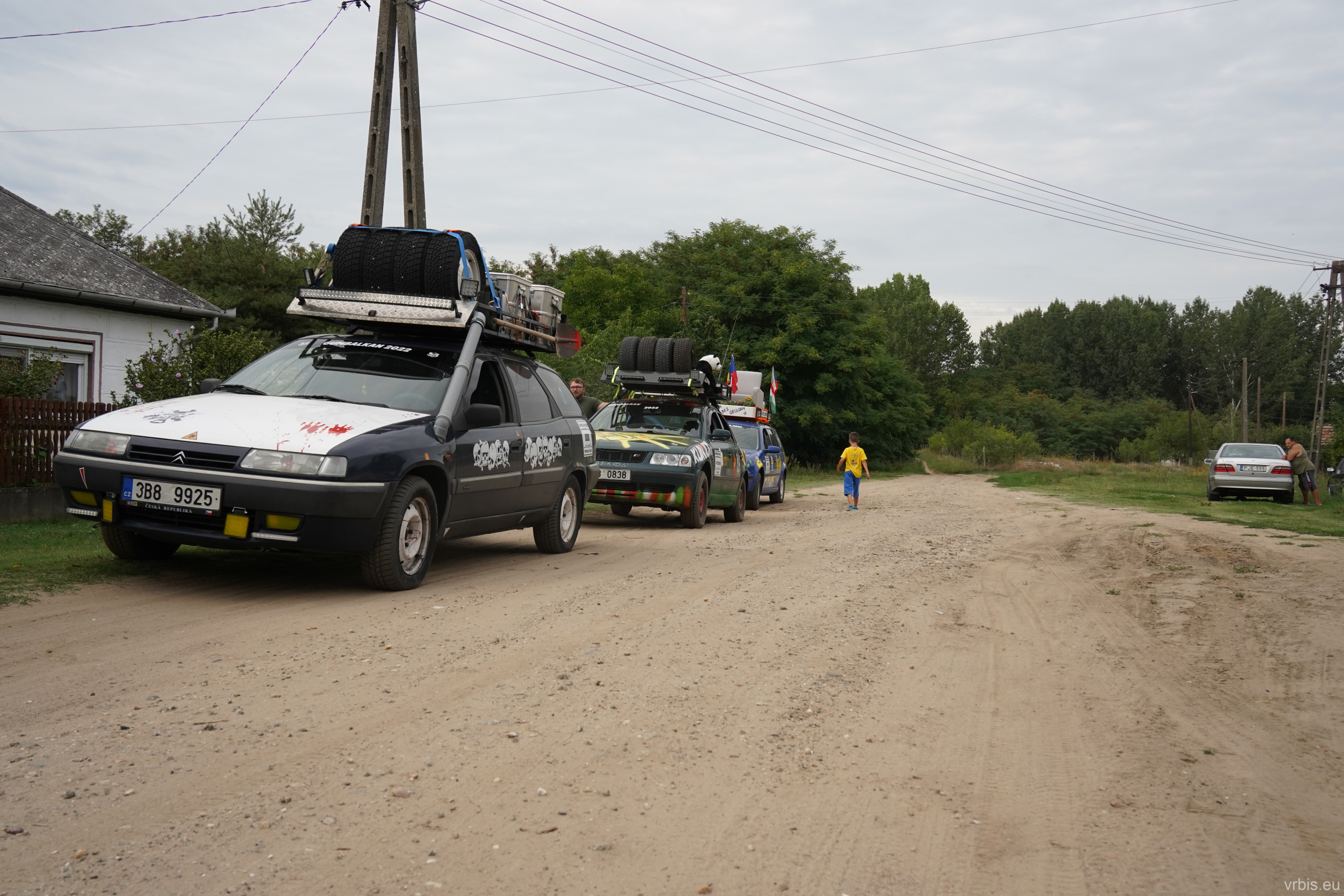 O několik kilometrů dále přichází jeden z nenáročnějších úseků dnešního dne. Vražda nemá v nízkých otáčkách skoro žádný výkon, zřejmně netlačí turbo nebo něco podobného. Prašná hlíněná lesní cesta je tak prudká, že se člověk po 10 krocích do kopce začíná zadýchávat. Můžu jet na jedničku a jen občas tam dostanu dvojku. Cesta je vymletá od vody, auta přejíždí hluboké výmoly po třech, někdy jen po dvou kolech. Jedu jako třetí, předem mnou je Mimoň a vpředu jede Prašík, který nečekaně zastavuje. To neměl dělat! Mimoň se už nezvládá rozjet. Michal, Dominik a Honza ho musejí roztláčet, ale zvládl to a jede. Do toho mi přijde na okýko zaklepat řidič Felicie za mnou. S prosbou „ať proboha nezastavujeme, že se pak nemůže rozjet!“ Ujišťuju ho, že mám úplně stejný poroblém. Se závanem připálené spojky se taky rozjíždím, kluci na mě mávají ať je předjedu, přidávám plyn a vrážím tam dvojku! 😀