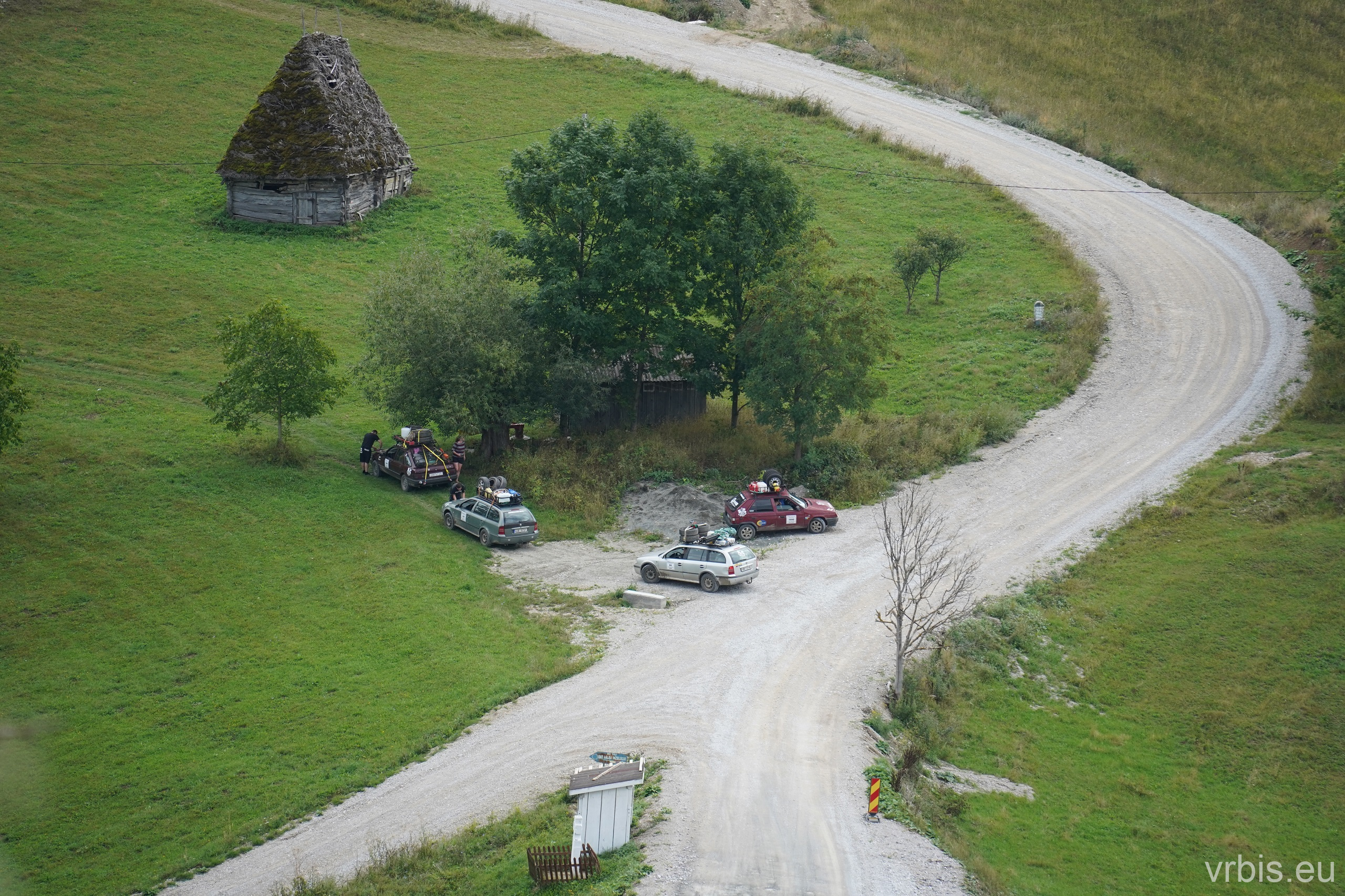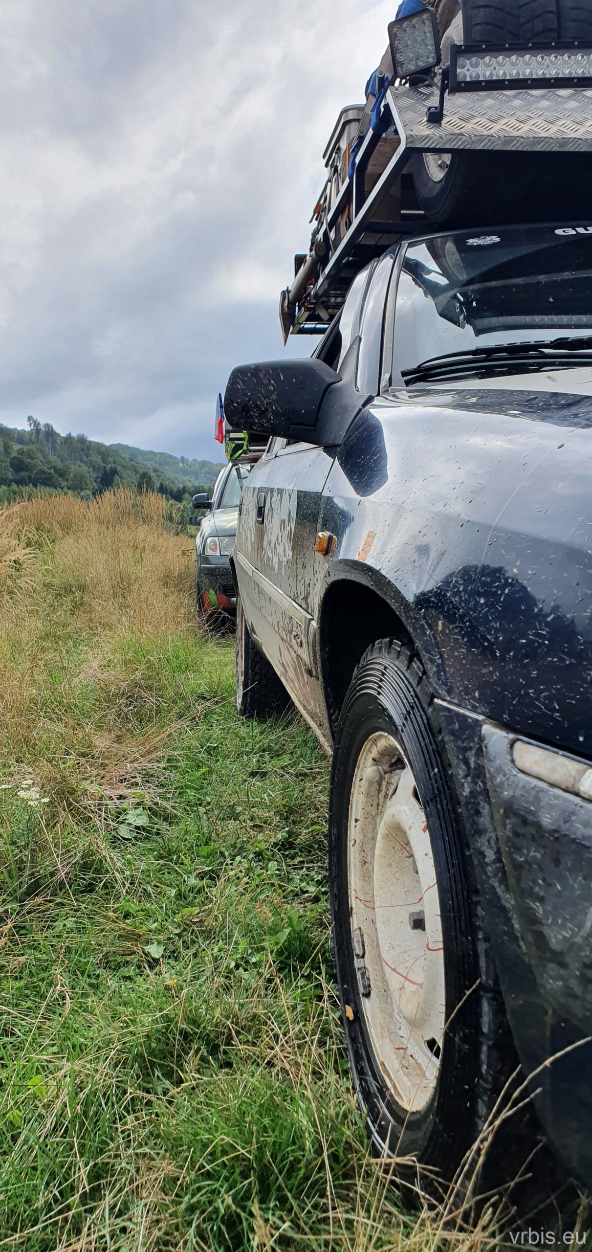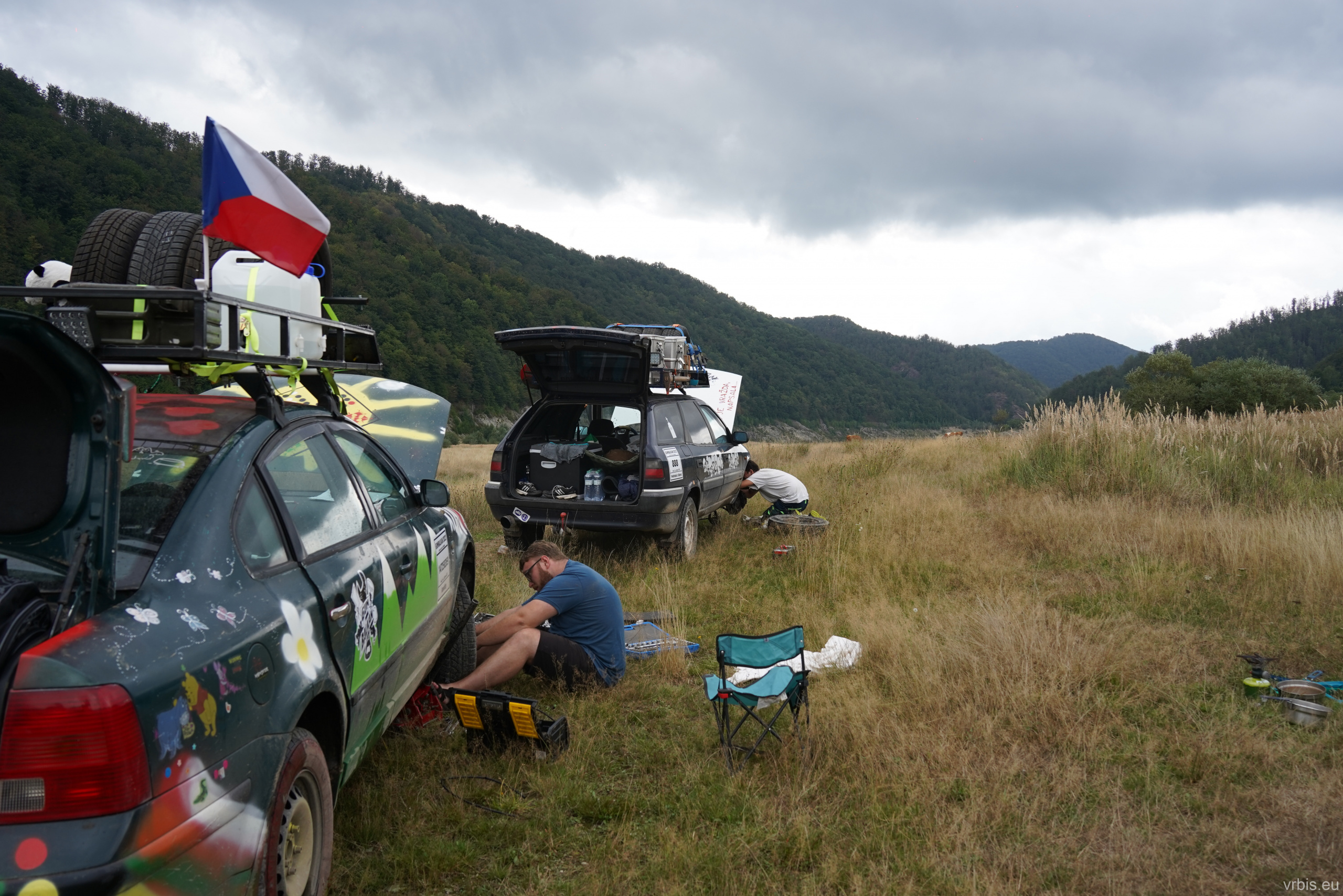 Po obědě a opravě pokračujeme lesní cestou dál. Vše se nese v poklidném duchu až do místa kde se cesta začíná svažovat z kopce. Je to opak toho co jsme předtím jeli nahoru, jen v horším stavu. Cesta jsou vlastně jen dvě rýhy vymleté od vody a traktoru, které jsou tak hluboké, že vjetí do nich by mohlo být osudné. S auty balancujeme na zbytcích původní cesty, je to jako jízda na kolejích. Volba správné stopy je klíčová. Michal se s Mimoněm vyhýbá výmolu a najíždí bokem auta na svah, tak že už to vypadlo že se převrátí na bok. Ale vše dobře dopadlo. Nejednou se auta při přejíždění mezi výmoly pohupují jen na dvou kolech. Když se dostáváme dolů, potkáváme několik dalších posádek, které si tuhle cestu vybrali směrem nahoru. Nezbývá něž jim popřát hodně štěstí. Težko říct, která z cest je horší… 😀