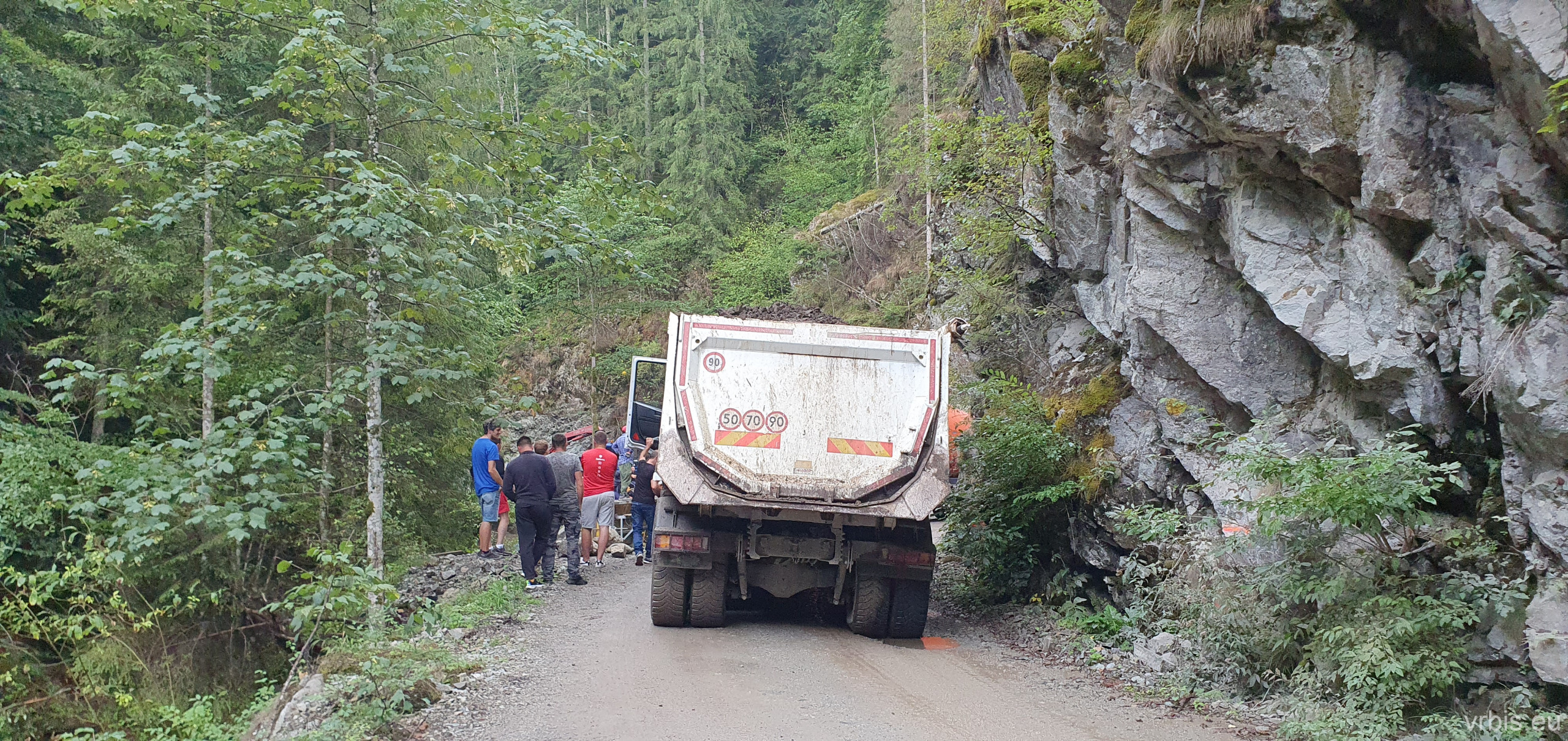 Na jednom úseku jsme potkali zoufale stopující místní houbaře. Jejich auto nevypadalo být zcela v pořádku, zastavil jsem s myšlenkou pomoci. Rukama nohama mi vysvětlil, že potřebují kladivo. Zahrabal jsem v nářadí a vytáhl menší kladivo a podal ho Rumunovi. V naději, že budu moci pomoc jsem ho následoval k auto. Jeden z jeho kolegů se právě snažil dostat hevér pod auto, které leželo takříkajíc na pupku. Zhodnotil jsem situaci, co se asi stalo a jak můžeme pomoci. Auto mělo vytržené kolo i s poloosou z převodovky, vyhozený spodní čep a kolo bylo vytočené do pravého úholu vůči směru jízdy. V podstatě je to na odtahovku, oprava na místě zabere hodně času a ten my nemáme. Bylo jich asi šest a očividně si vědí poradit sami. Rozhodl jsem se jim kladivo věnovat a popřál jim hodně štěstí.